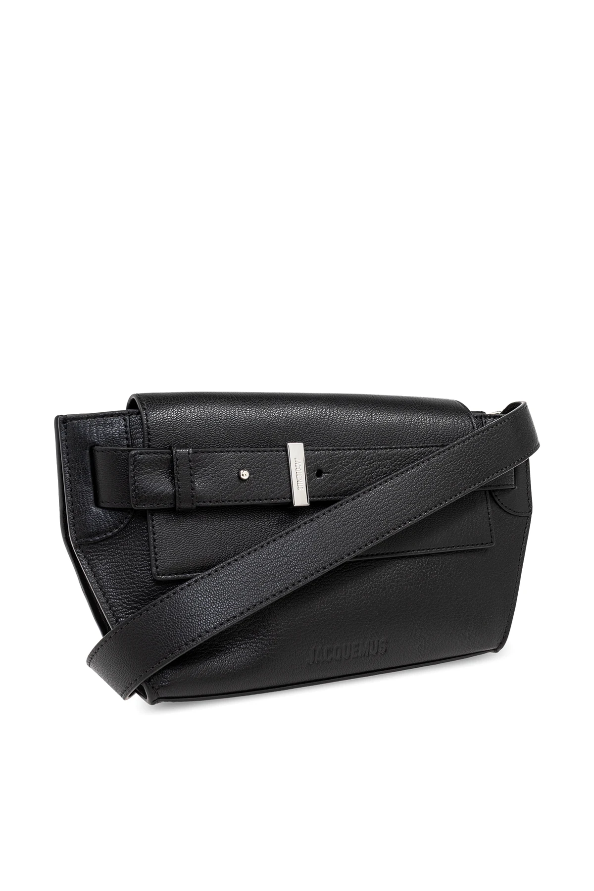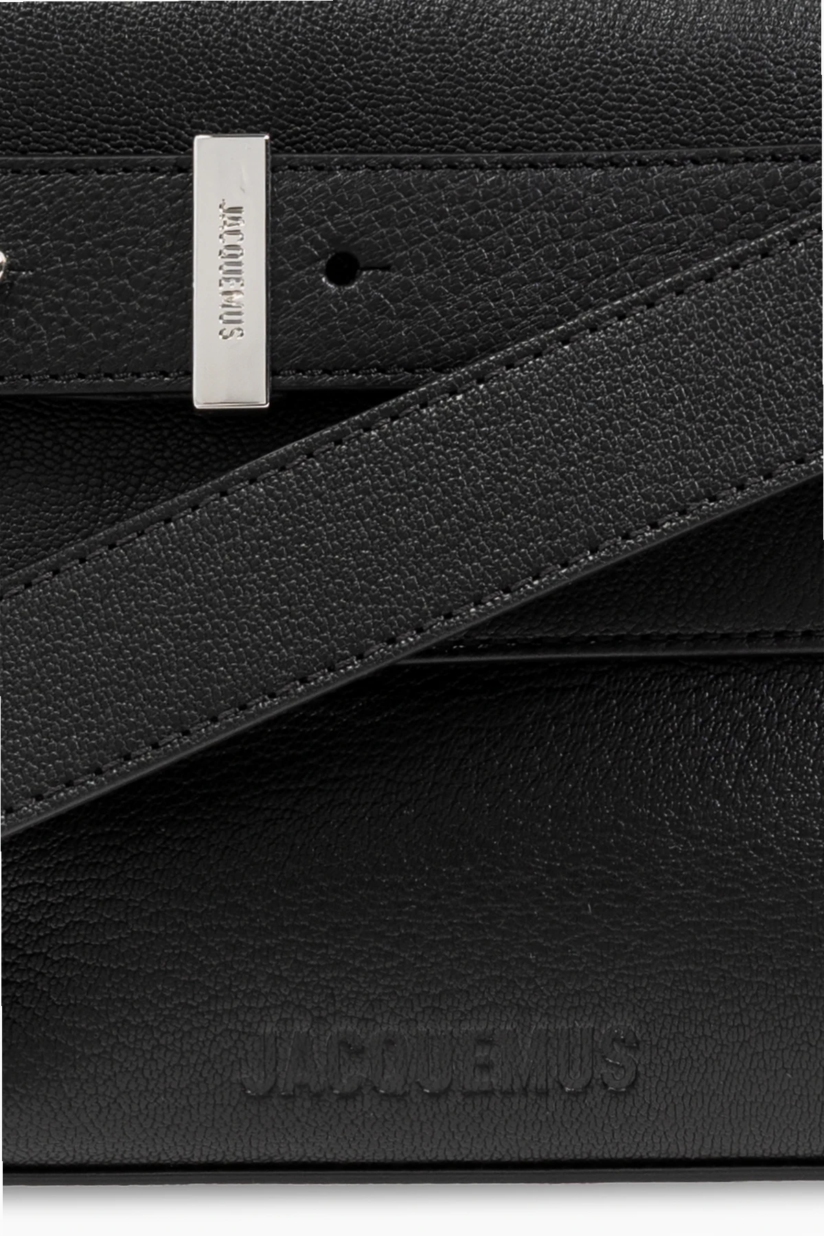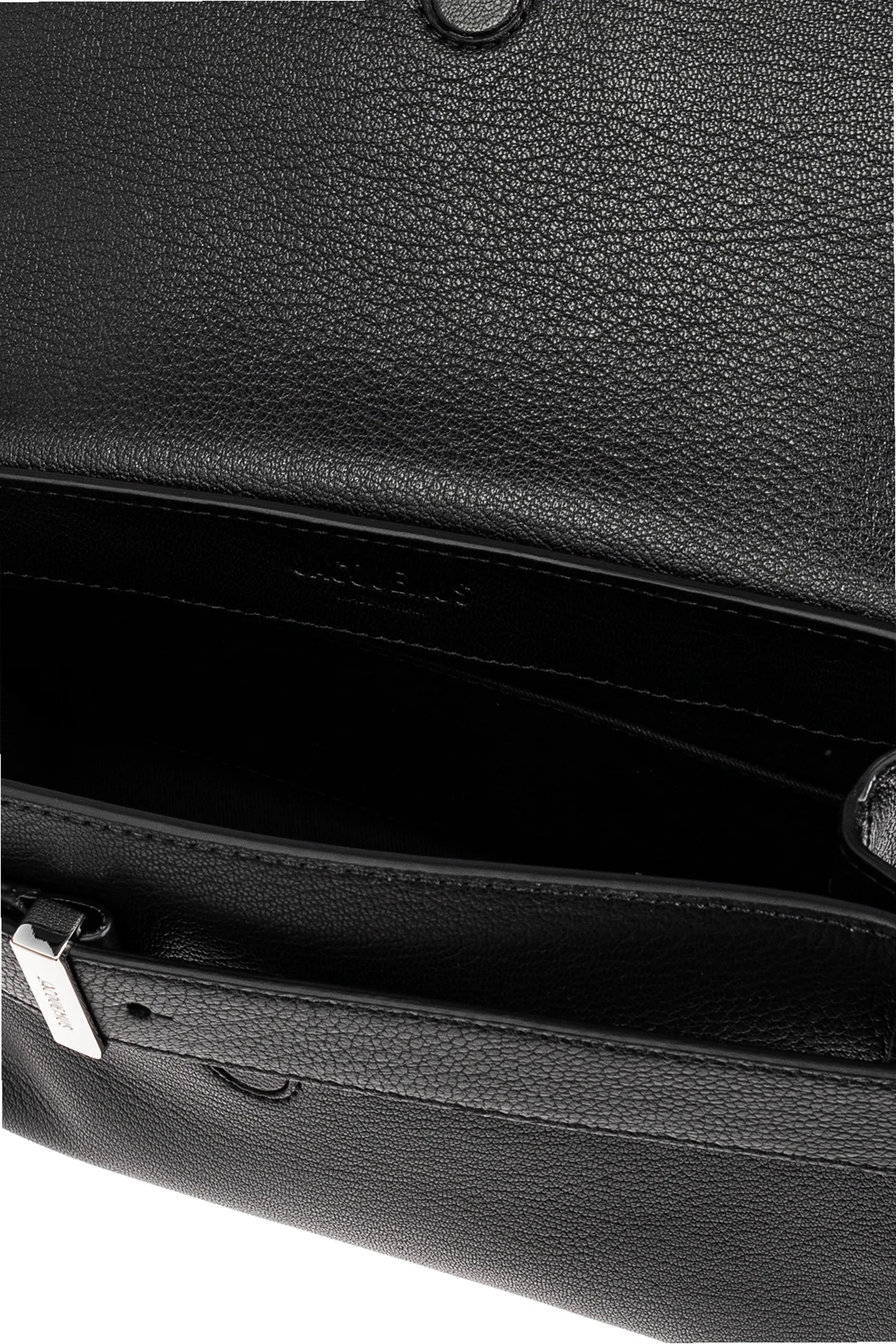 Gefertigt aus hochwertigem, genarbtem Lammleder, besticht die Tasche in dominierendem Schwarz durch ihre Langlebigkeit und luxuriösen Charakter. Auf der vorderen Klappe befindet sich ein dekorativer Riemen mit einer Metallschnalle, auf der der Name des Designers eingraviert ist, was die Exklusivität des Produkts unterstreicht. Ein weiteres Highlight ist der geprägte Schriftzug "JACQUEMUS" auf der Vorderseite der Tasche.