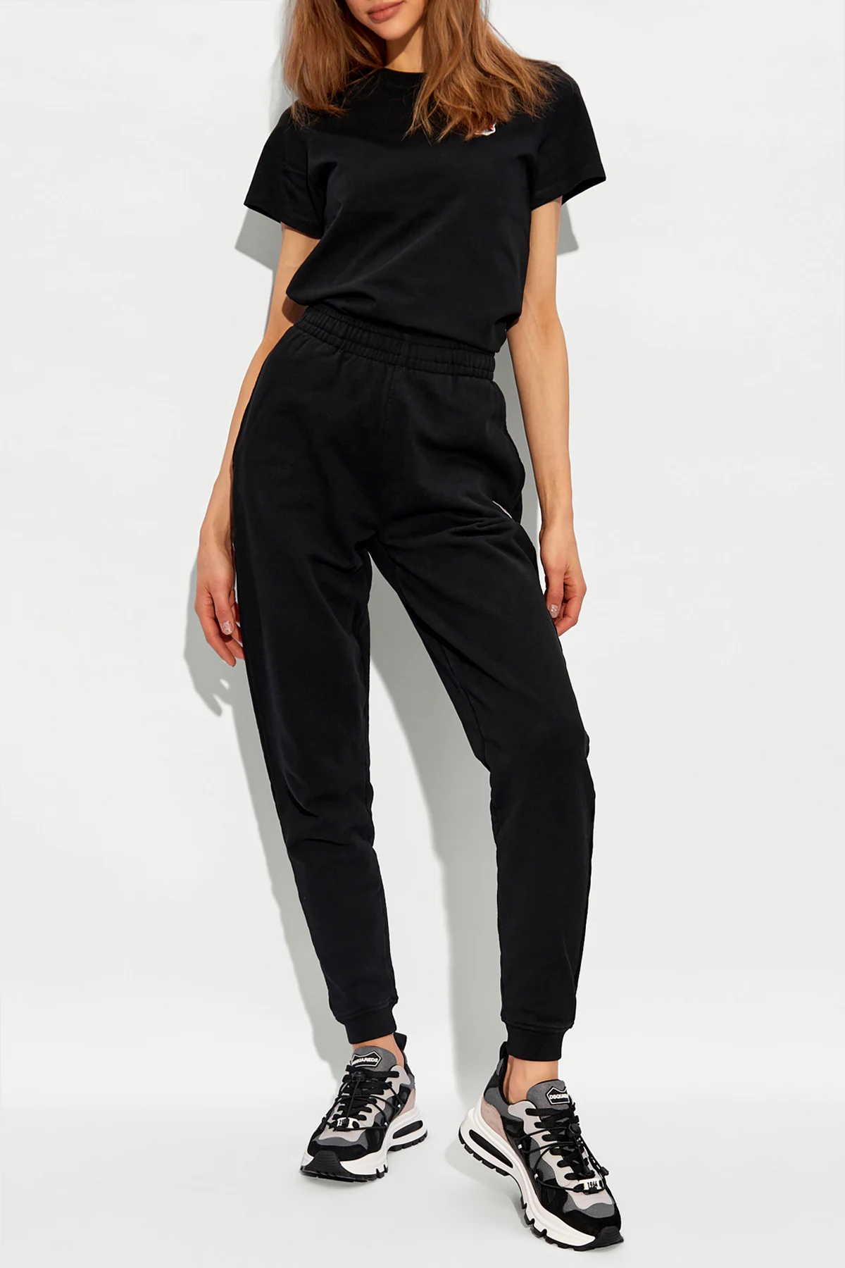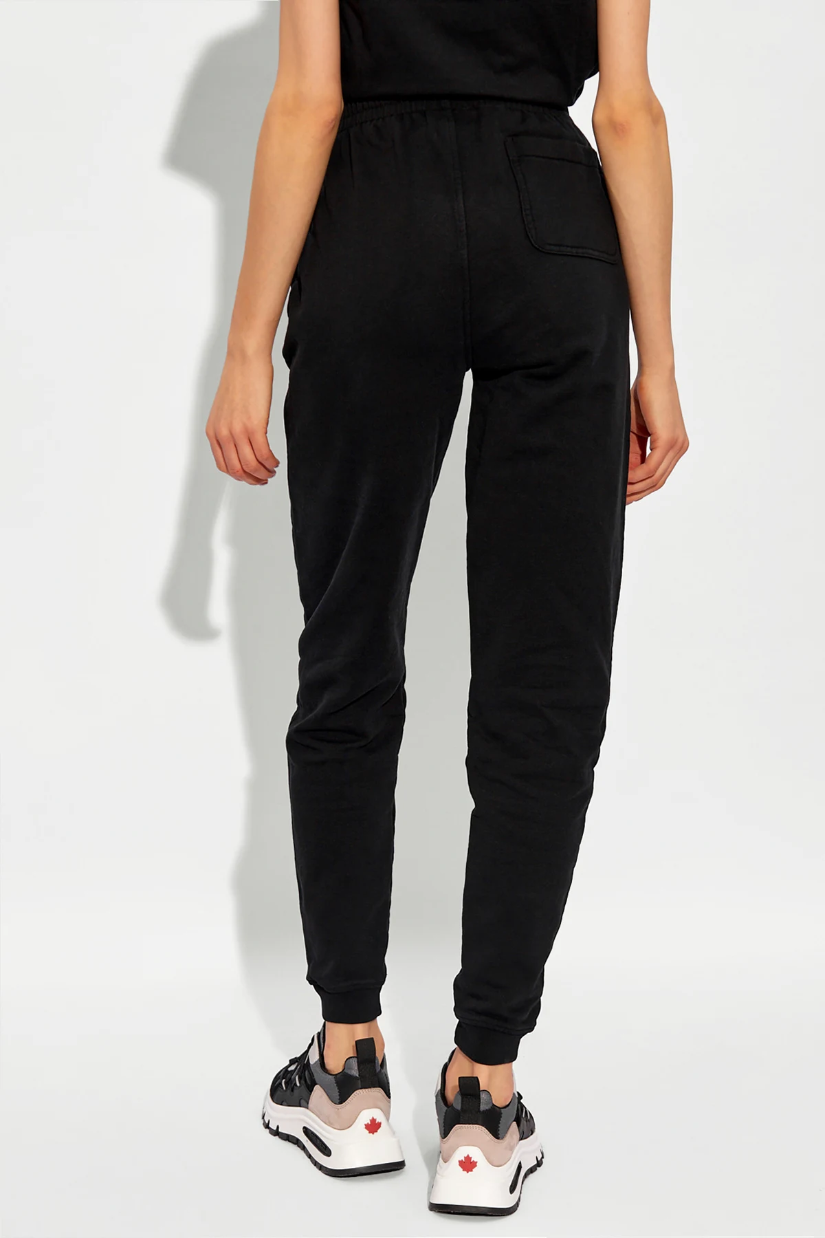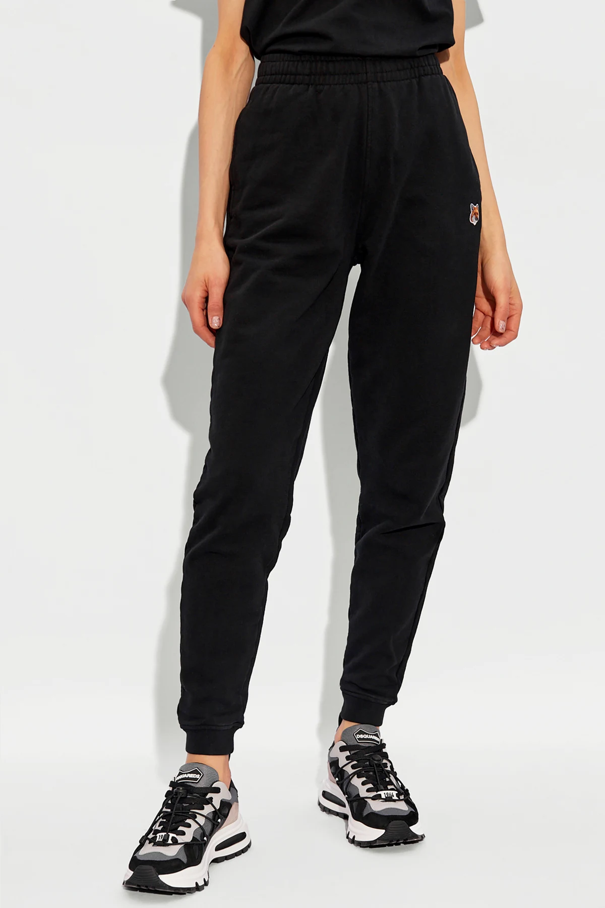 Black sweatpants from Maison Kitsune. Made of cotton, this pair is cinched with drawstrings at the waistband and features a logo-shaped patch on the front, three slip pockets and ribbed cuffs.