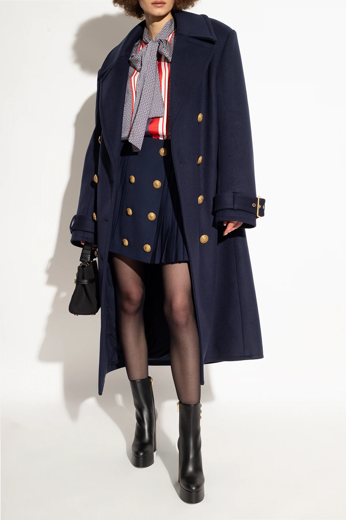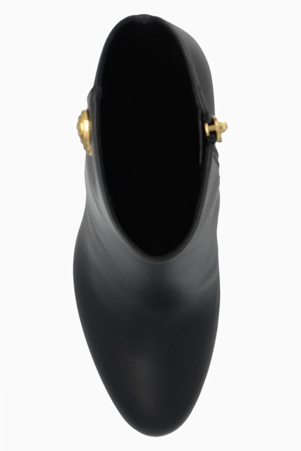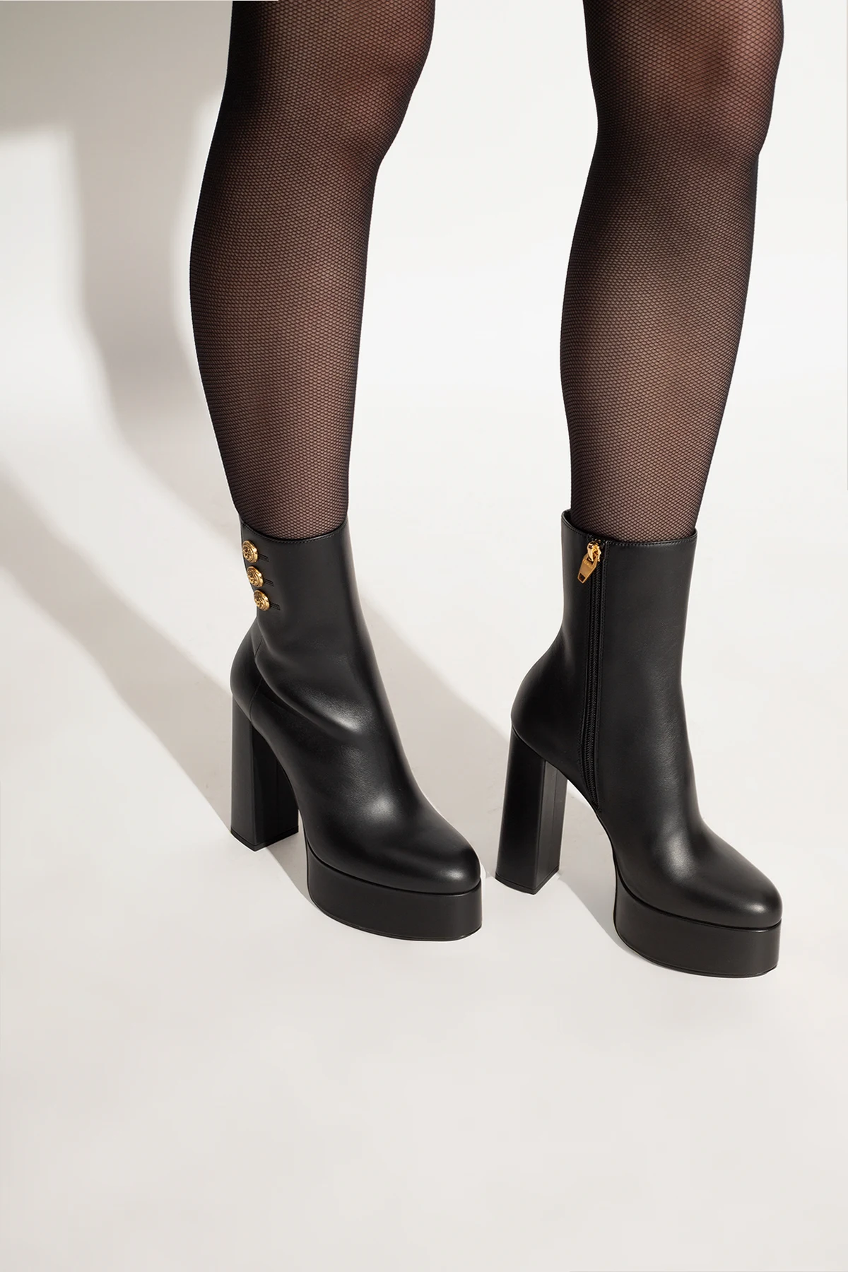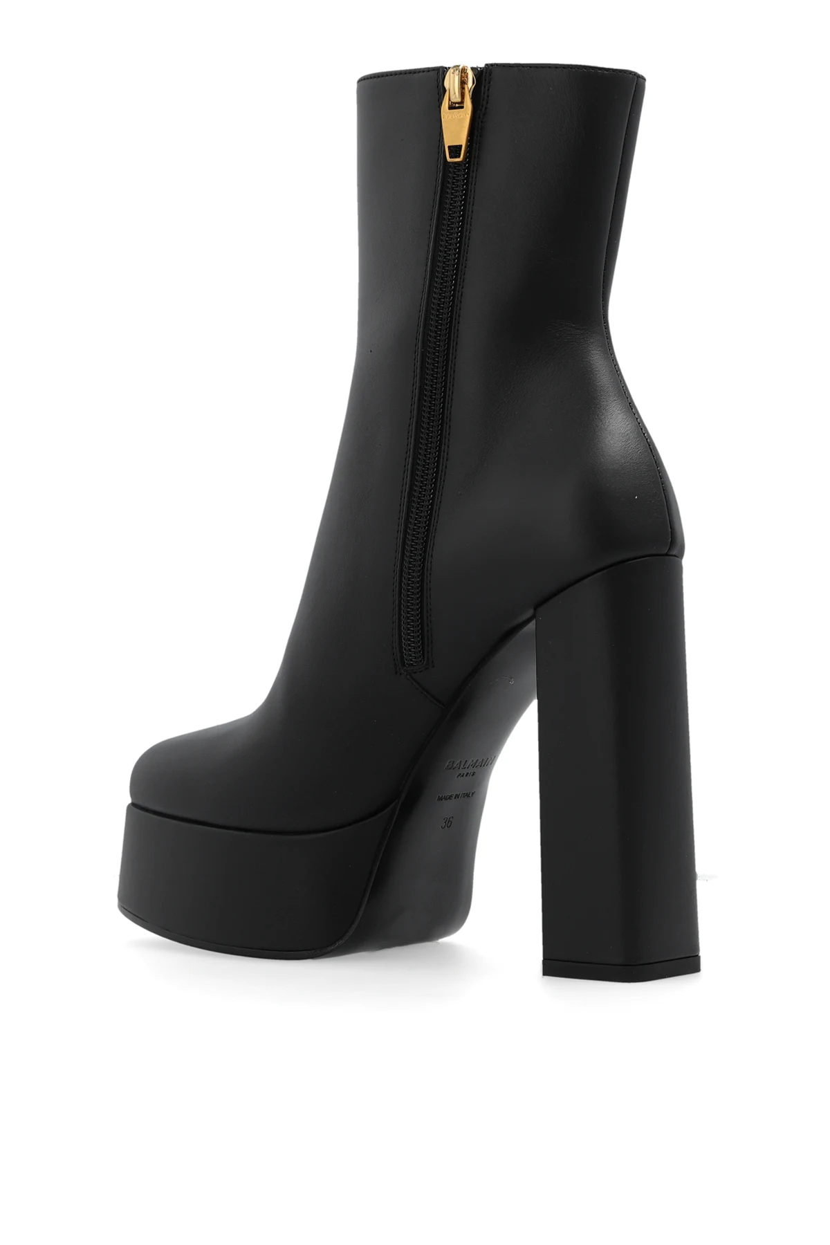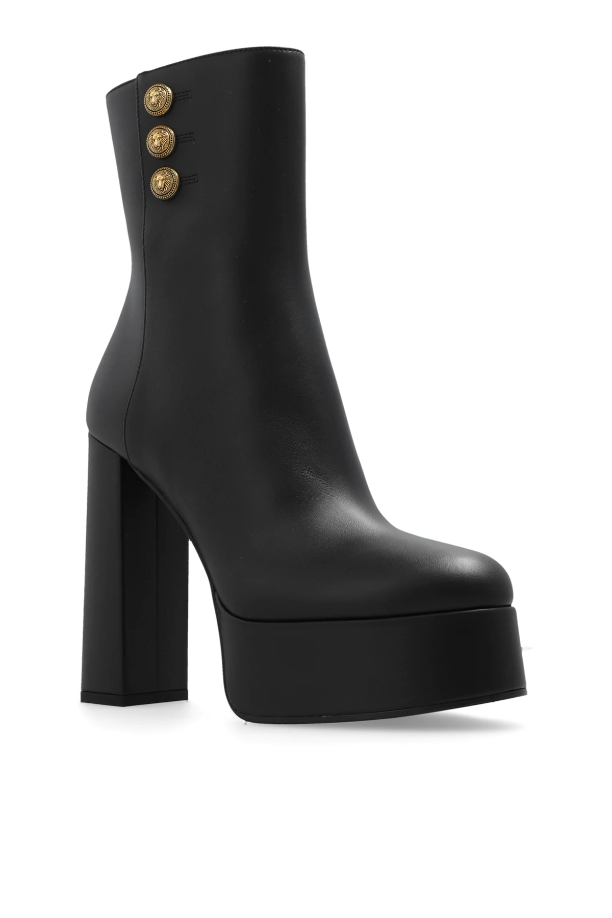 Black 'Brune' platform ankle boots from Balmain. Made from smooth calf leather and embellished with gold-tone metal buttons, this model sits on a black leather sole and showcases a zip fastening and a thick heel.