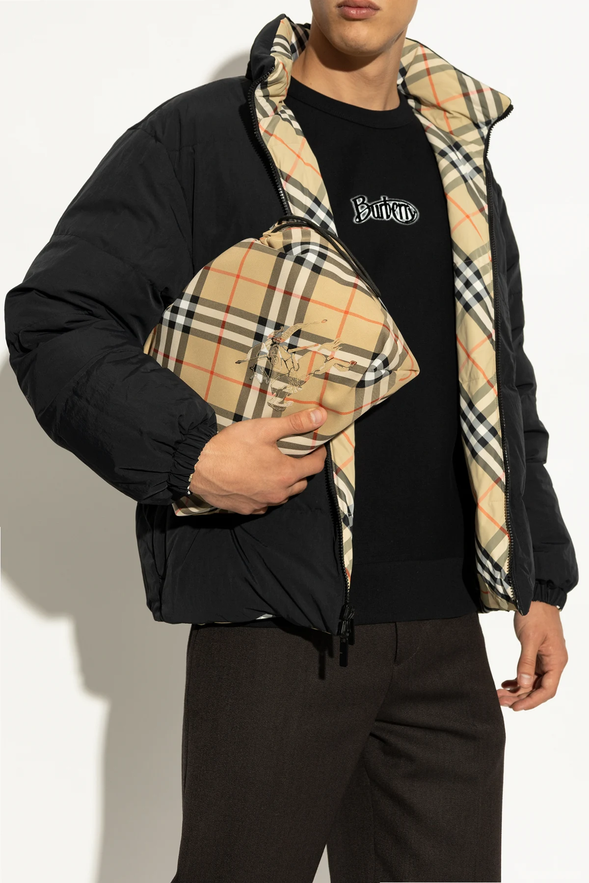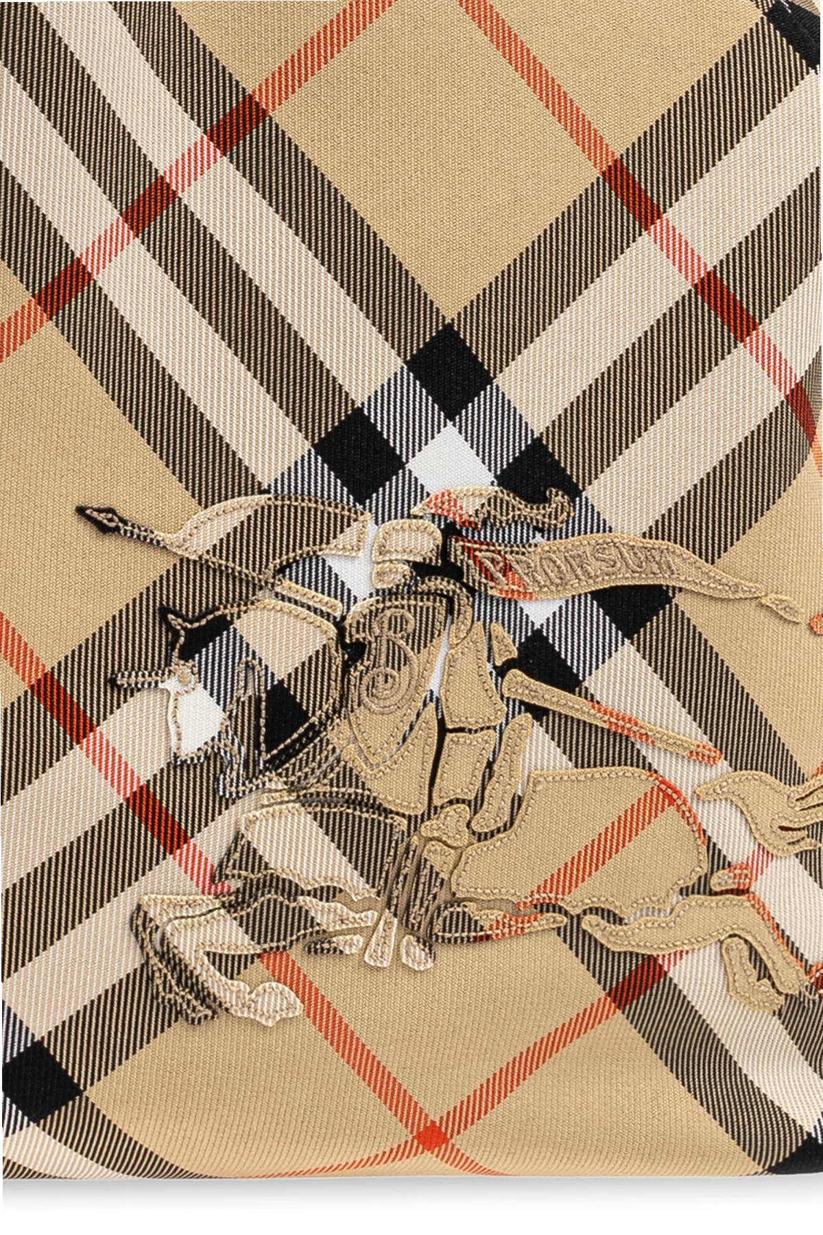 Auf der Vorderseite befindet sich ein gesticktes Motiv eines Ritters auf einem Pferd, was ihre Authentizität und ihren Prestige unterstreicht. Im Inneren der Tasche befindet sich ein blaues Burberry-Logo-Patch, das zusätzlich die Originalität des Produkts bestätigt.