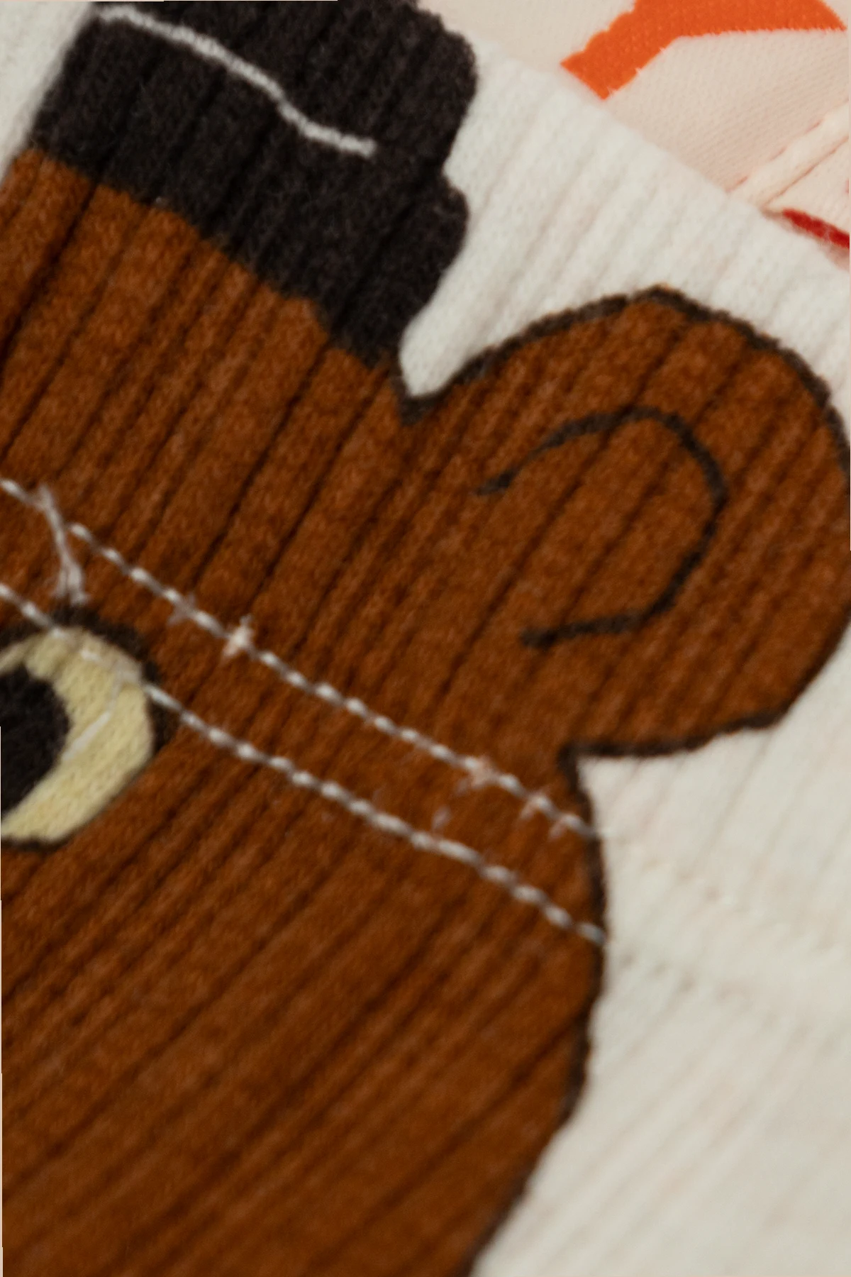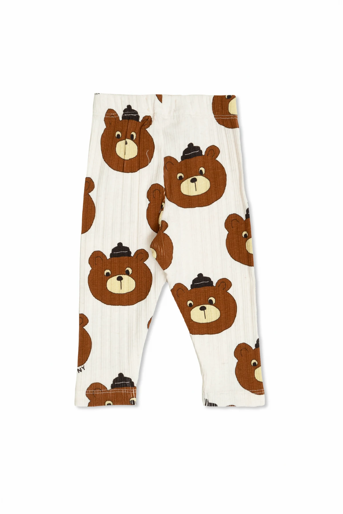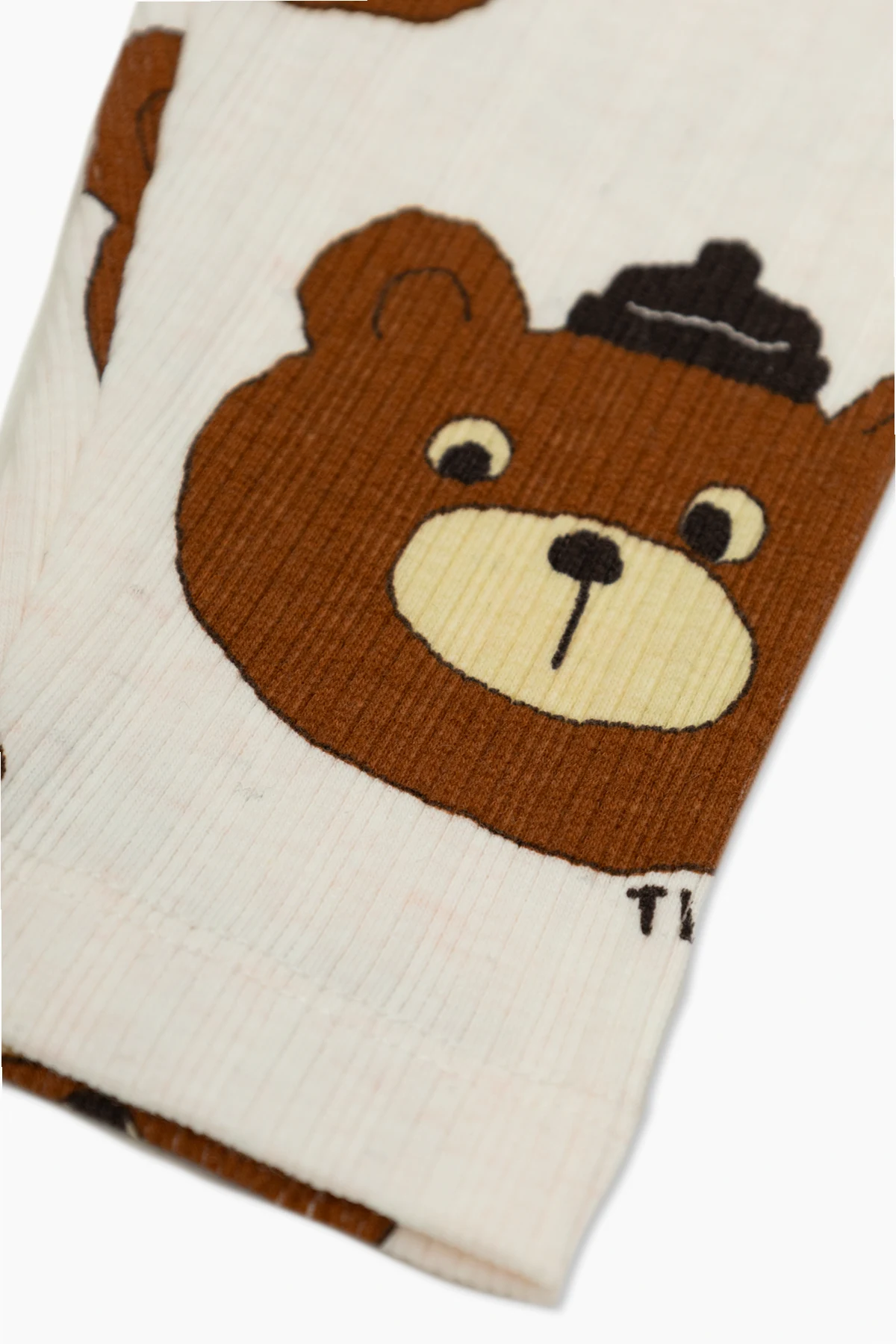 Diese Leggings zeichnen sich durch einen klassischen, eng anliegenden Schnitt aus, der ideal für Säuglinge und Kleinkinder (0-36 Monate) ist. Die dominierende cremefarbene Farbe und das niedliche Muster aus braunen Bären mit Hüten, hellen Schnäuzchen und dunklen Augen verleihen ihnen einen besonderen Charme. Einige Bären haben auch den Schriftzug "TINY" daneben, was eine subtile Anspielung auf die Marke darstellt.