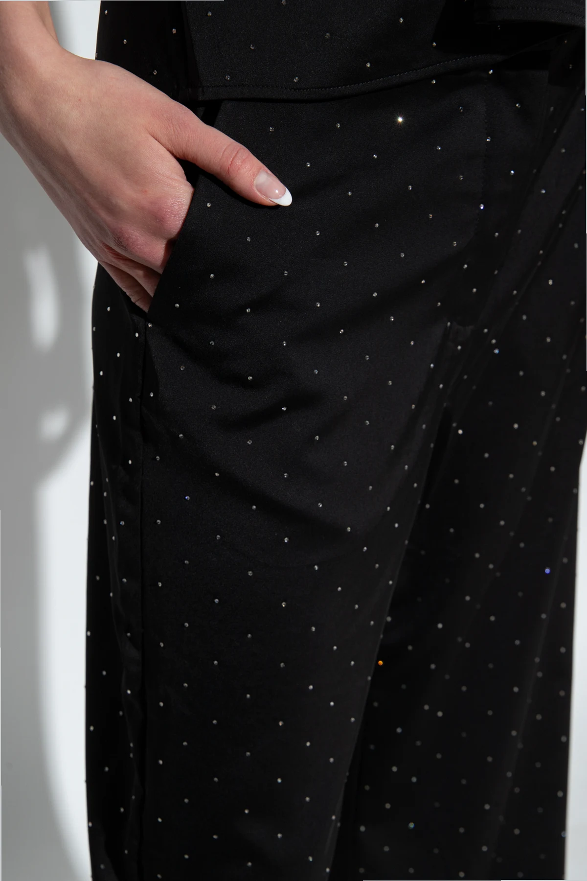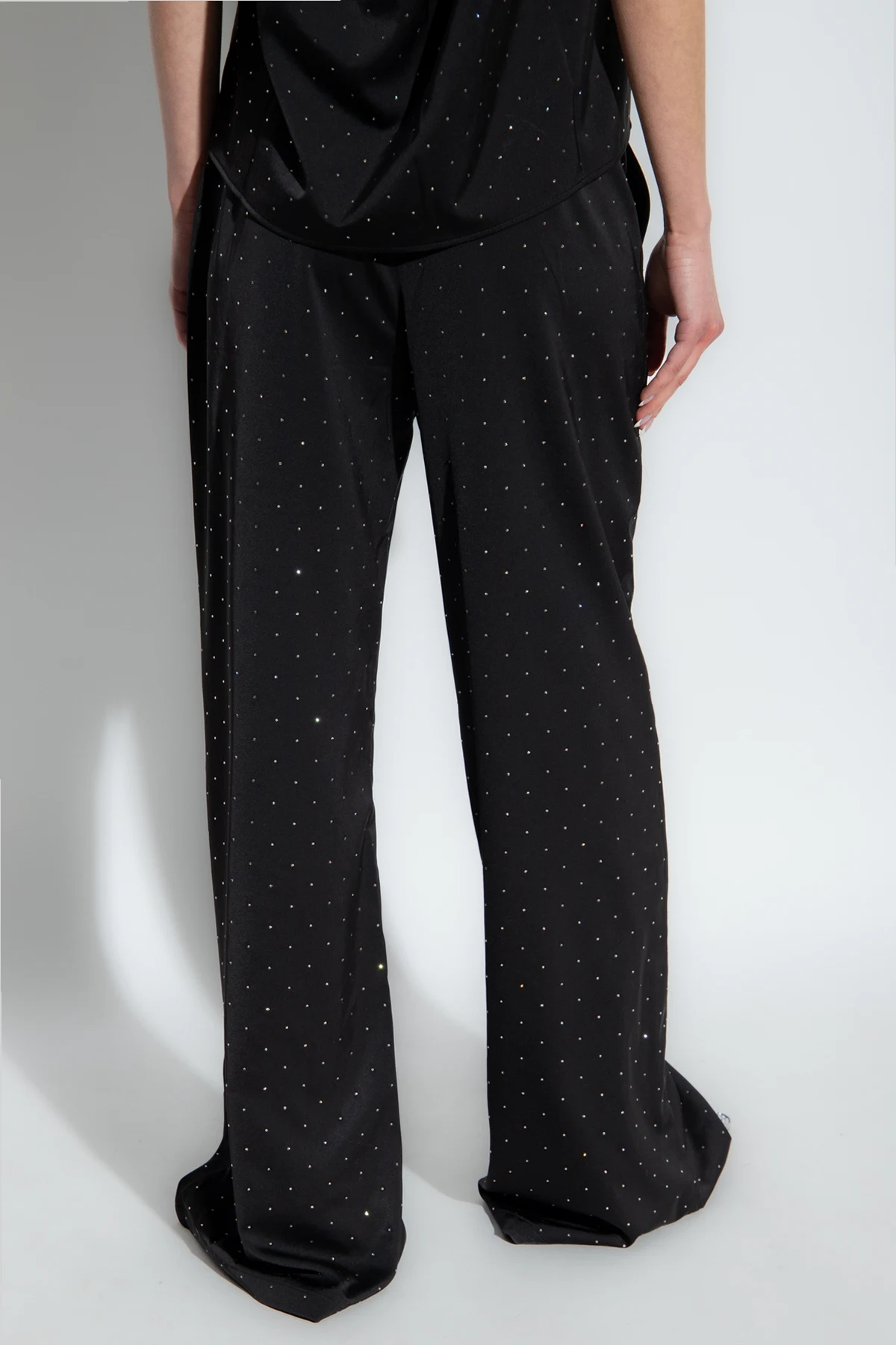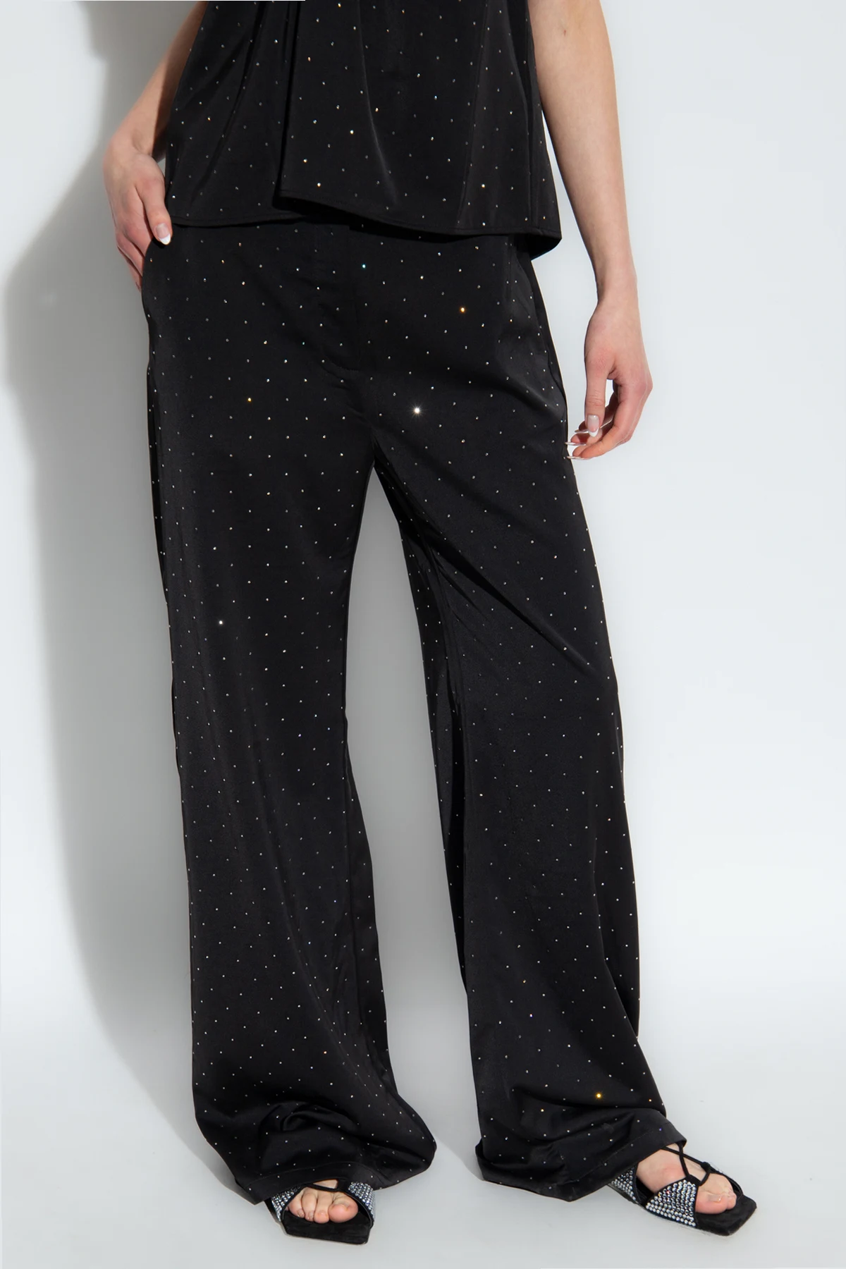 Black ‘Leileen’ trousers from Munthe. Made of satin, this pair falls with wide legs and features a hook, button and zip fastening, rhinestones and two slip pockets.