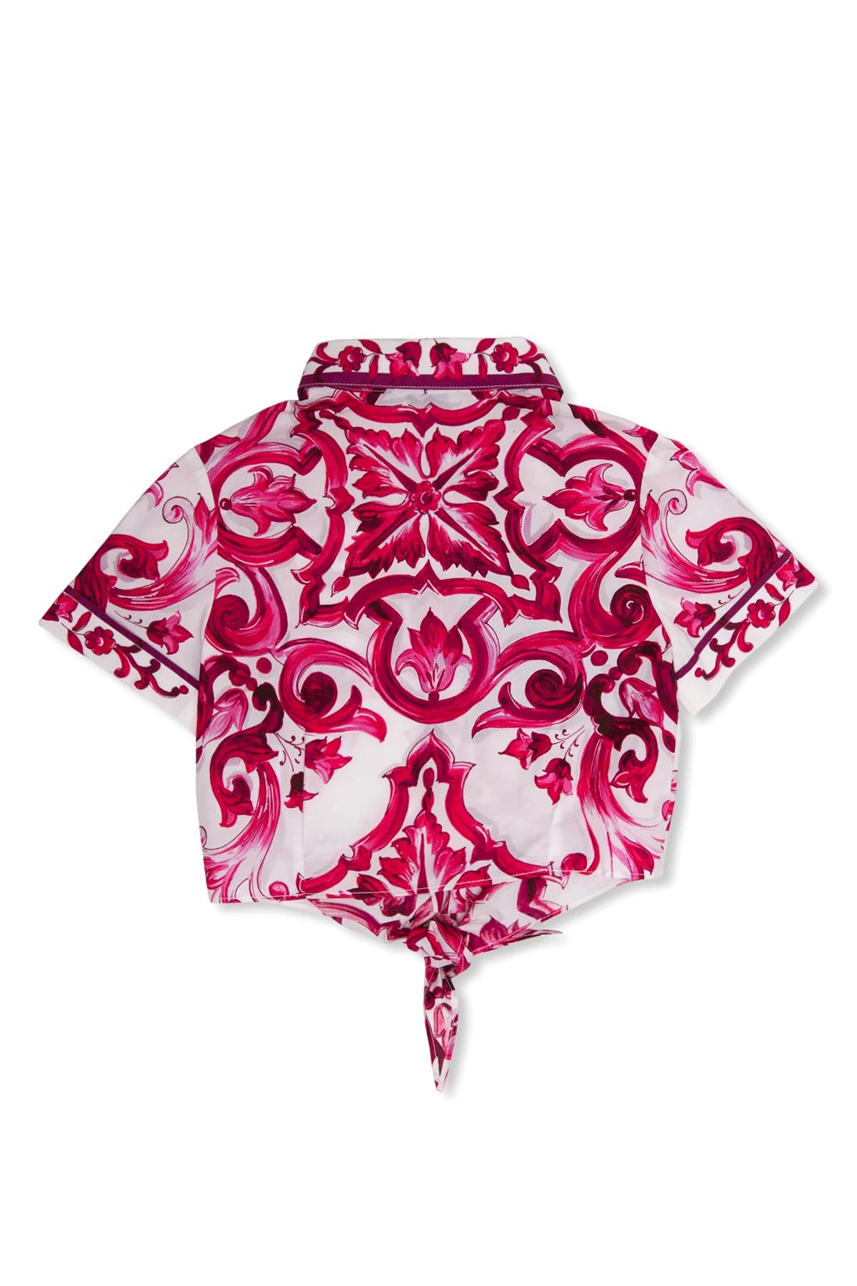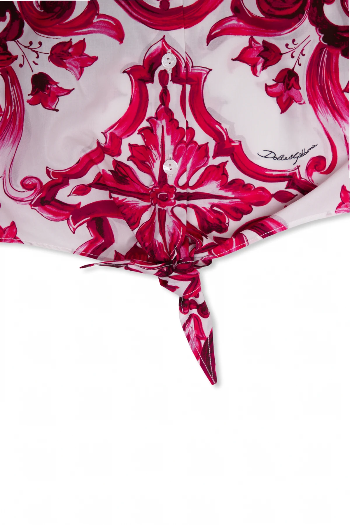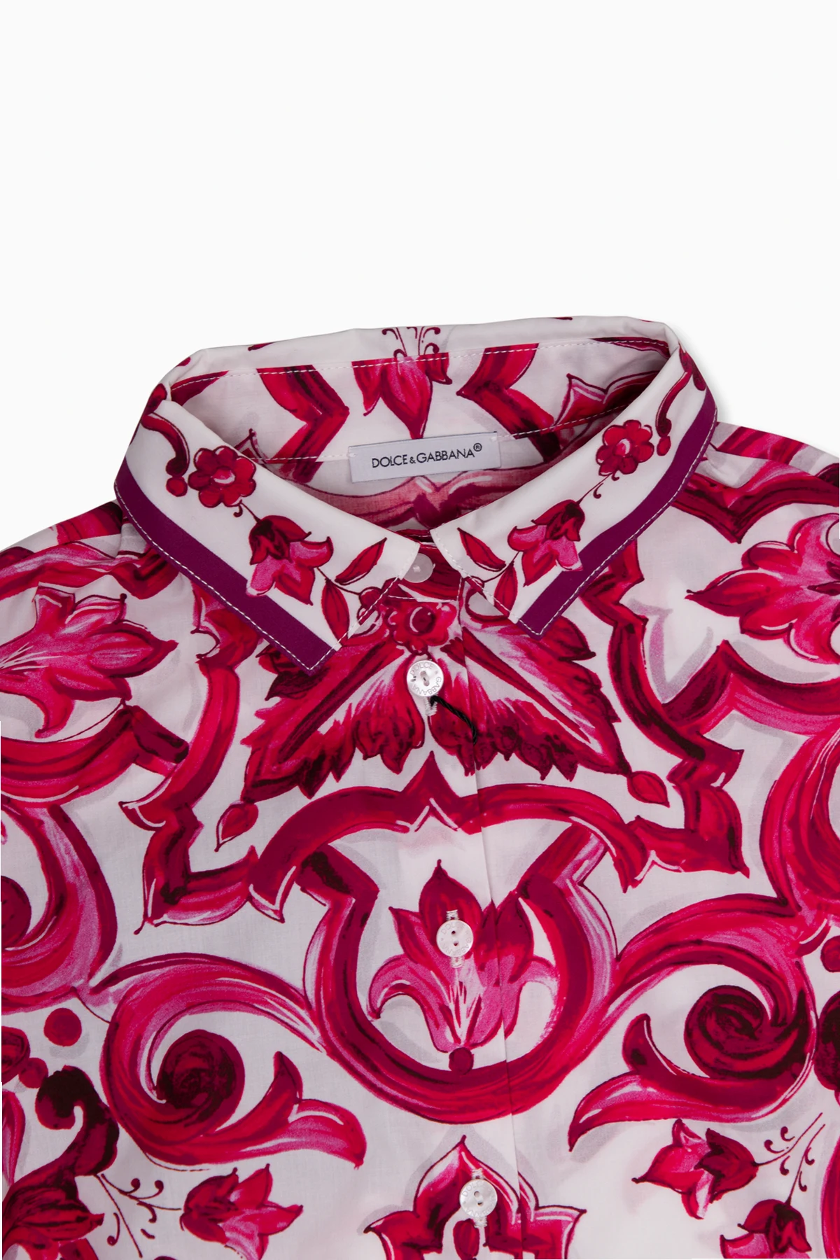 White and pink shirt from Dolce & Gabbana Kids. Made of cotton, this style fastens with buttons and showcases a caligraphic-naturalistic Majolica print and logo in pink. It is complete a self-tie fastening at the hem and short sleeves.