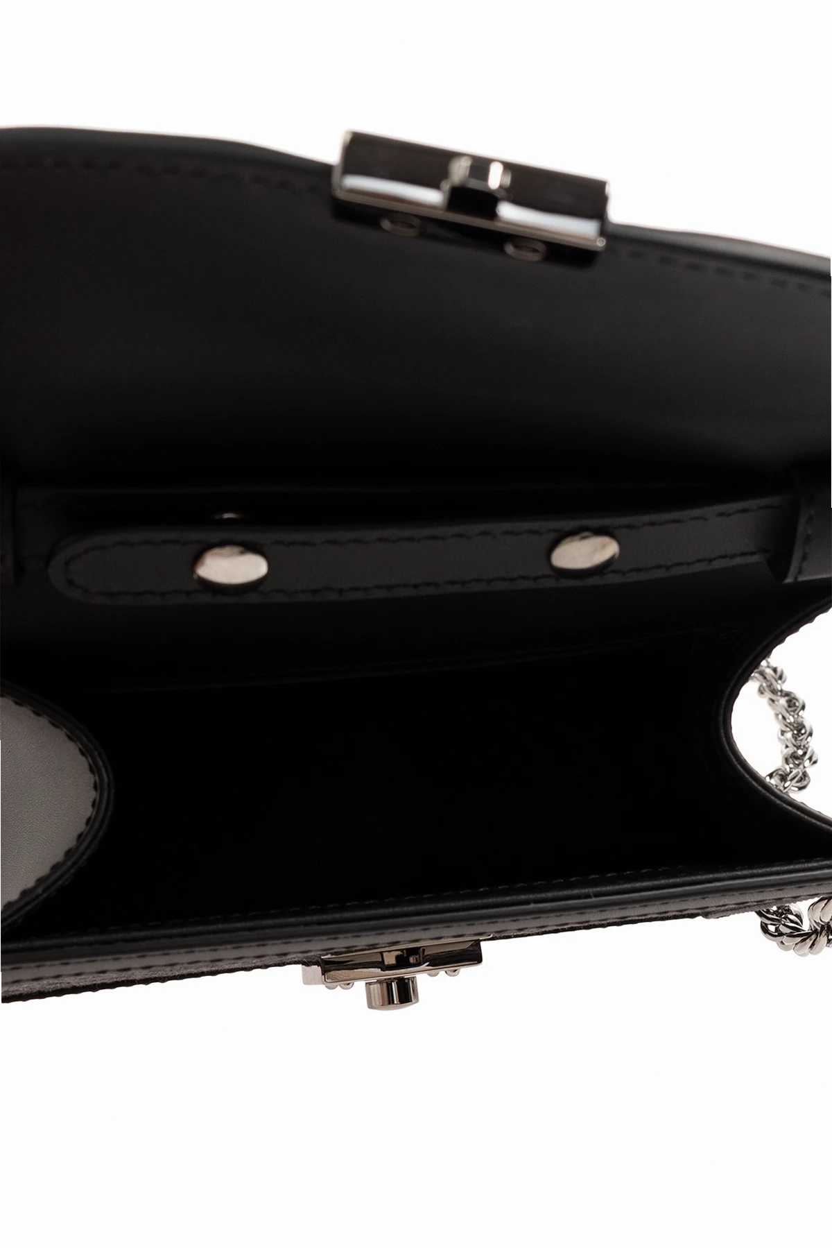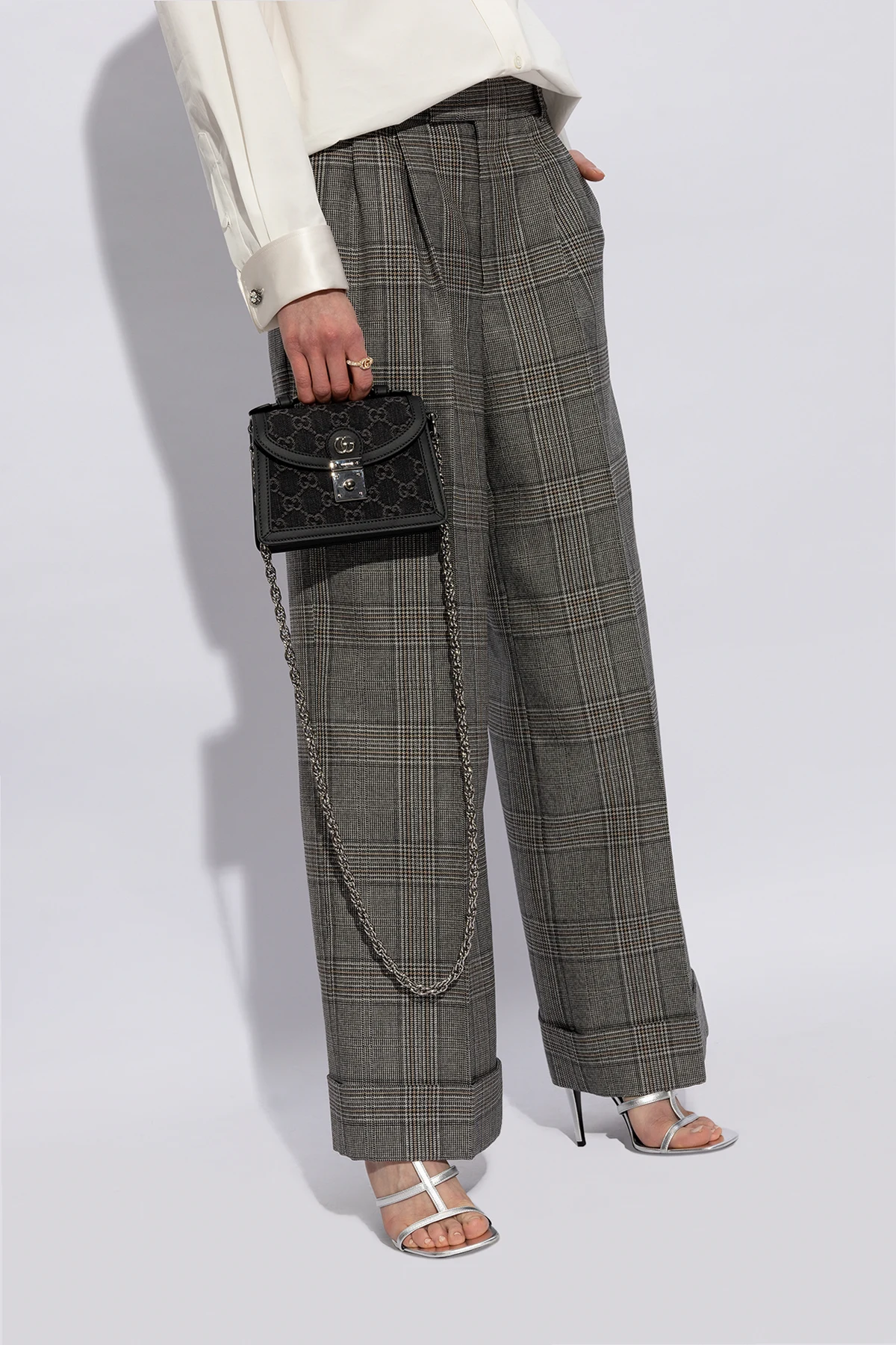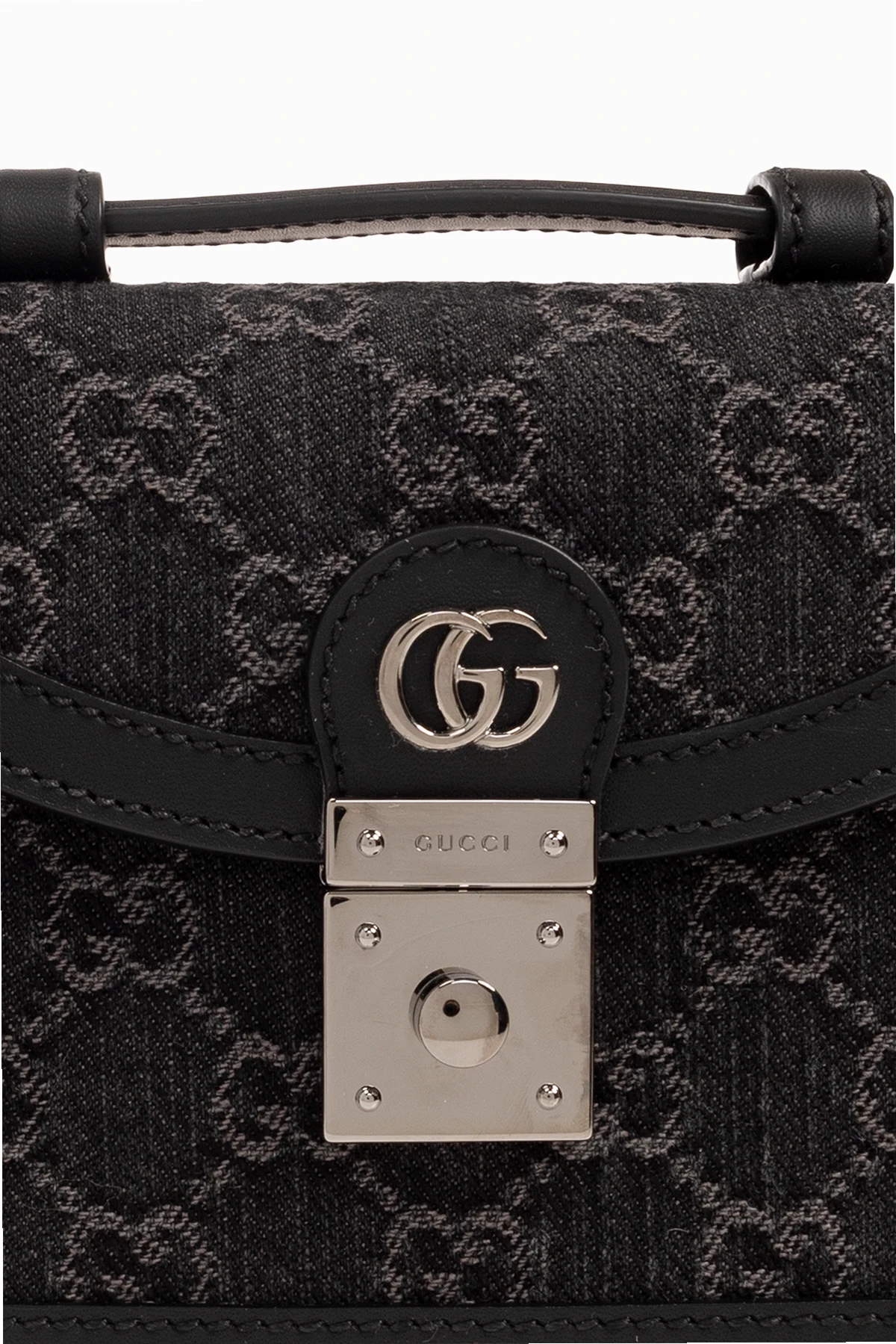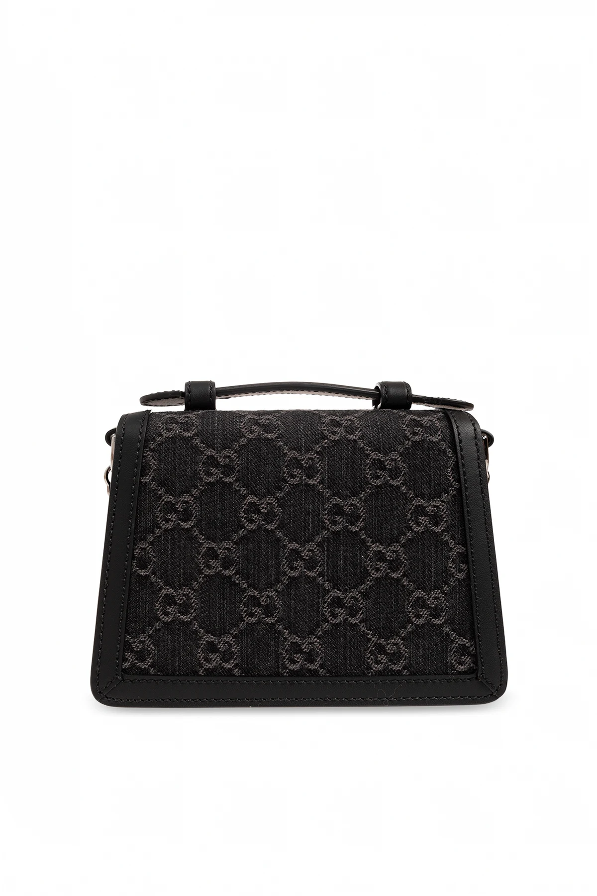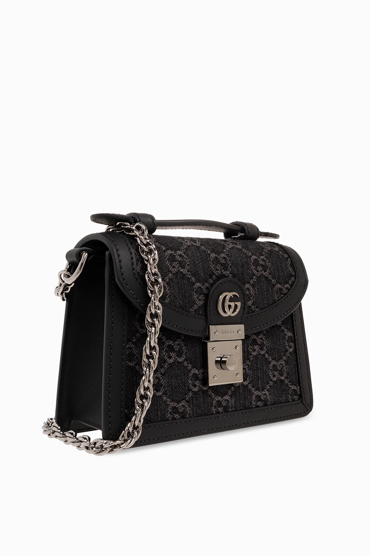 Black ‘Ophidia Mini’ shoulder bag from Gucci. Made from monogrammed denim and trimmed with calf leather, this design secures with a logo-engraved metal fastener and showcases Double G hardware on the flap, one short handle, silver-tone metal elements as well as a detachable shoulder strap and one internal compartment with a slip pocket.