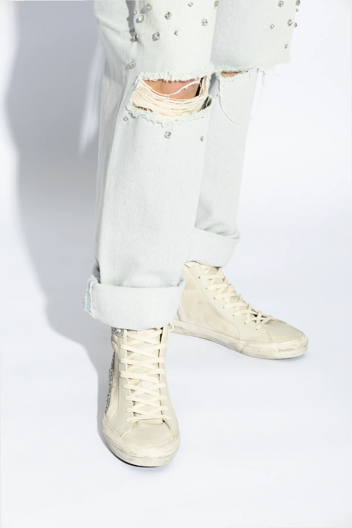 Die Schuhe sind mit einer leicht durchsichtigen Gummisohle versehen, die ihnen eine Leichtigkeit und einen modernen Charakter verleiht. Klassische Schnürung, verstärkte Zunge und ein seitlicher Reißverschluss garantieren nicht nur Komfort, sondern auch einfaches An- und Ausziehen. Das für die Marke charakteristische Stern -Symbol und eine Schlaufe an der Rückseite des Schuhs unterstreichen ihre Einzigartigkeit.