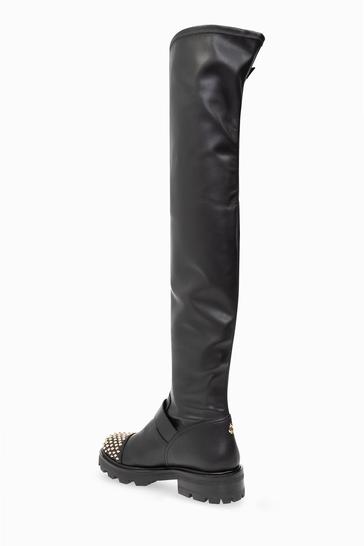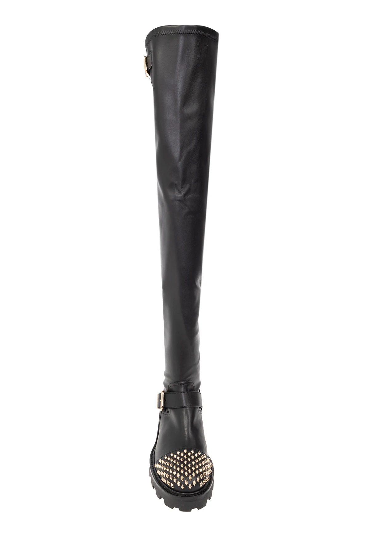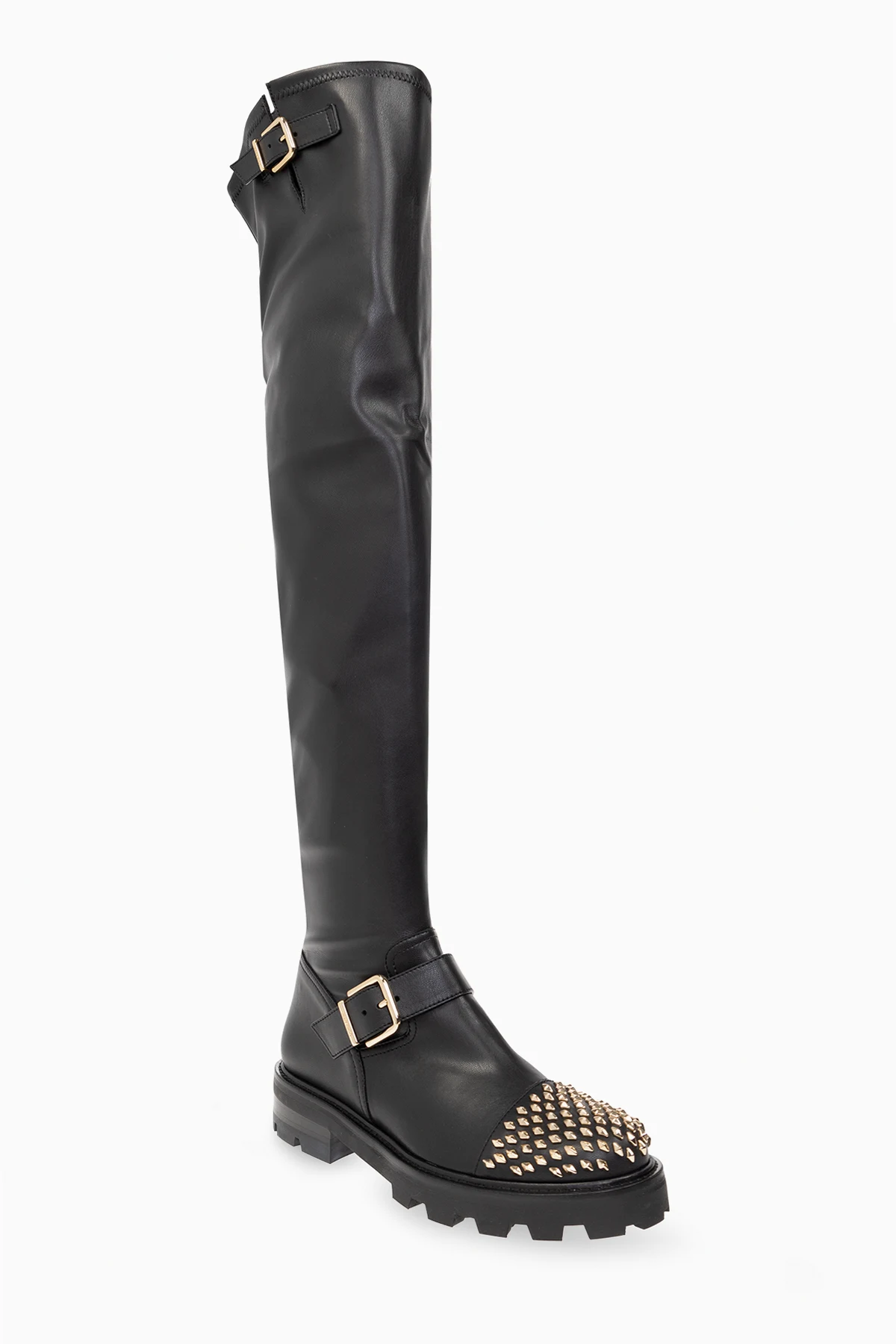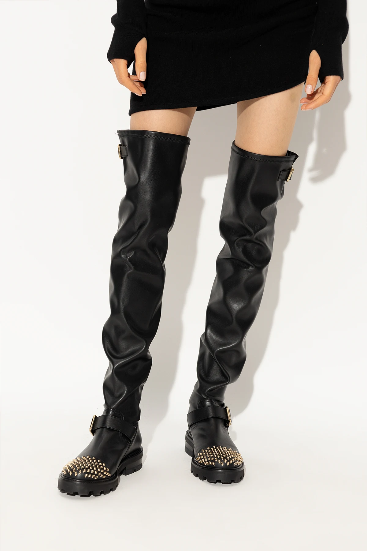 Black ‘Biker II’ boots from Jimmy Choo. Made of leather, this slip-on pair features a buckle strap, toe with gold-tone diamond studs, logo detail at the back and black rubber sole.