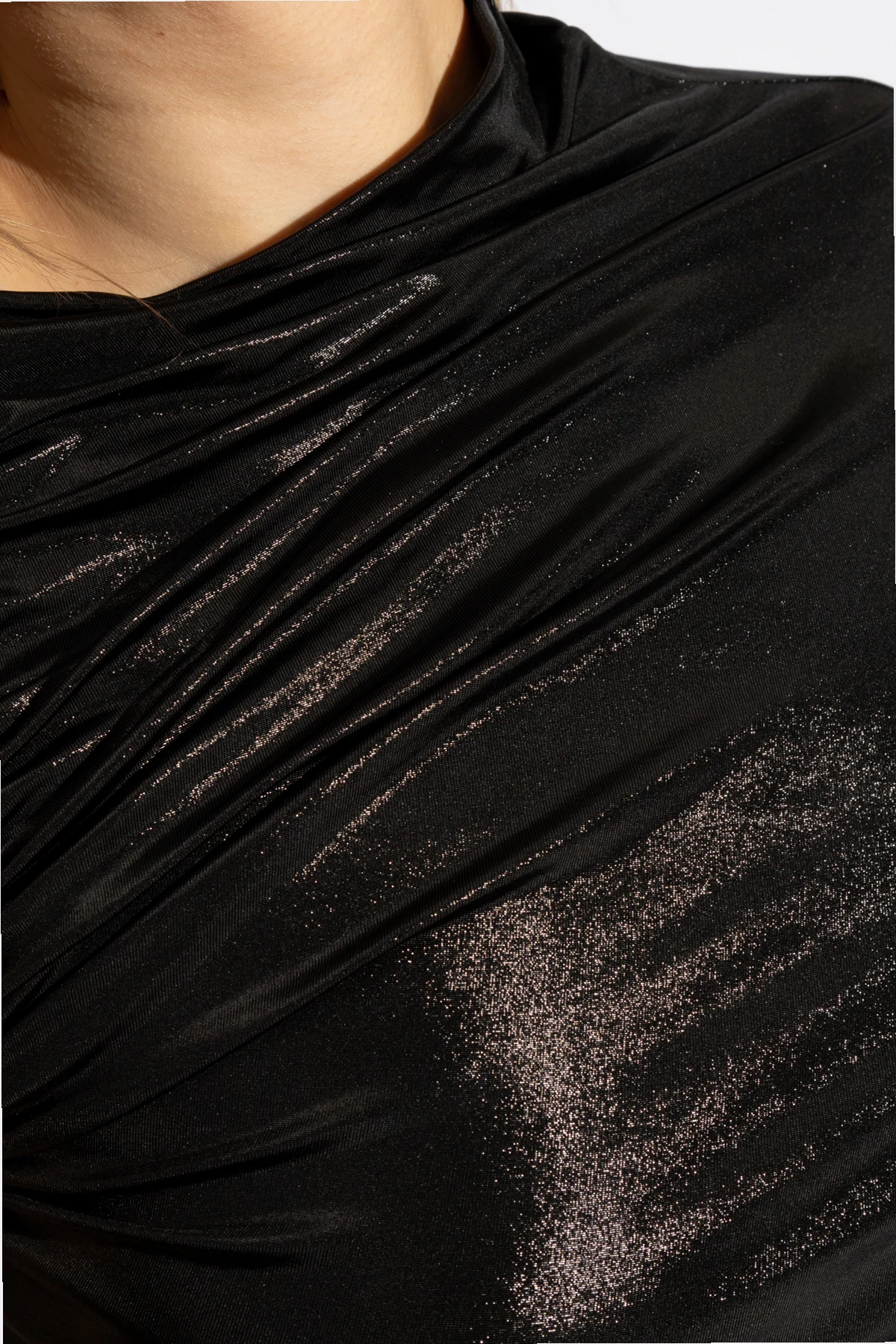 Der asymmetrische Schnitt des unteren Teils des Kleides und dekorative Drapierungen verleihen dem Outfit Charakter, während diskret platzierte Etiketten und Designer-Kennzeichnungen von einer raffinierten Einfachheit und Eleganz zeugen. Die dominierende Farbe – klassisches Schwarz – macht das Kleid ‘Svita Mini’ universell und lässt es sich perfekt mit einer Vielzahl von Accessoires kombinieren.