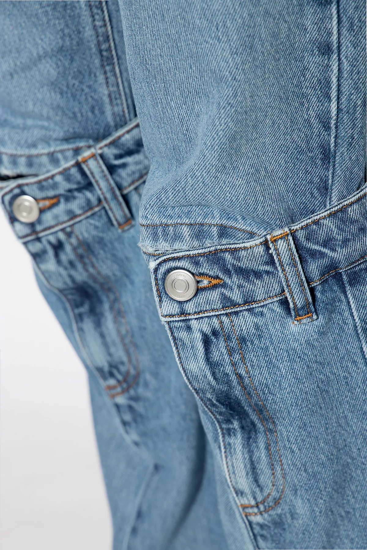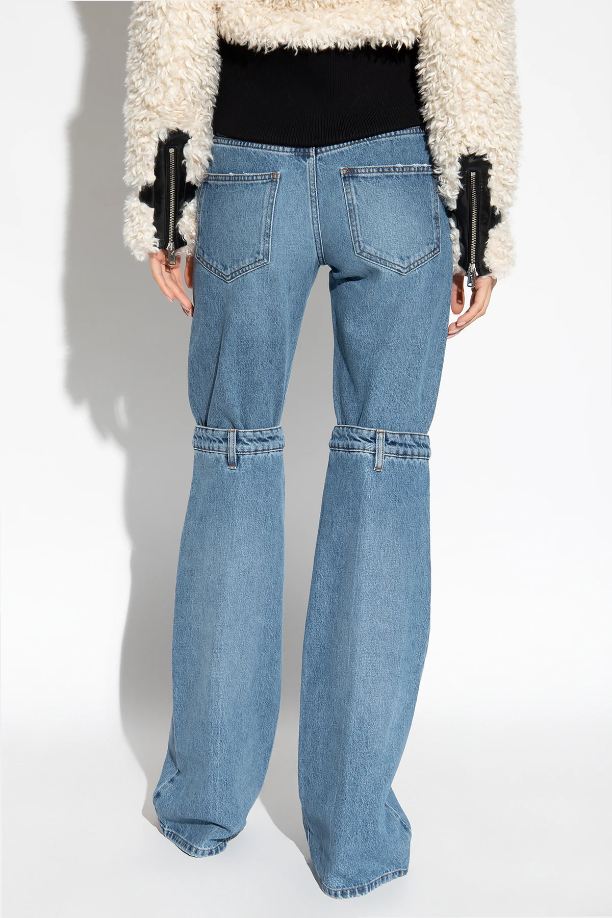 Blue jeans from Coperni. Fastened with a button and zip, this pair features a white logo patch at the back, five slip pockets, and flared legs with buttoned and zipped cut-outs at the knees.