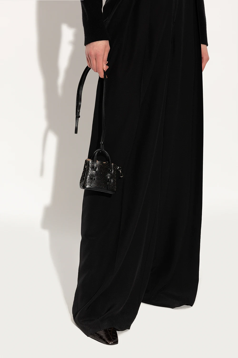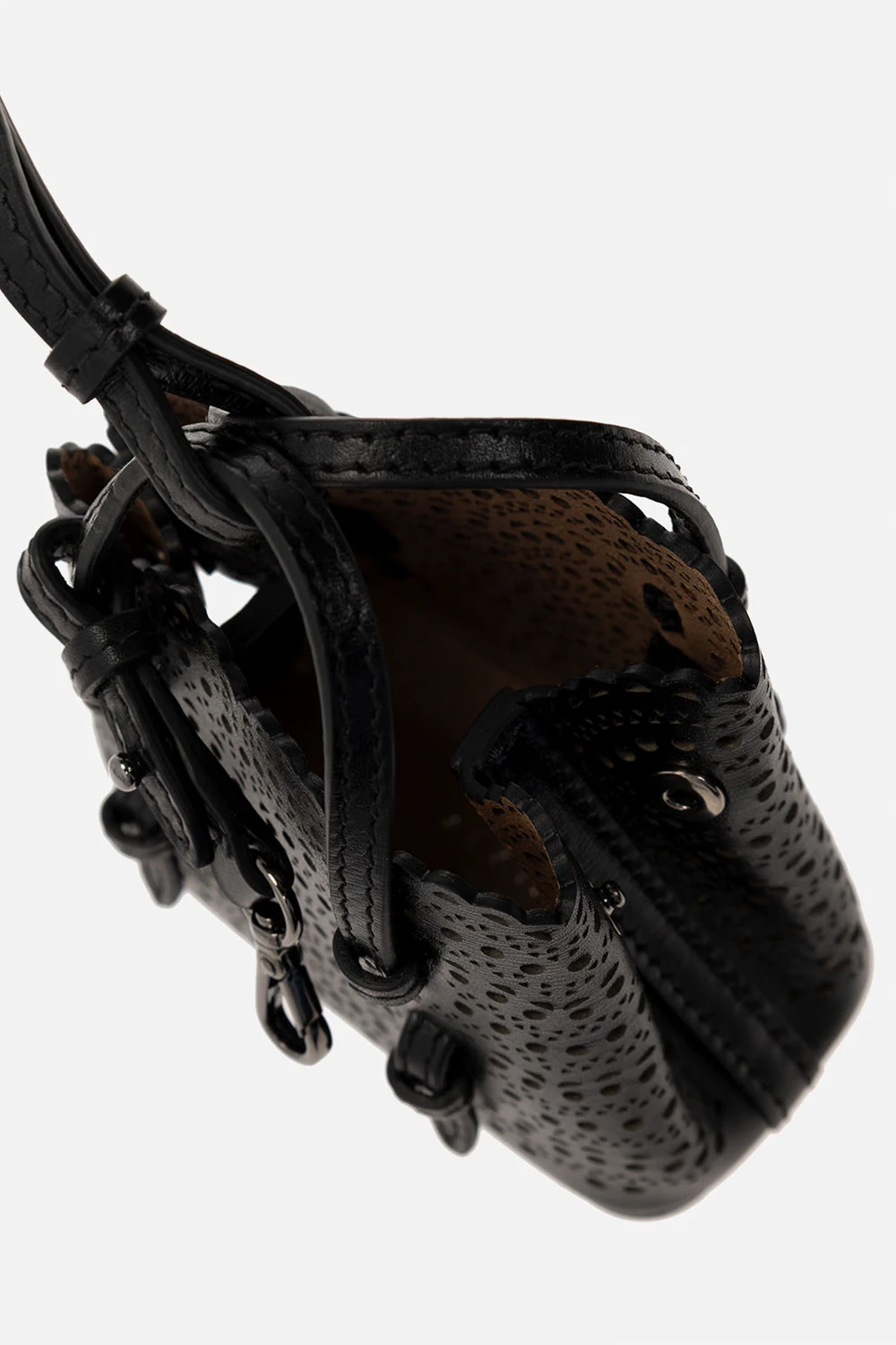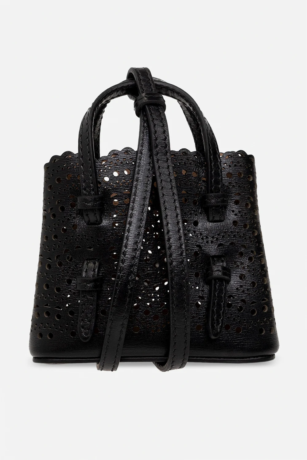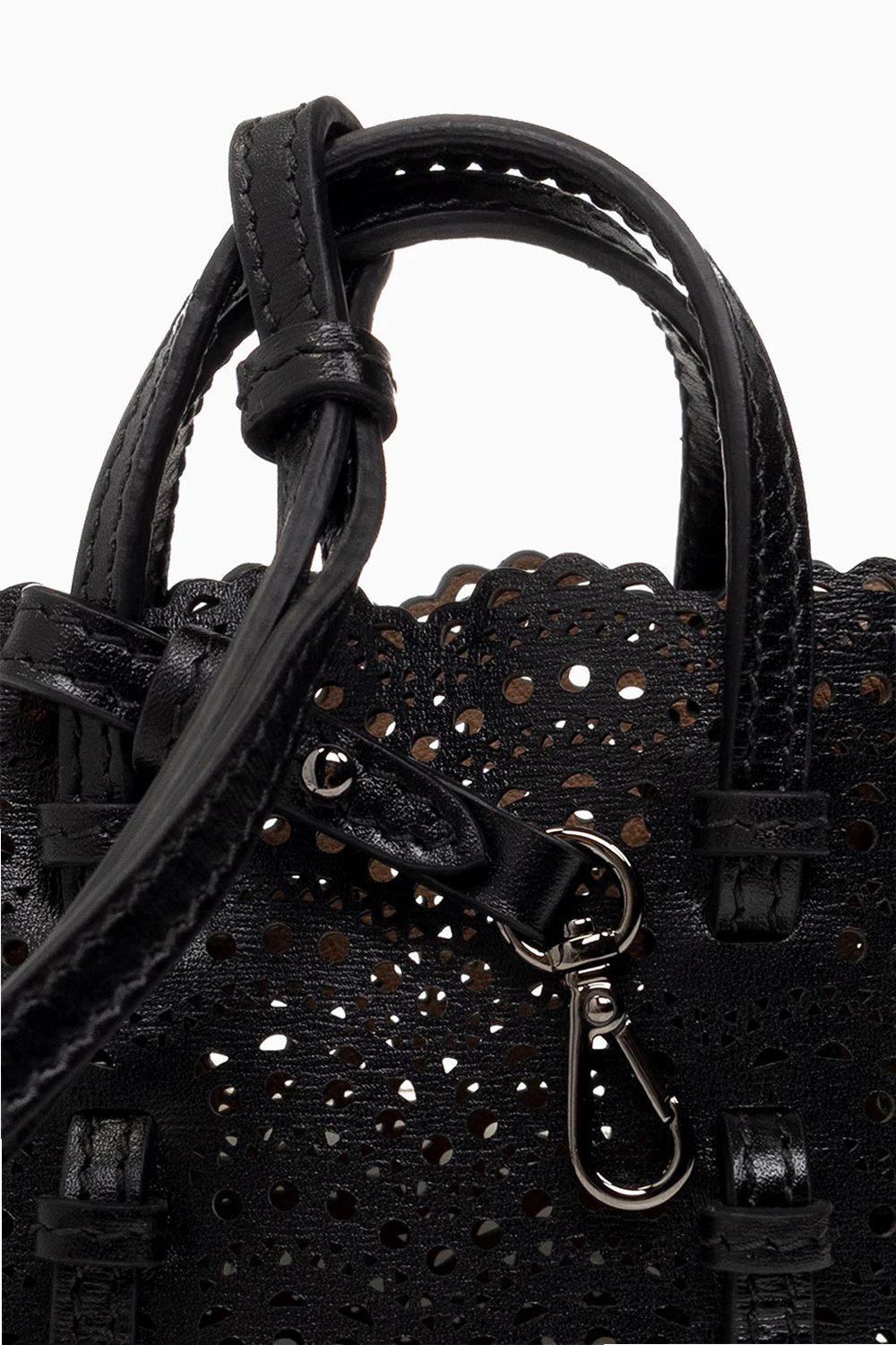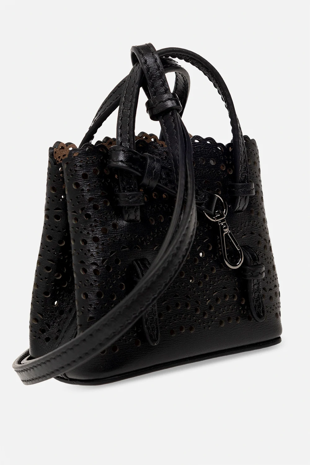 Black ‘Mina Mini’ pouch from Alaia. Crafted from calf leather, this item features snap fastening on the sides for adjusting the size, openwork pattern, carabiner clip on a strap, two half-round handles, detachable and adjustable shoulder strap, one internal compartment and silver-tone metal hardware.