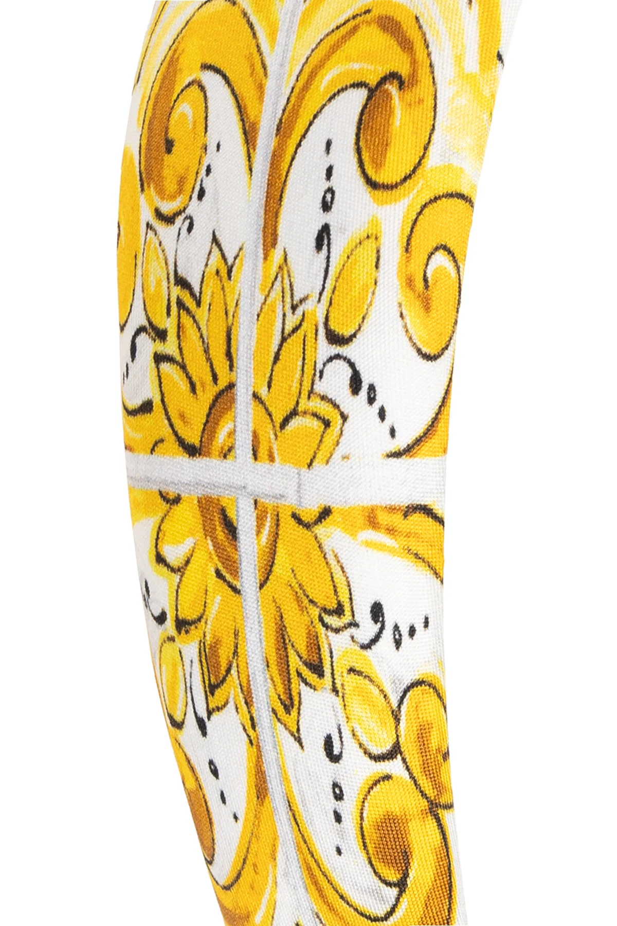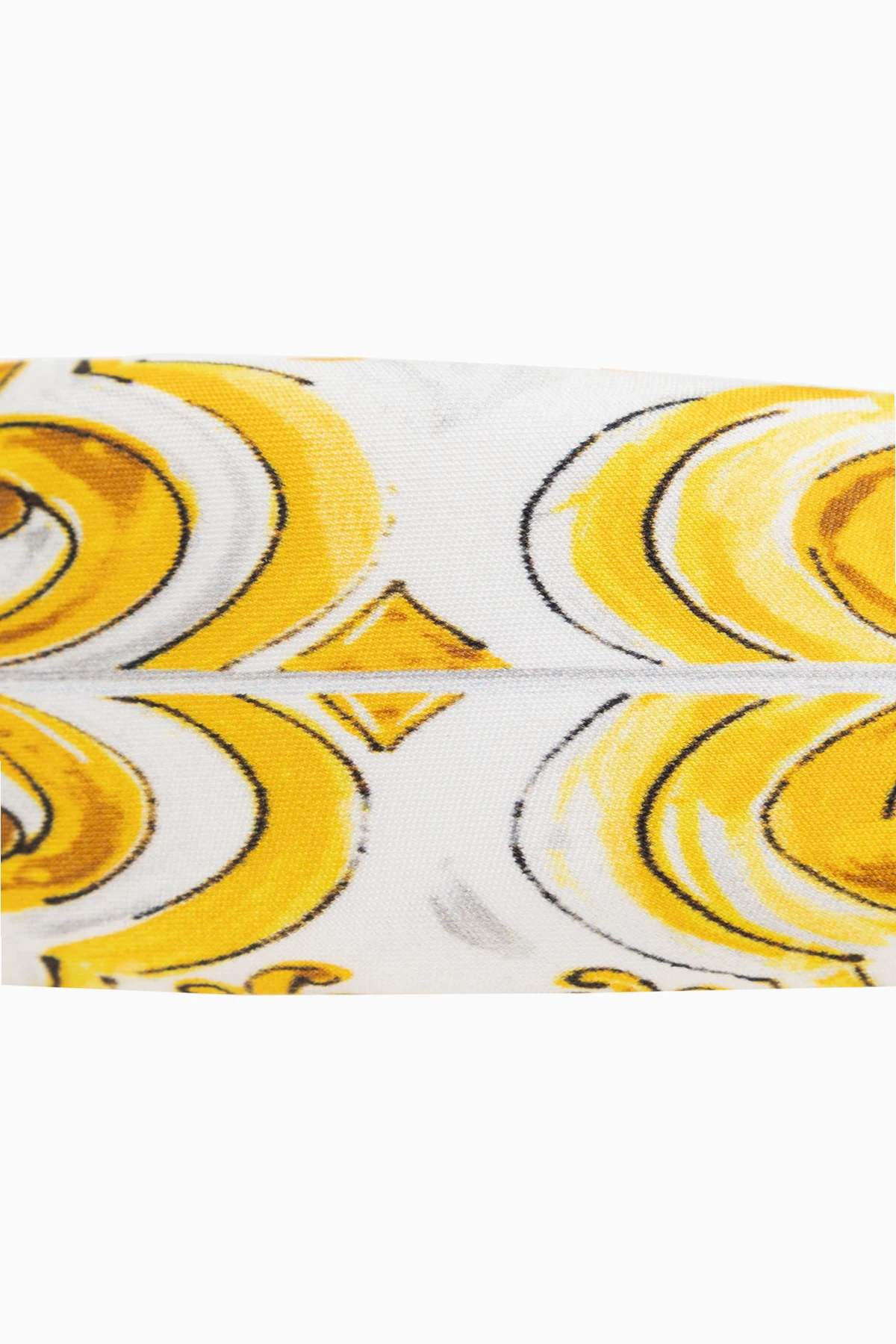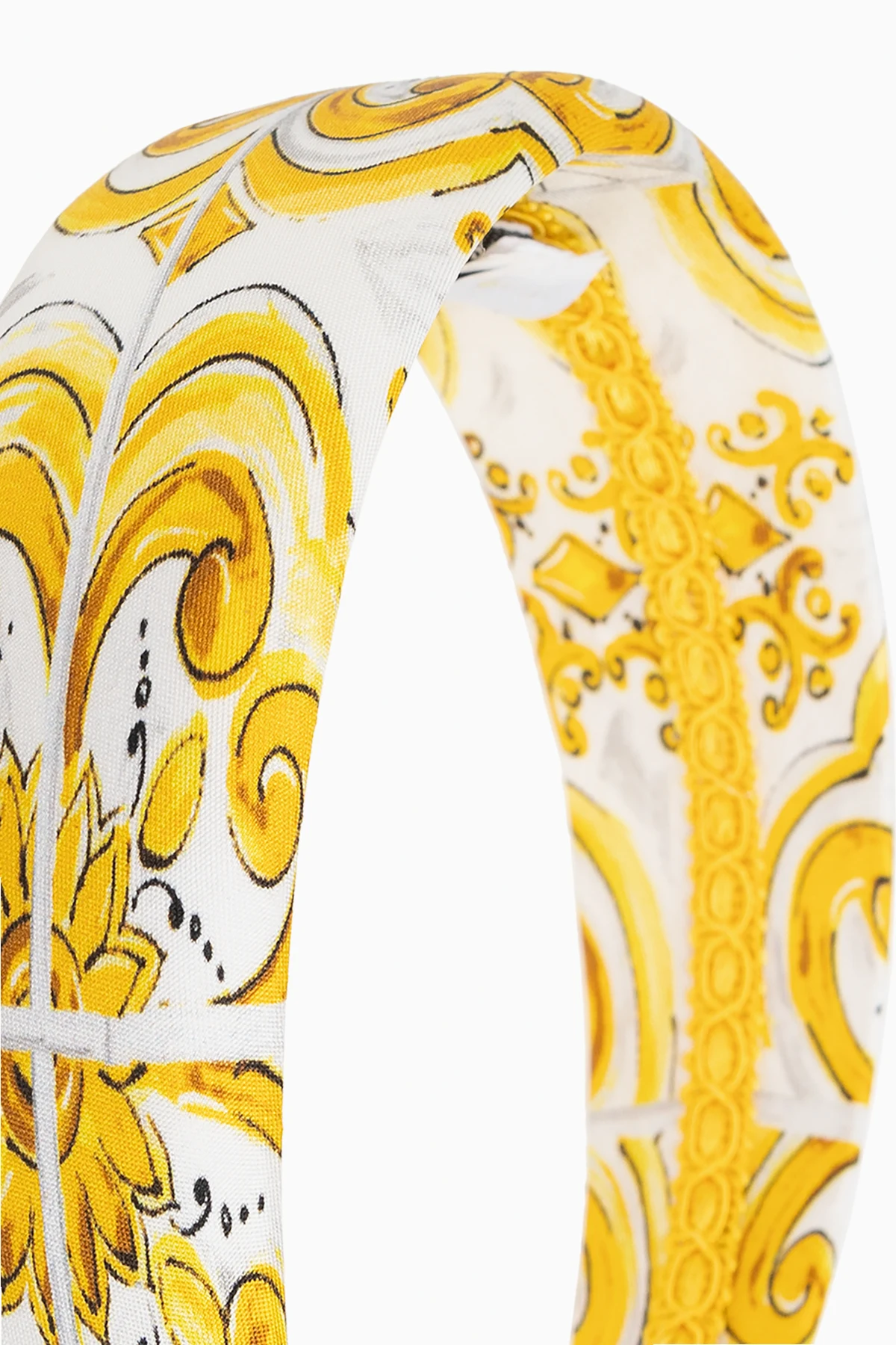 Die vorgestellte Seidenstirnband von Dolce & Gabbana Kids ist die Quintessenz von Luxus und raffiniertem Geschmack. Das Design, dessen dominierende Farben Gelb und Weiß sind, schafft eine harmonische Kulisse für Rokoko-Ornamente und florale Motive. Die Symmetrie des Musters unterstreicht die Sorgfalt, mit der es entworfen wurde, und macht es zu einem Kunstwerk, das auf dem Kopf getragen wird.