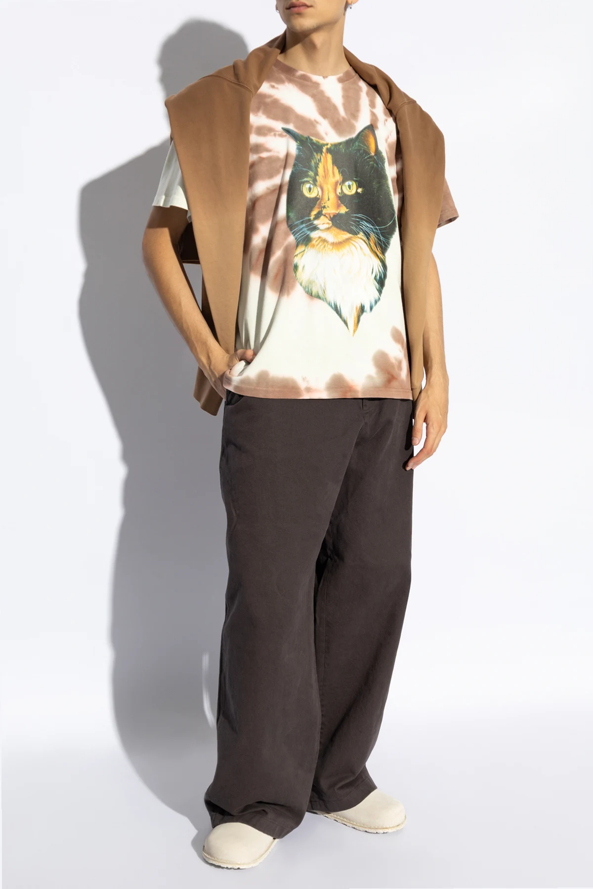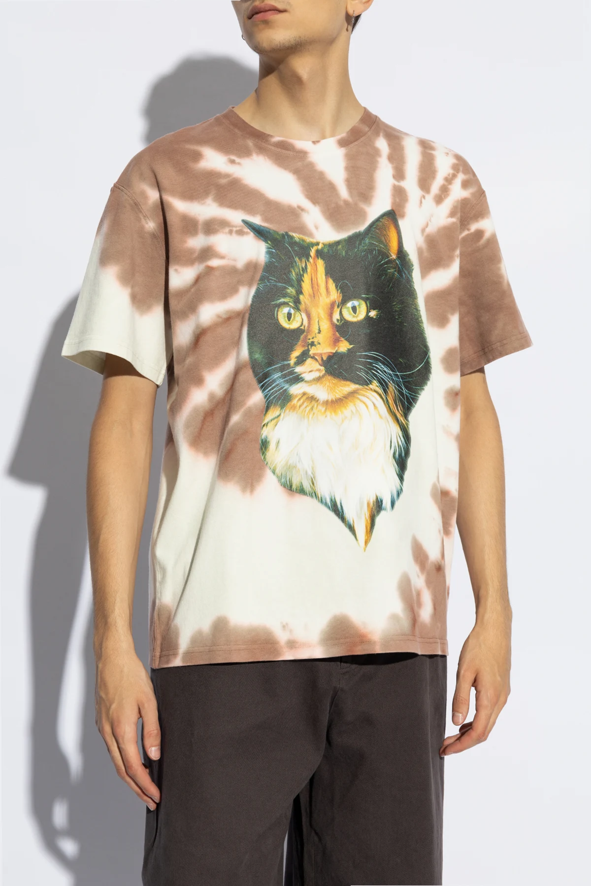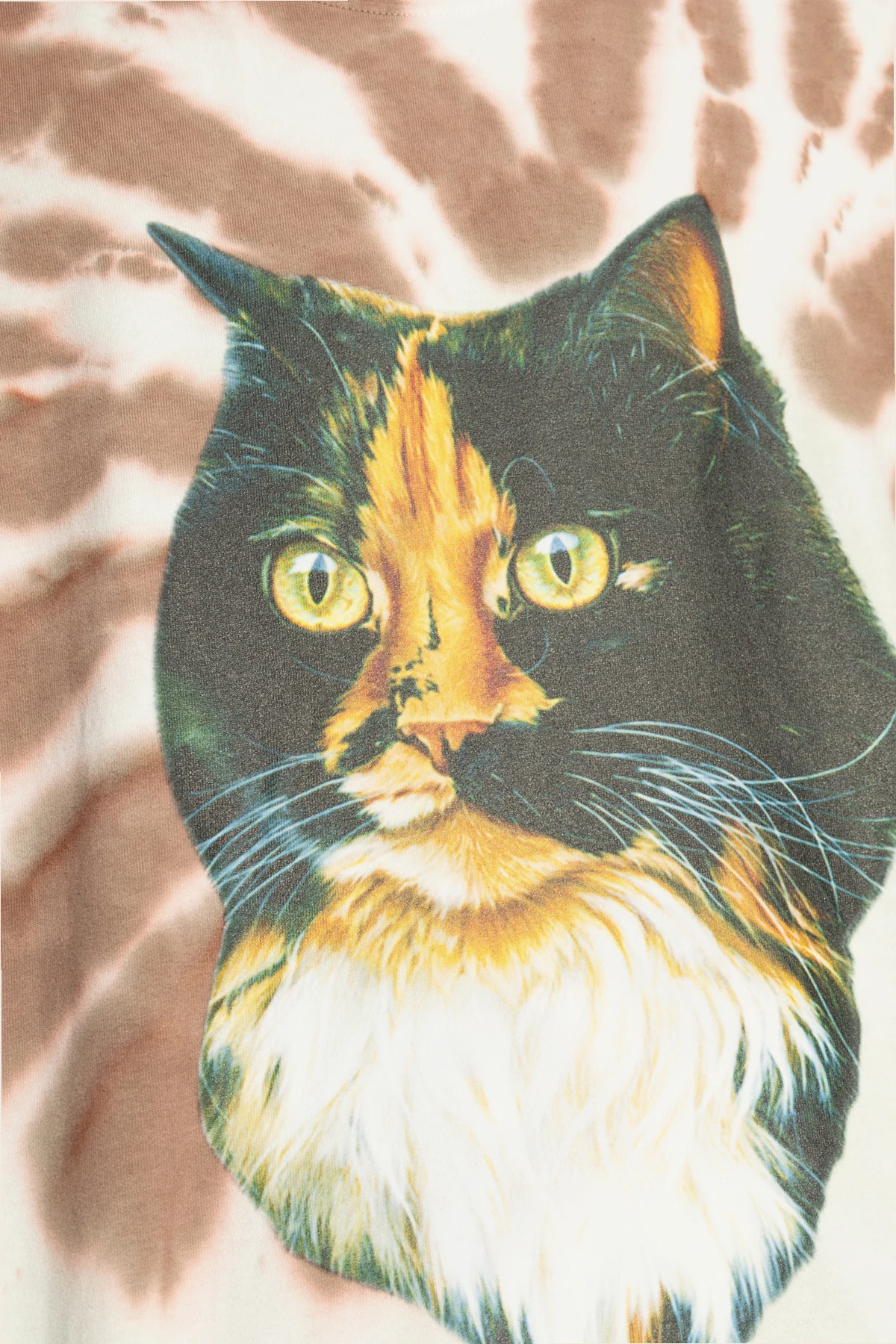 Das T-Shirt zeichnet sich durch einen klassischen, einfachen Schnitt mit kurzen Ärmeln und Rundhalsausschnitt (Crew Neck) aus. Auf der Vorderseite befindet sich ein großer Aufdruck, der ein realistisches Bild einer Katze mit intensiv grünen Augen und vielfarbigem Fell darstellt. Das Tie-Dye-Muster in Braun- und Cremetönen verleiht ihr ein einzigartiges Aussehen, das alle Blicke auf sich zieht.