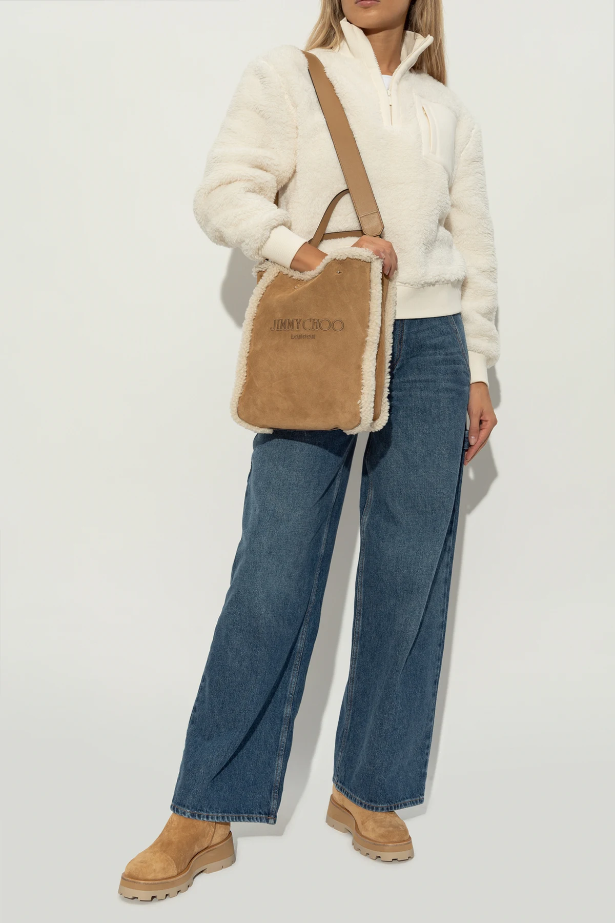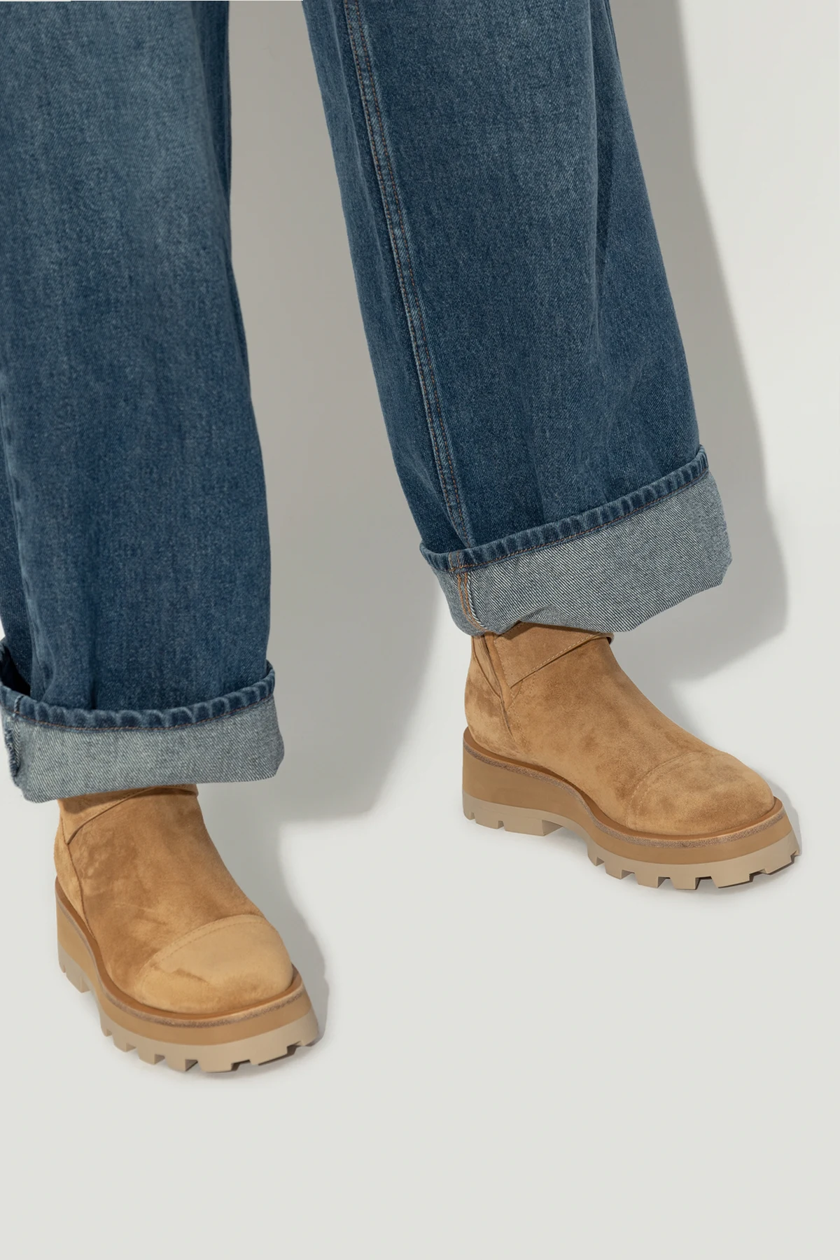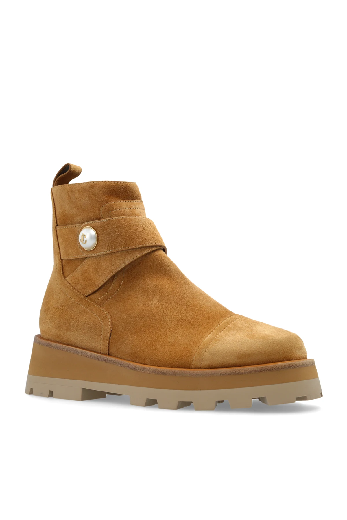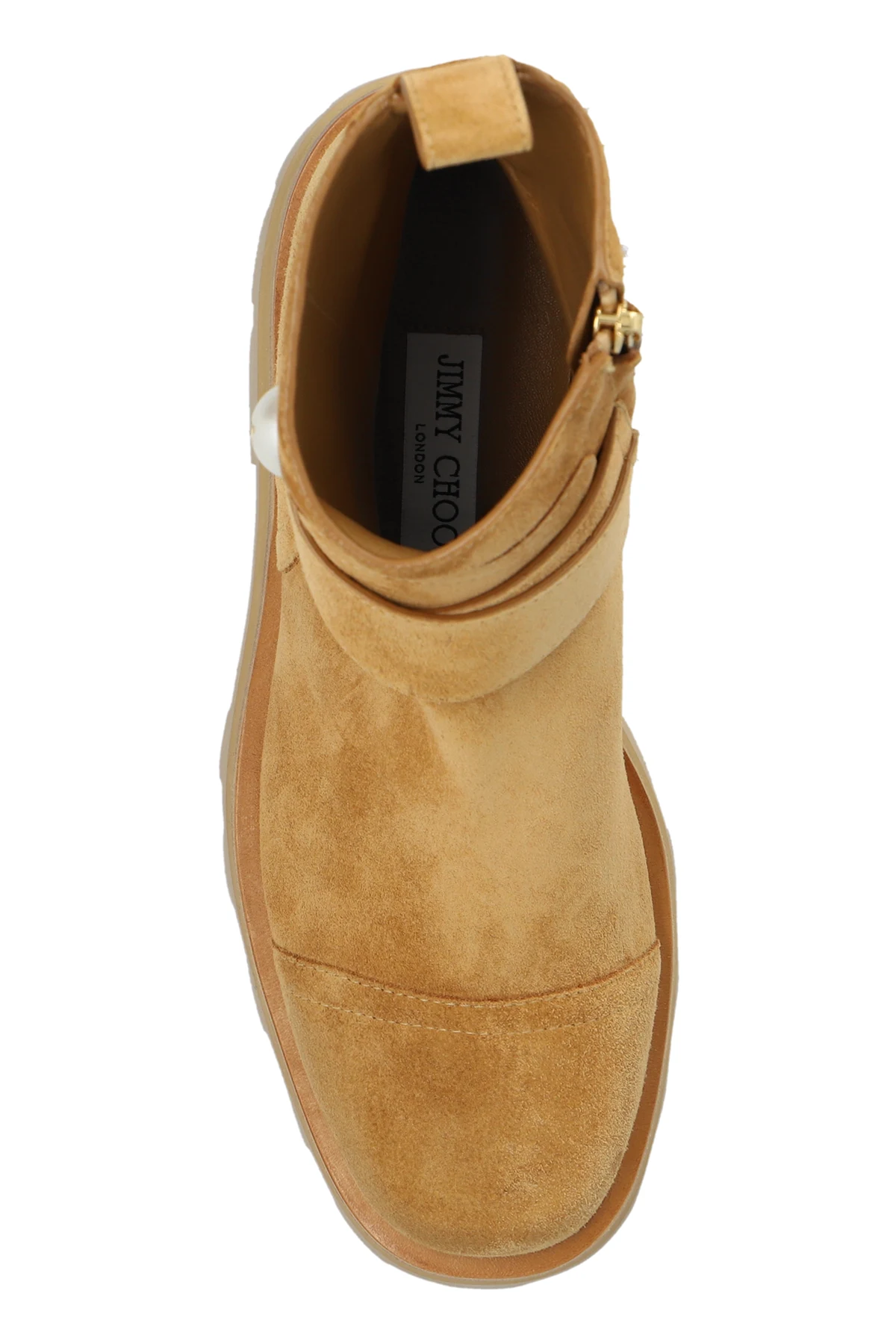 Wir präsentieren die Knöchelstiefel Meena aus der exklusiven Bekleidungskollektion von Jimmy Choo . Diese eleganten Stiefel sind aus hochwertigem braunem Wildleder gefertigt, das ihnen ein luxuriöses und raffiniertes Aussehen verleiht. Die dominierende Farbe ist ein warmer, heller Braunton, der sich perfekt mit verschiedenen Outfits kombinieren lässt.