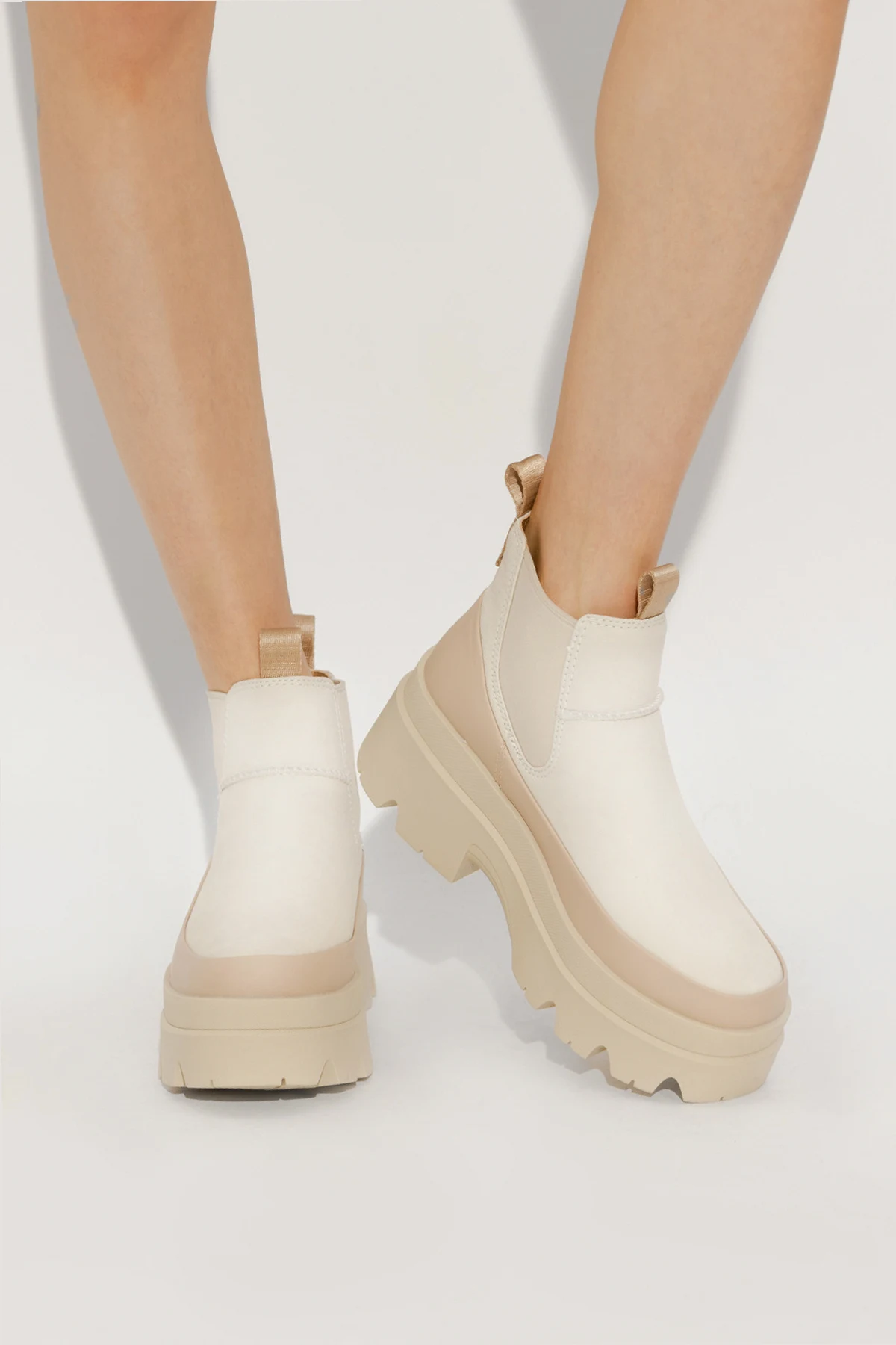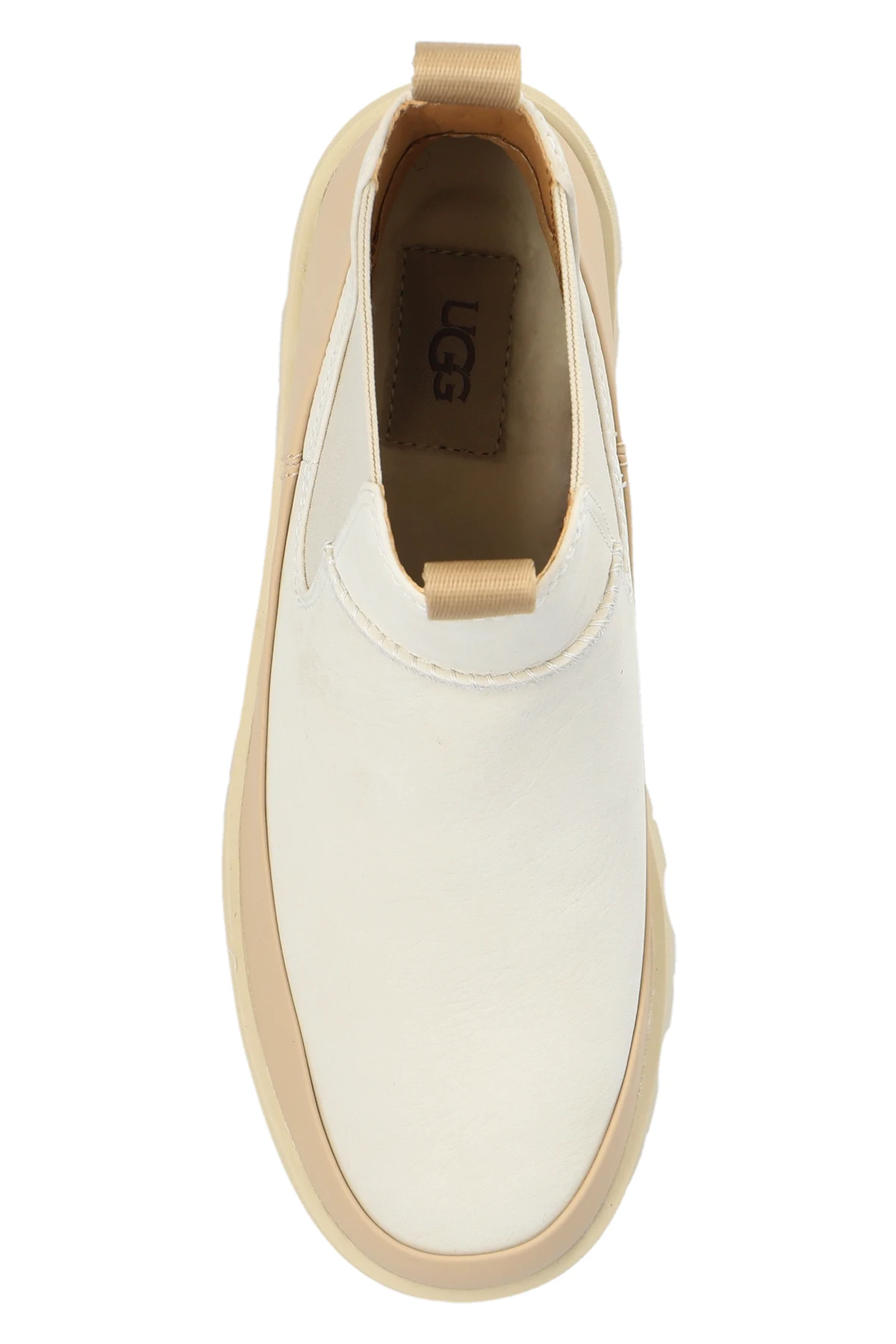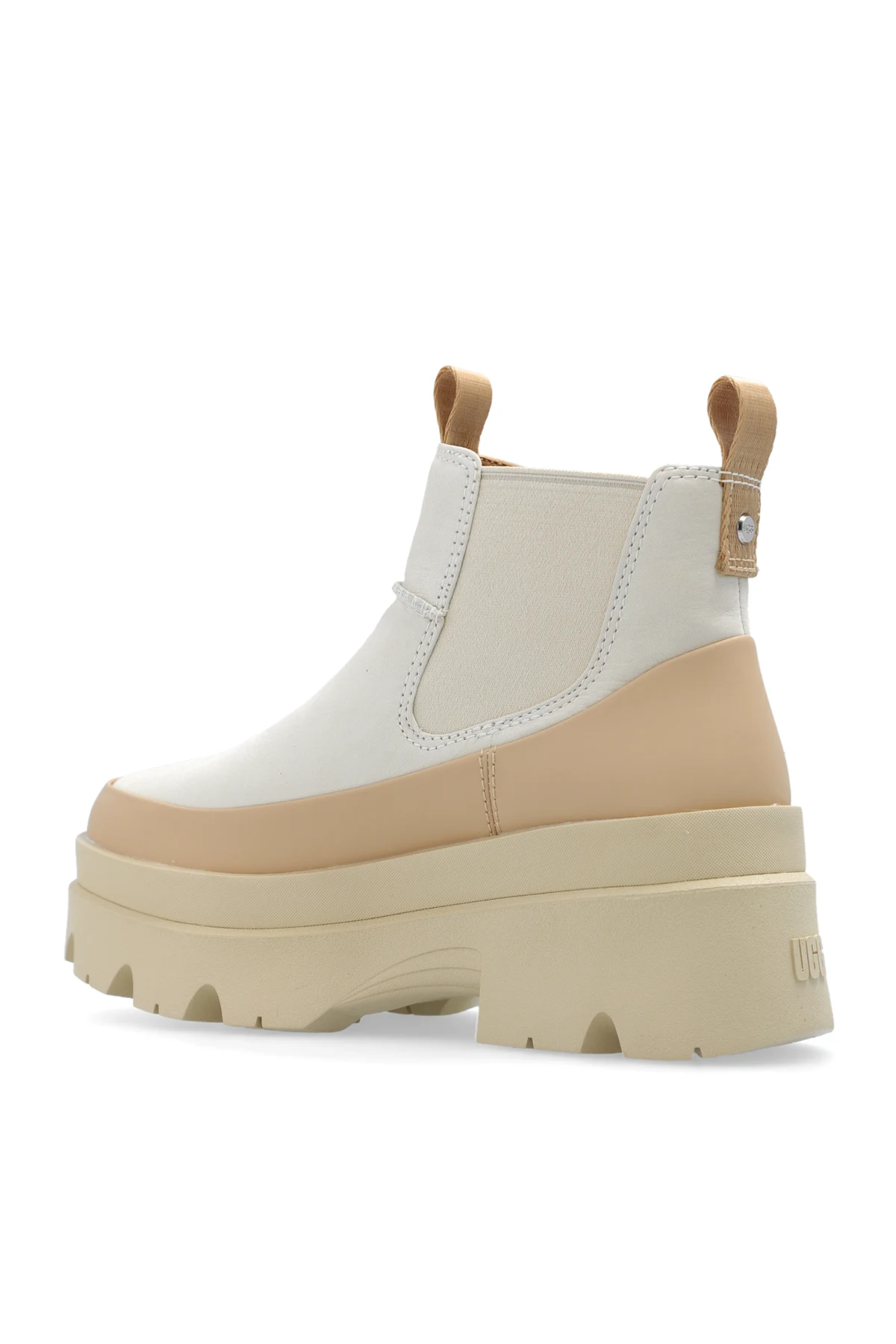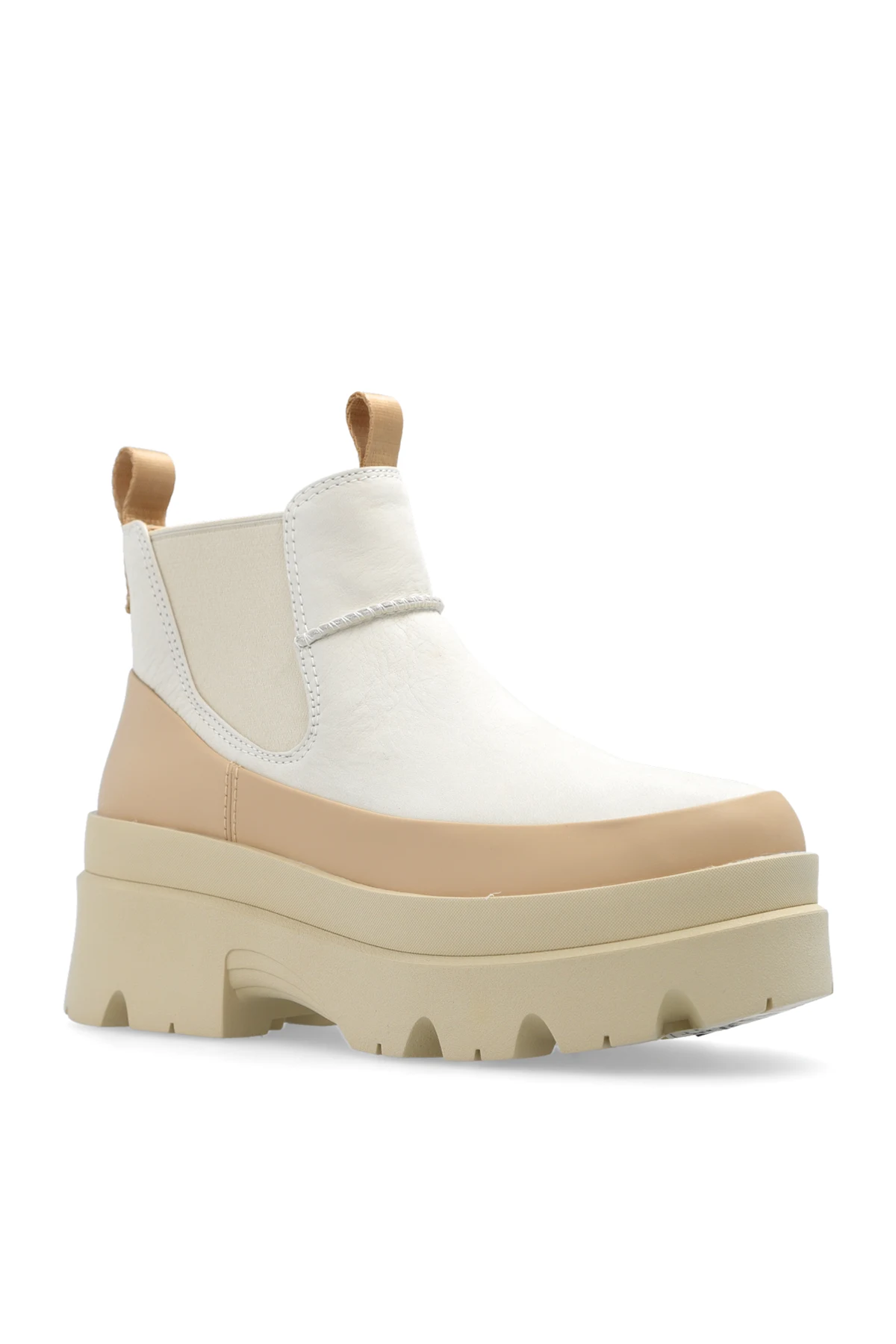 Cream and beige ‘Brisbane’ ankle boots from UGG. Made of leather and trimmed with rubber, this model sits on a cream rubber sole and features a silver-tone metal plaque with an engraved logo, pull tabs on the front and back, elastic panels on the sides, and the UGGPlush™ insole.