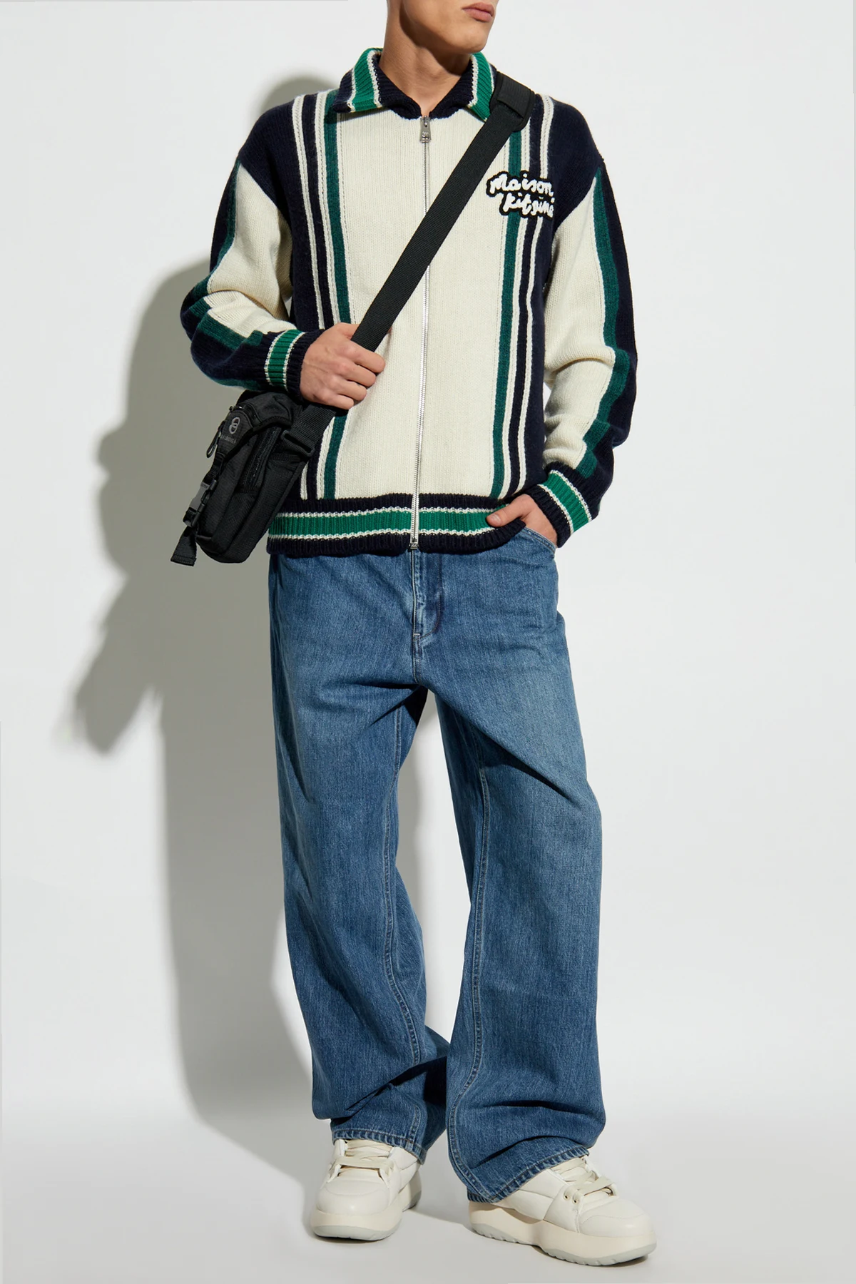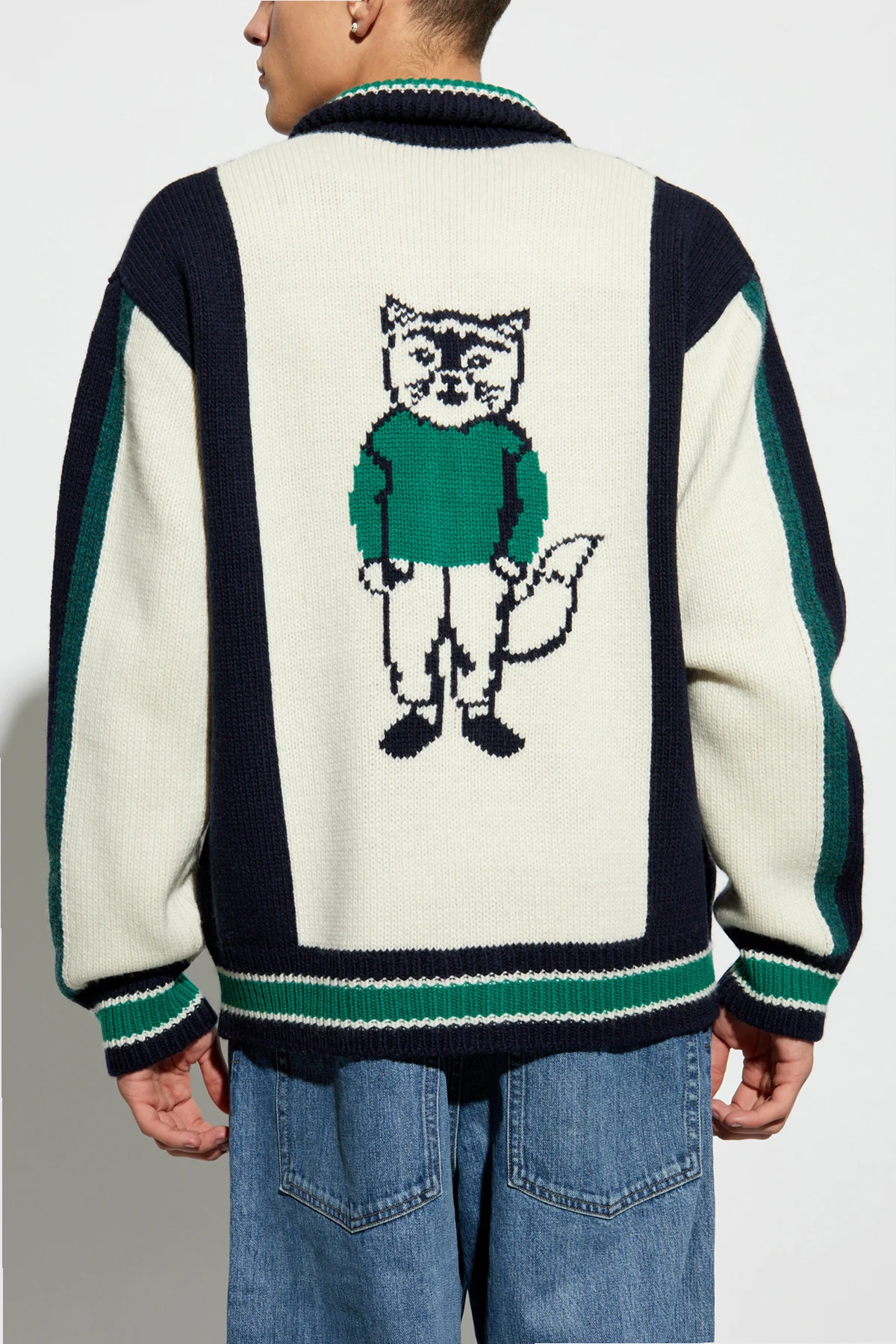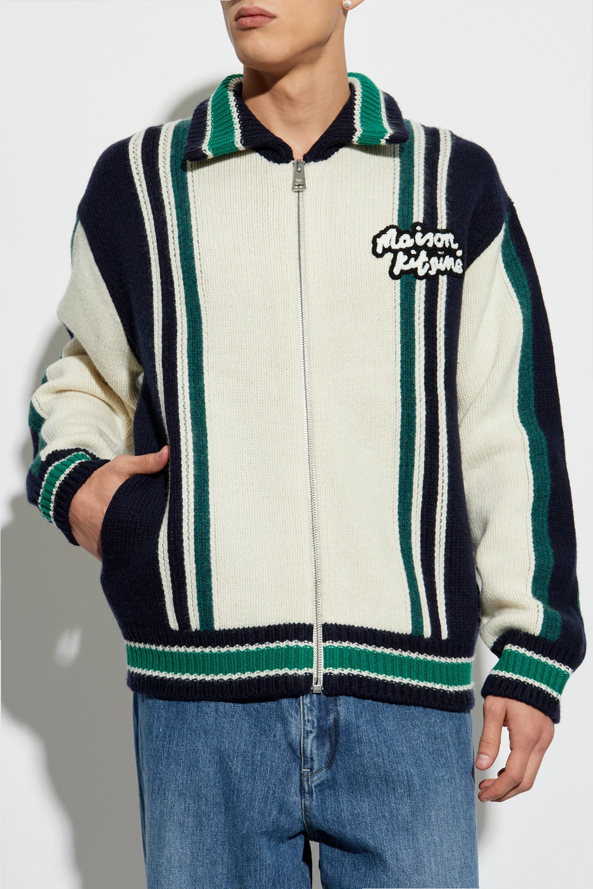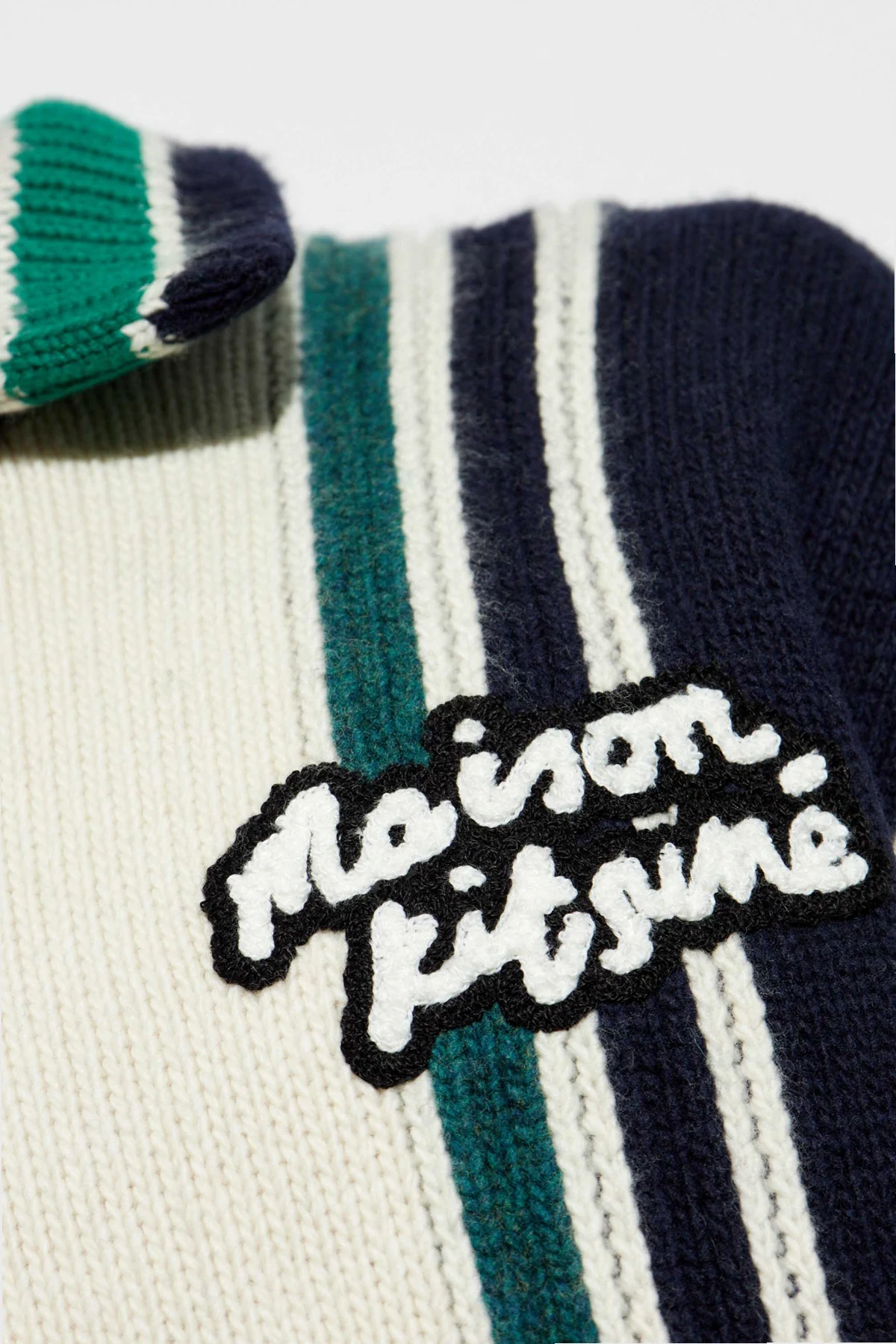 Wir präsentieren die Wollstrickjacke der exklusiven Marke Maison Kitsuné, die die Essenz von modernem Design und klassischen Elementen verkörpert. Dieses außergewöhnliche Kleidungsstück fasziniert mit seiner eleganten Farbgebung - tiefes Weiß durchzogen mit dunkelblauen und grünen Streifen, die harmonisch durch Streifen an Ärmeln, Saum und Kragen ergänzt werden.