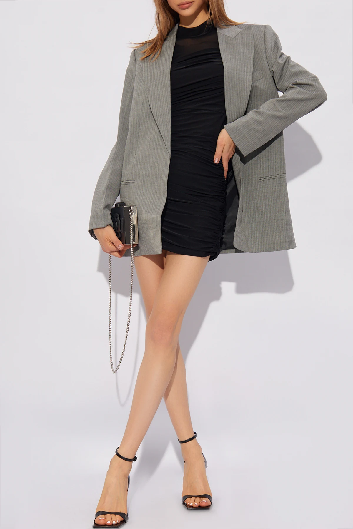 Black dress with a standing collar from Helmut Lang. Distinguished by draping, this style features long sleeves and a semi-sheer bodice.