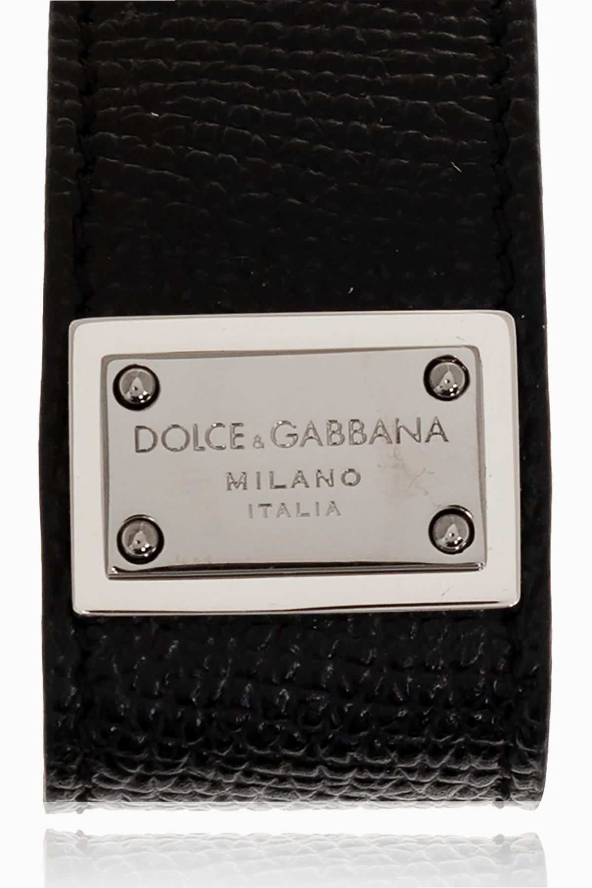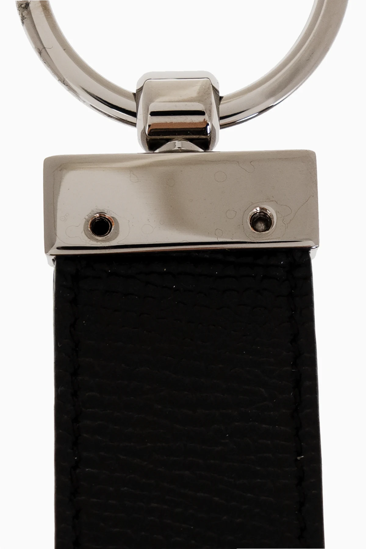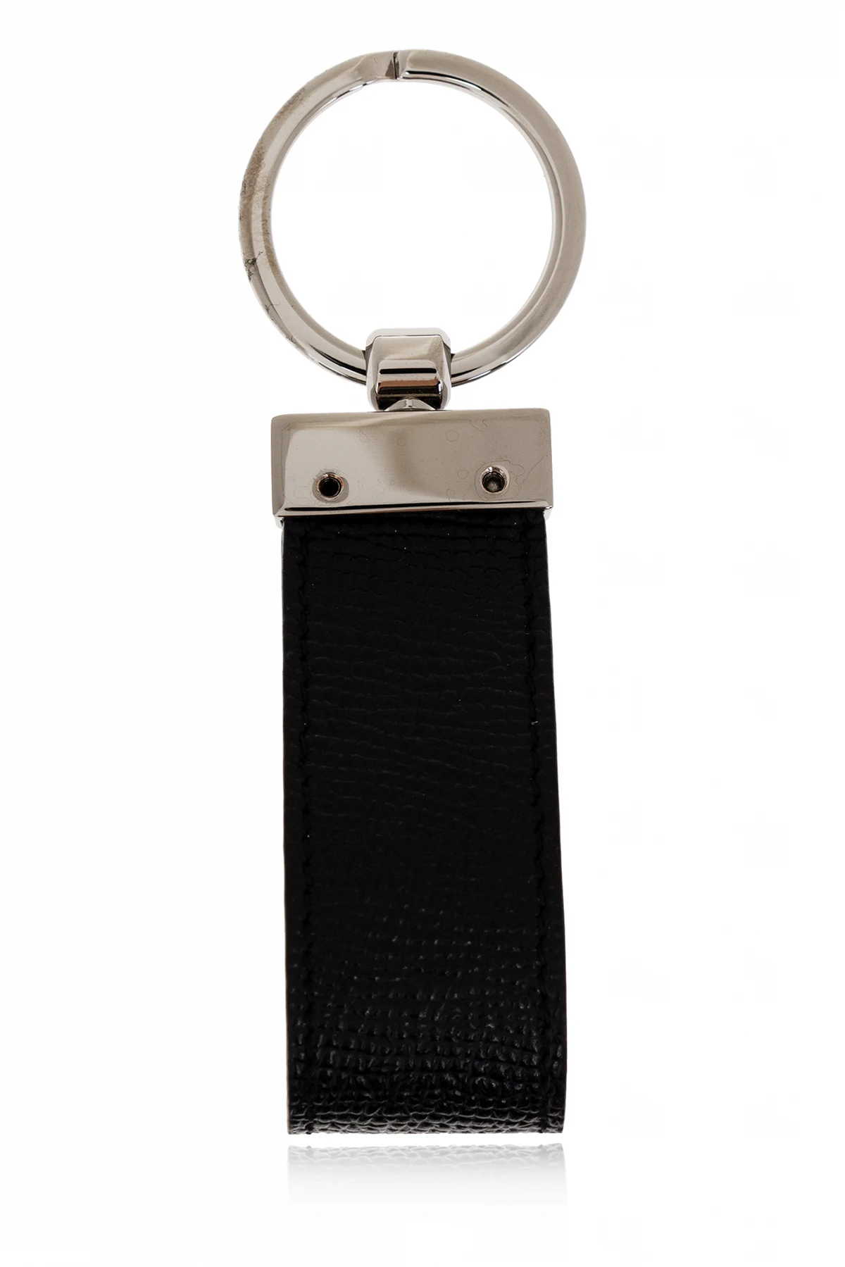 Silver-tone keyring with a black leather pendant and logo-engraved patch from Dolce & Gabbana.