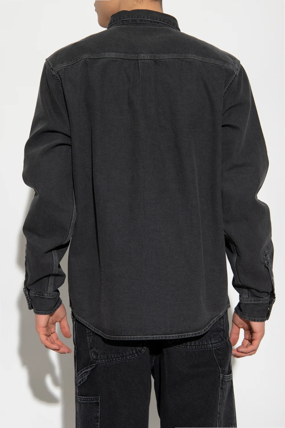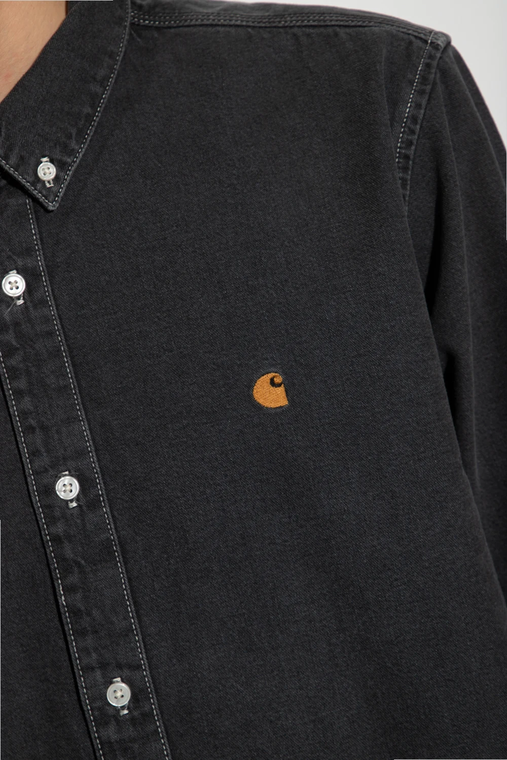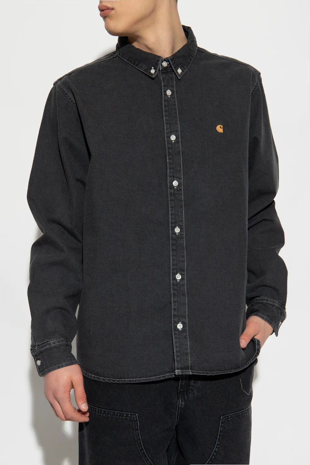 Dark grey ‘Weldon’ denim shirt from Carhartt WIP. Cut with a relaxed fit, this style fastens with buttons and showcases an embroidered logo and long sleeves with buttoned cuffs.