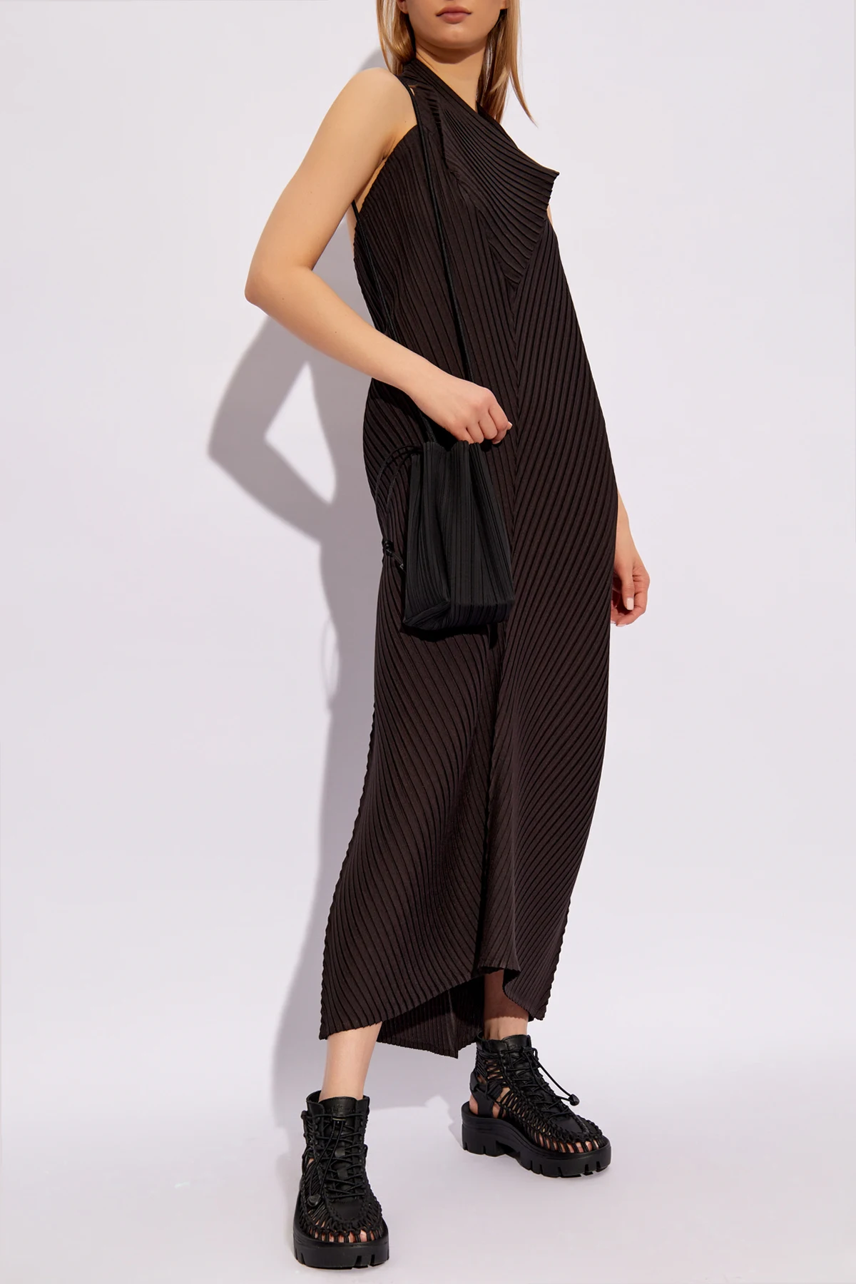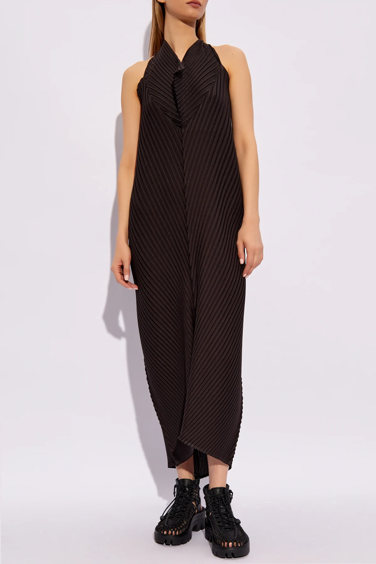 Die Anwendung einer einzigartigen Plissiertechnik verleiht dem Kleid Struktur und Tiefe, während es die Figur durch vertikale Linien schlanker wirken lässt. Der leichte und luftige Stoff mit einem zarten Schimmer unterstreicht den exklusiven Charakter der Kreation und bietet einen außergewöhnlichen Tragekomfort.