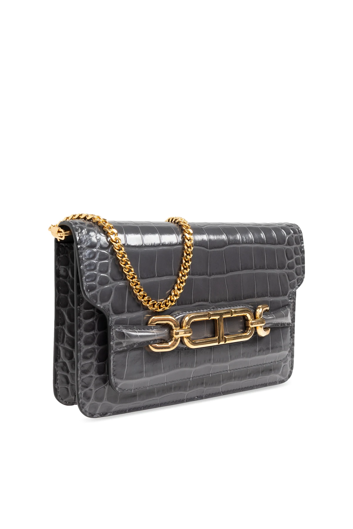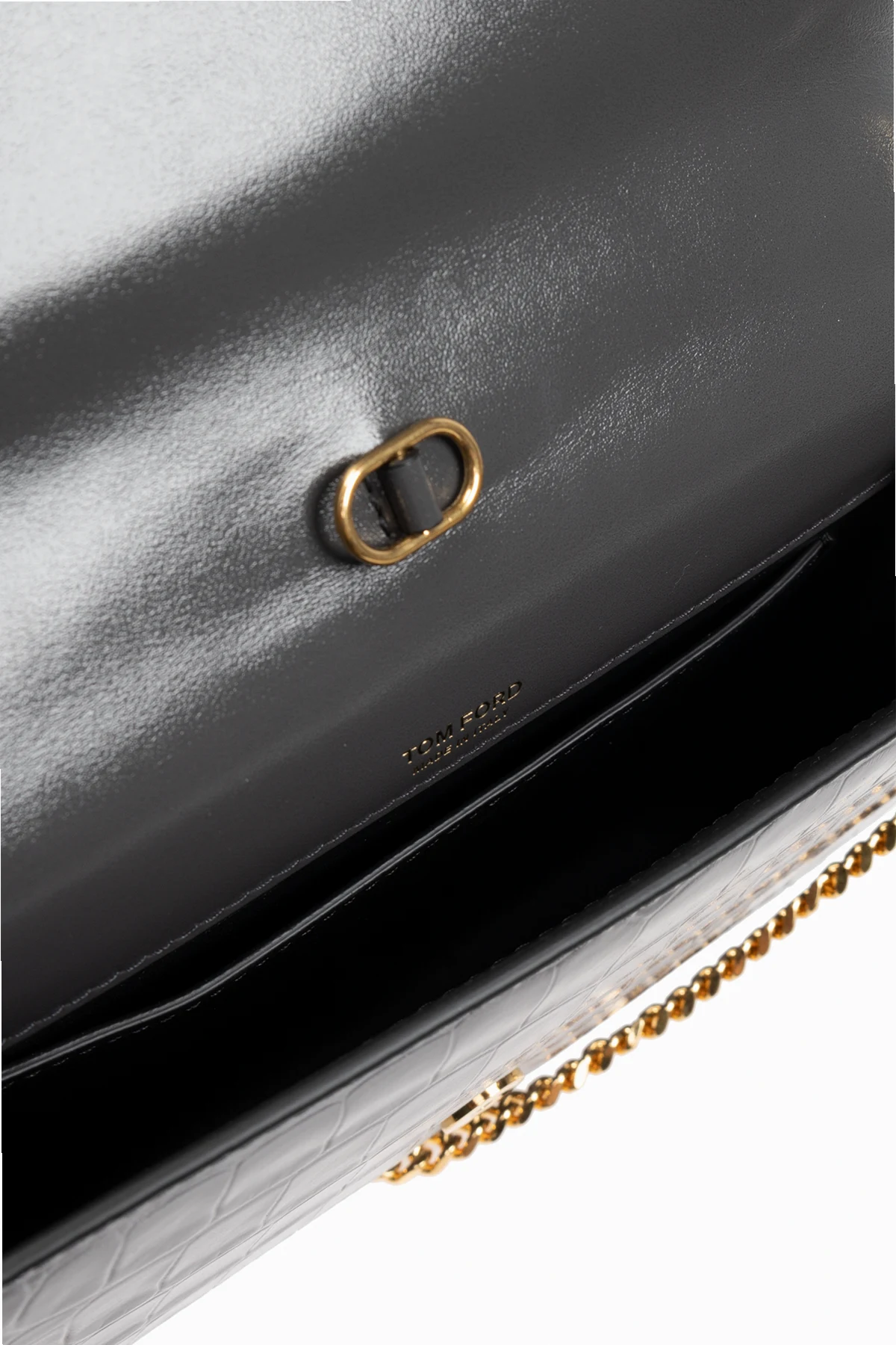 Eine goldene Kette dient als Schulterriemen und verleiht der Tasche ein luxuriöses Aussehen.