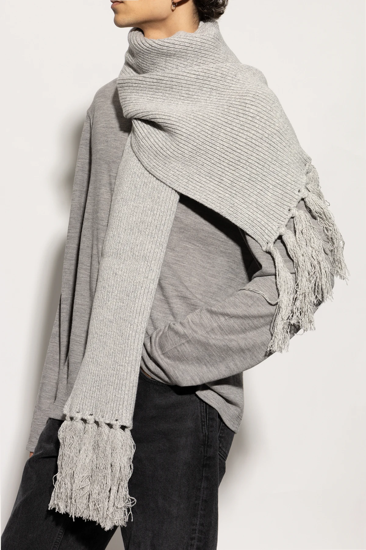 Wir präsentieren den eleganten Schal mit Fransen der Marke Officine Generale . Hergestellt aus hochwertiger Wolle, ist dieses graue Accessoire die Essenz von Luxus und raffiniertem Stil.