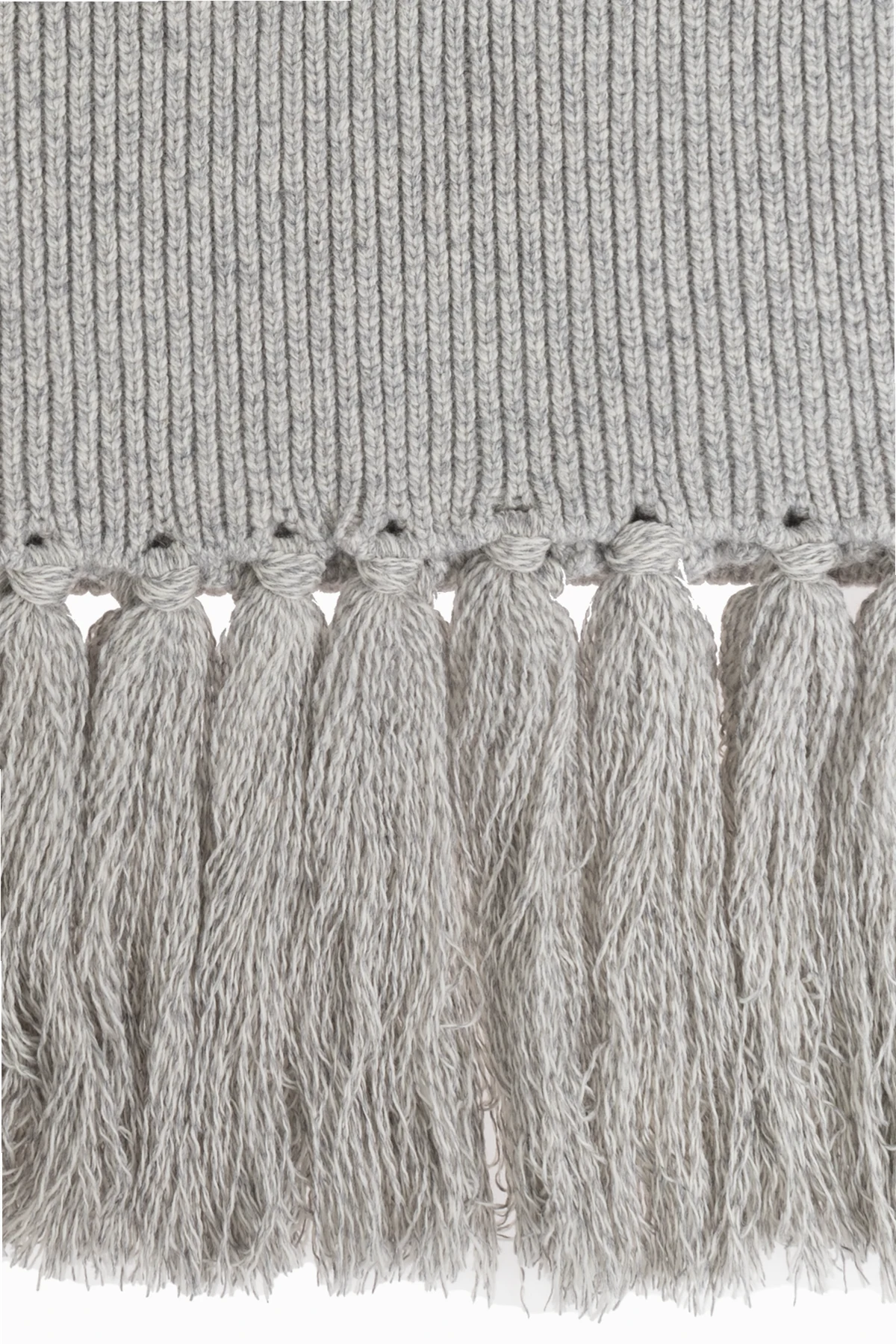 Die Struktur des Schals begeistert mit einem regelmäßigen, gerippten Muster, das ihm subtile Eleganz verleiht. Lange und dichte Fransen, sorgfältig an einem Ende befestigt, betonen seinen exklusiven Charakter.
