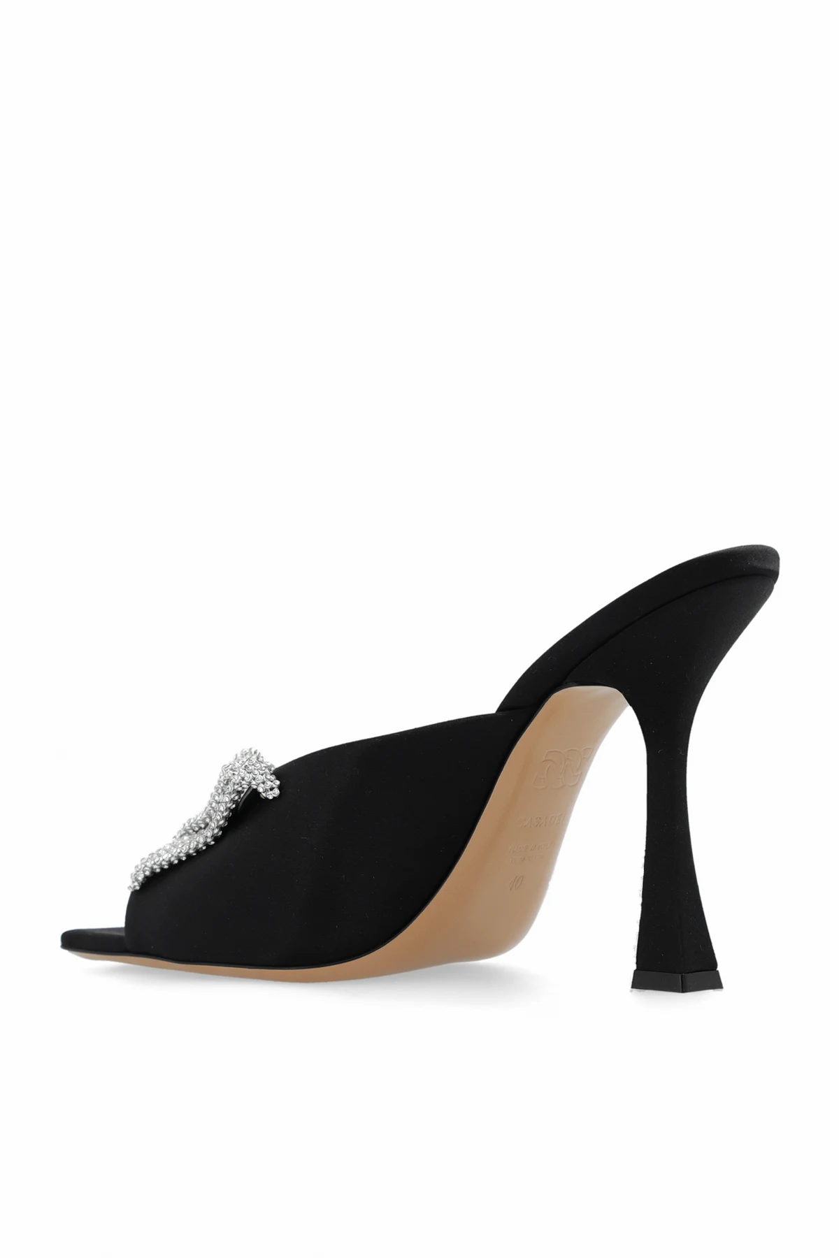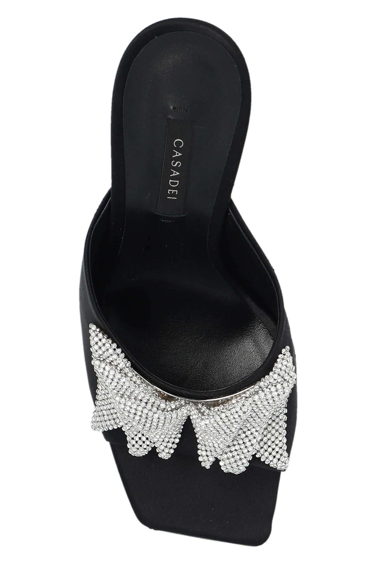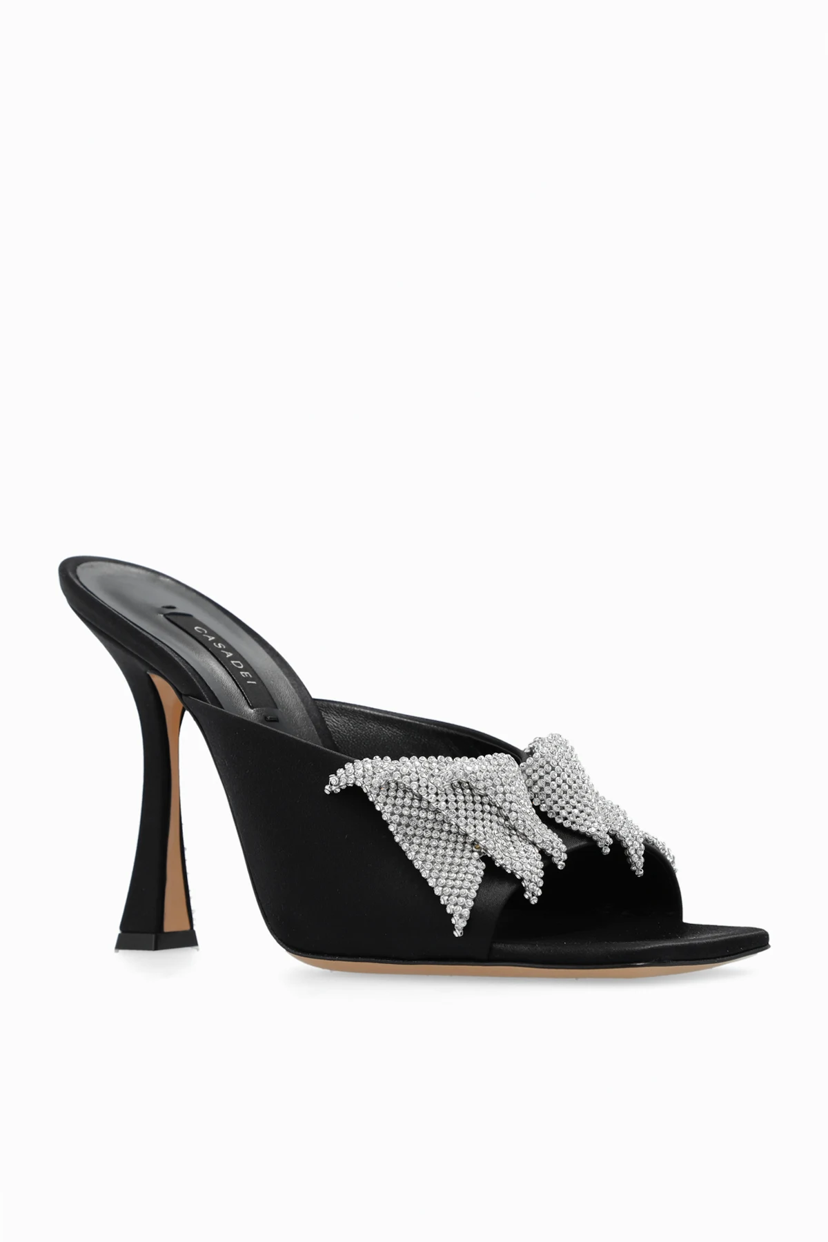 Black ‘Butterfly Geraldine’ heeled mules from Casadei. Crafted from silk satin, this pair features a bow embellished with crystals, square toe and beige leather sole.