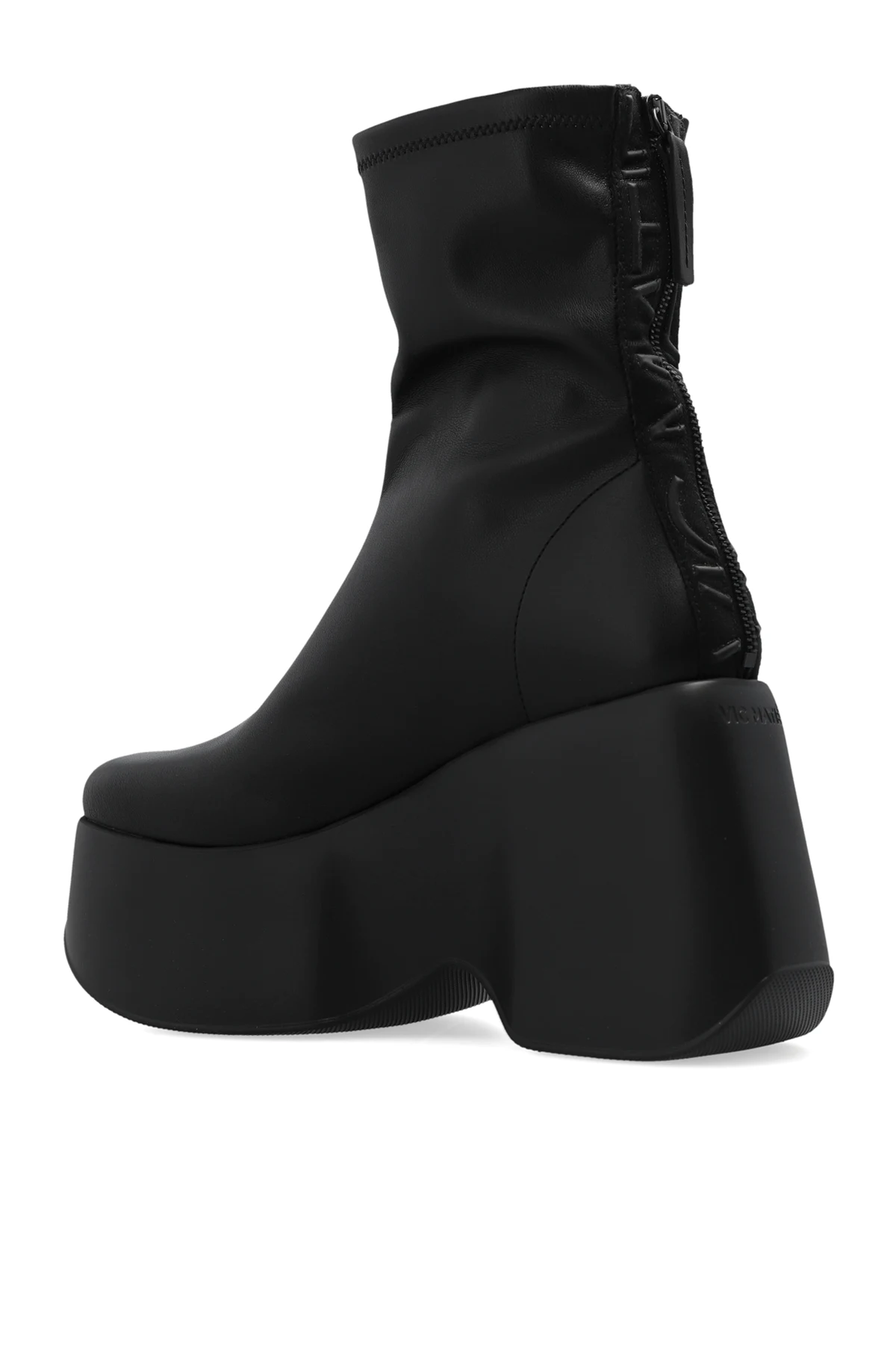 Black platform ankle boots from Vic Matie. Made of faux leather, this pair features zip fastening at the back, logo detail, rounded toe and black rubber sole.