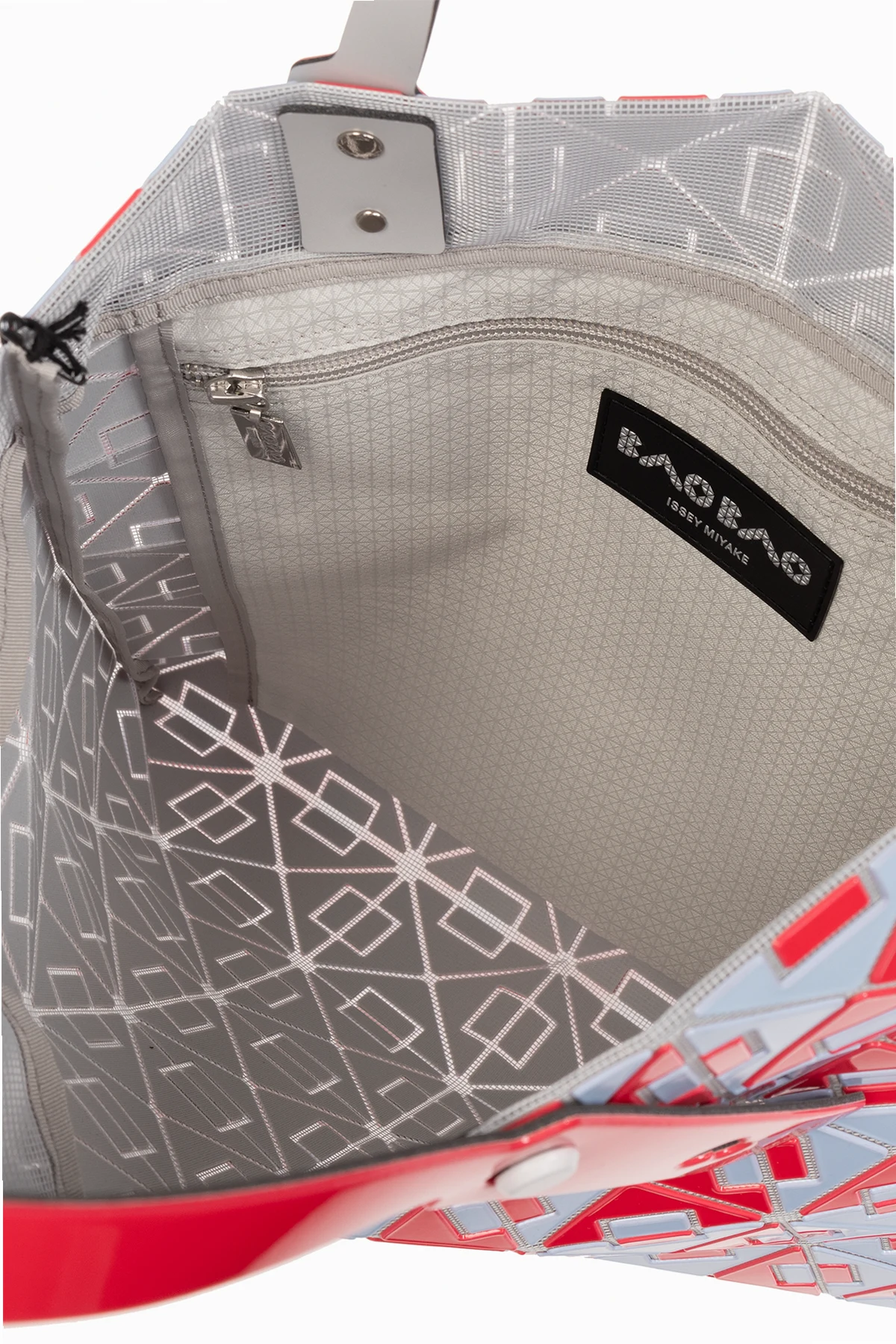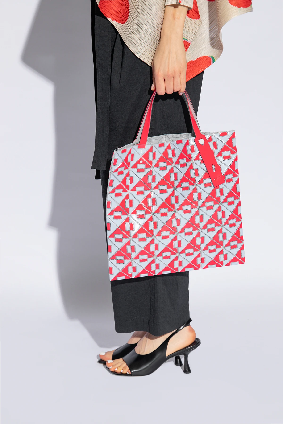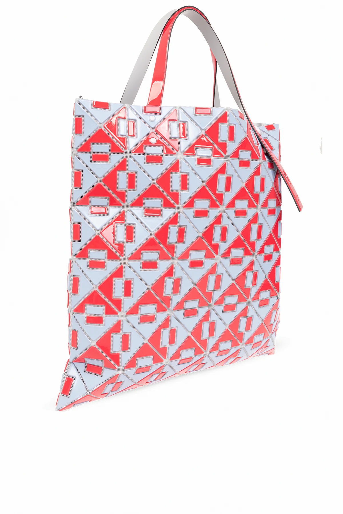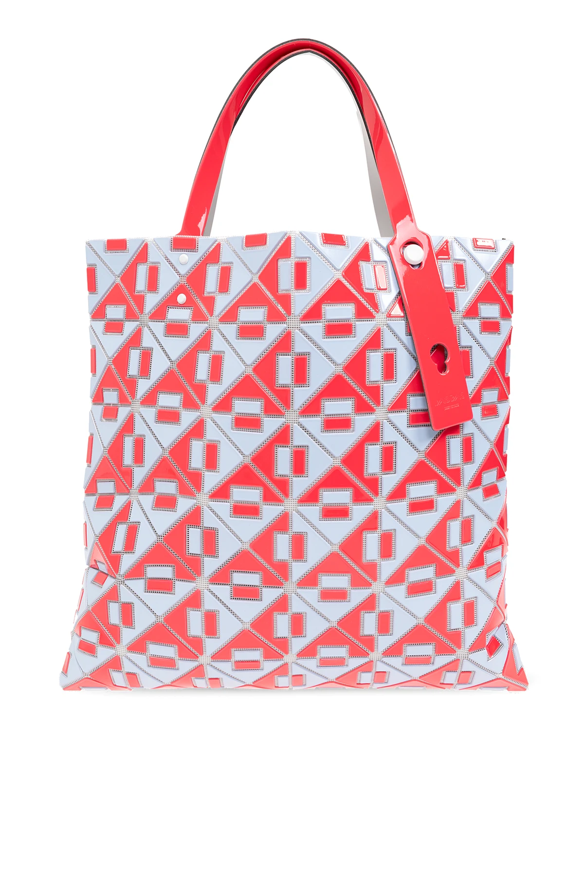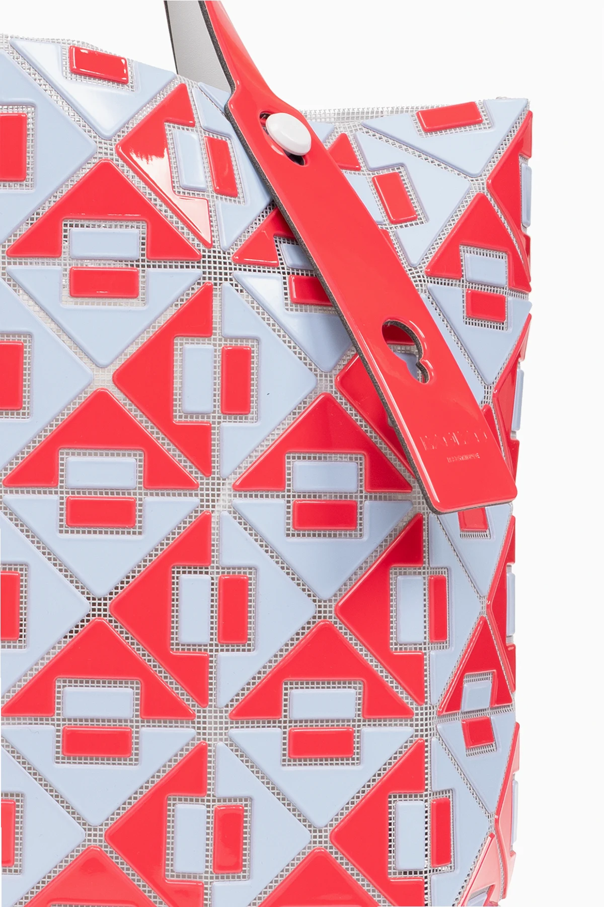Blue, red and grey ‘Connect’ shopper bag from Issey Miyake Bao Bao. Made from material covered with a series of rubber applications creating a shiny, geometrical pattern, this design features two half-round handles and one internal compartment with a zip pocket.