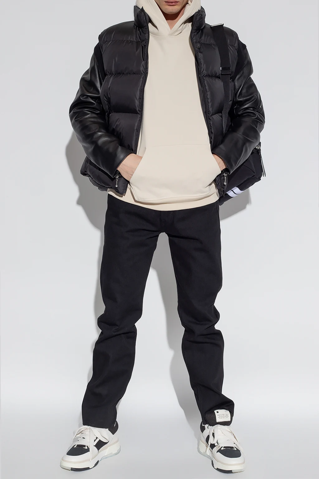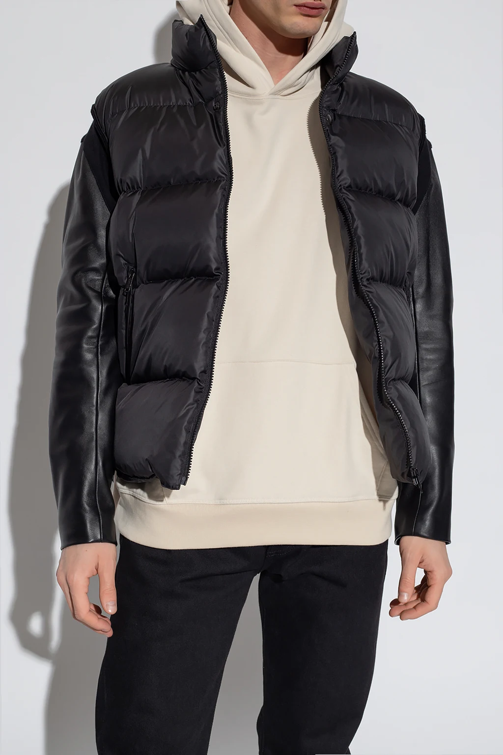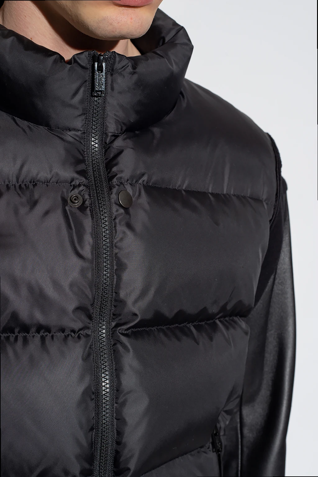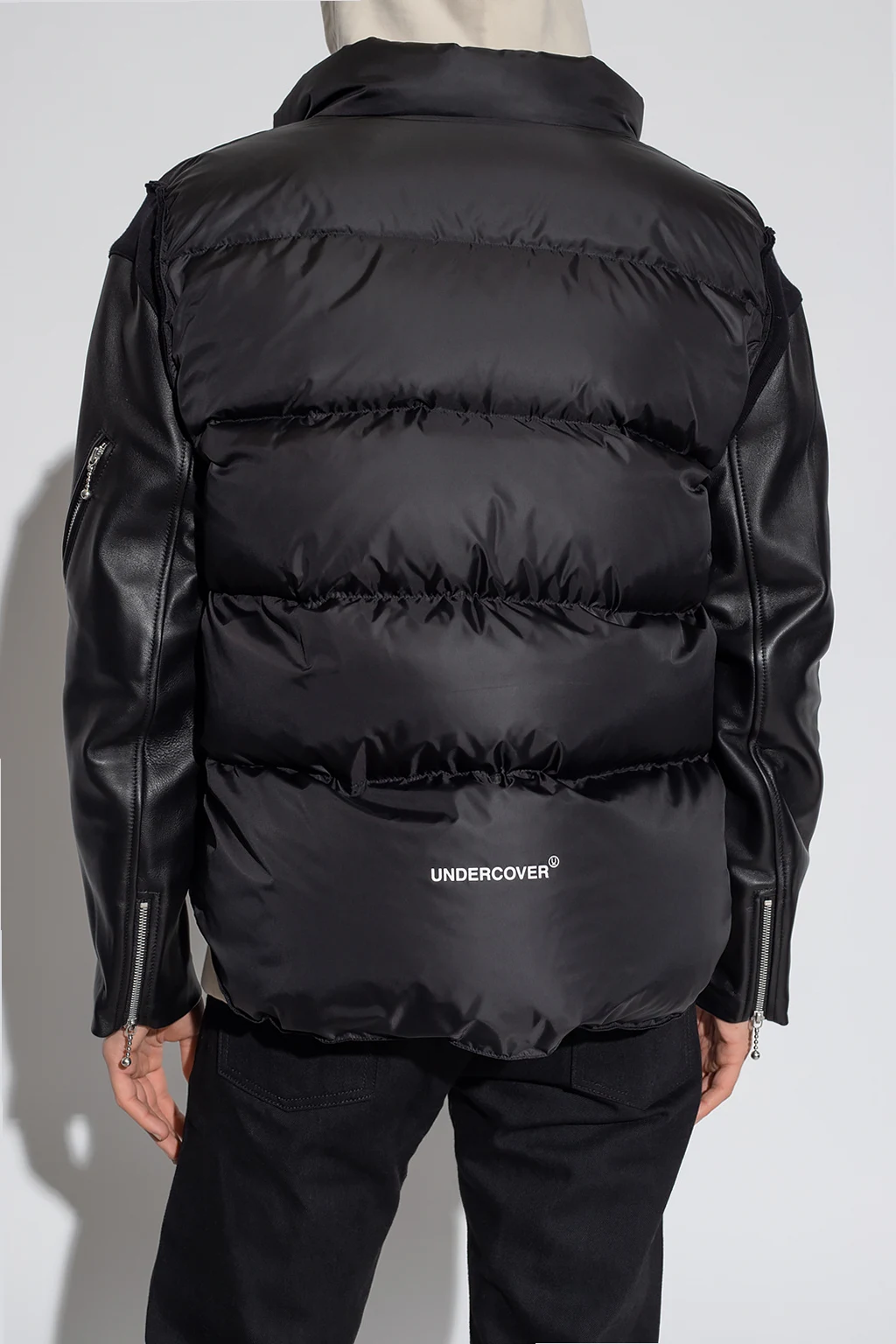 Black quilted down jacket from Undercover. Printed at back with a white logo, this style features a zip fastening, a standing collar, a slightly elongated back hem, three zip pockets: two on the front and one on the sleeve, and leather sleeves with zip cuffs.