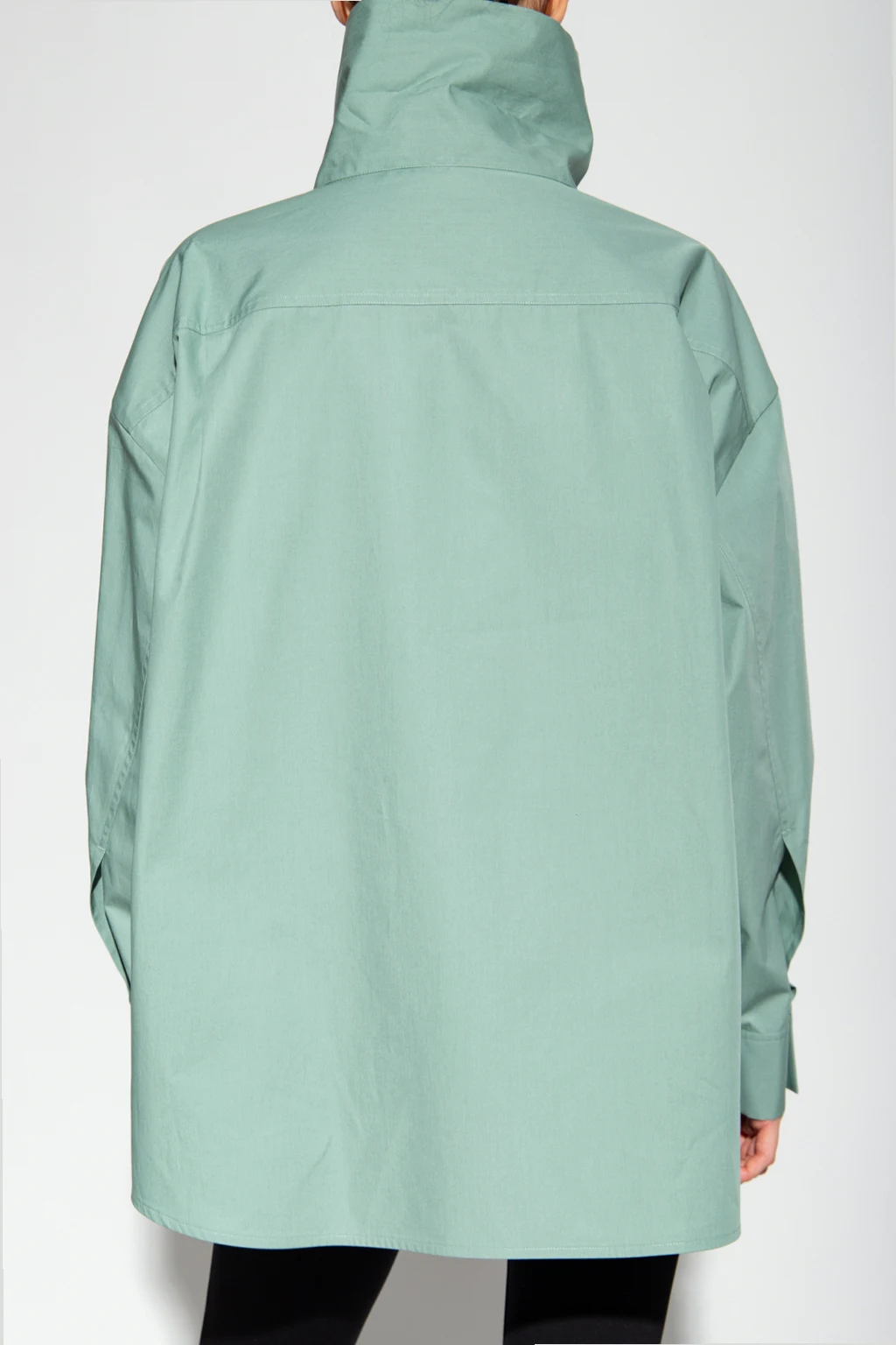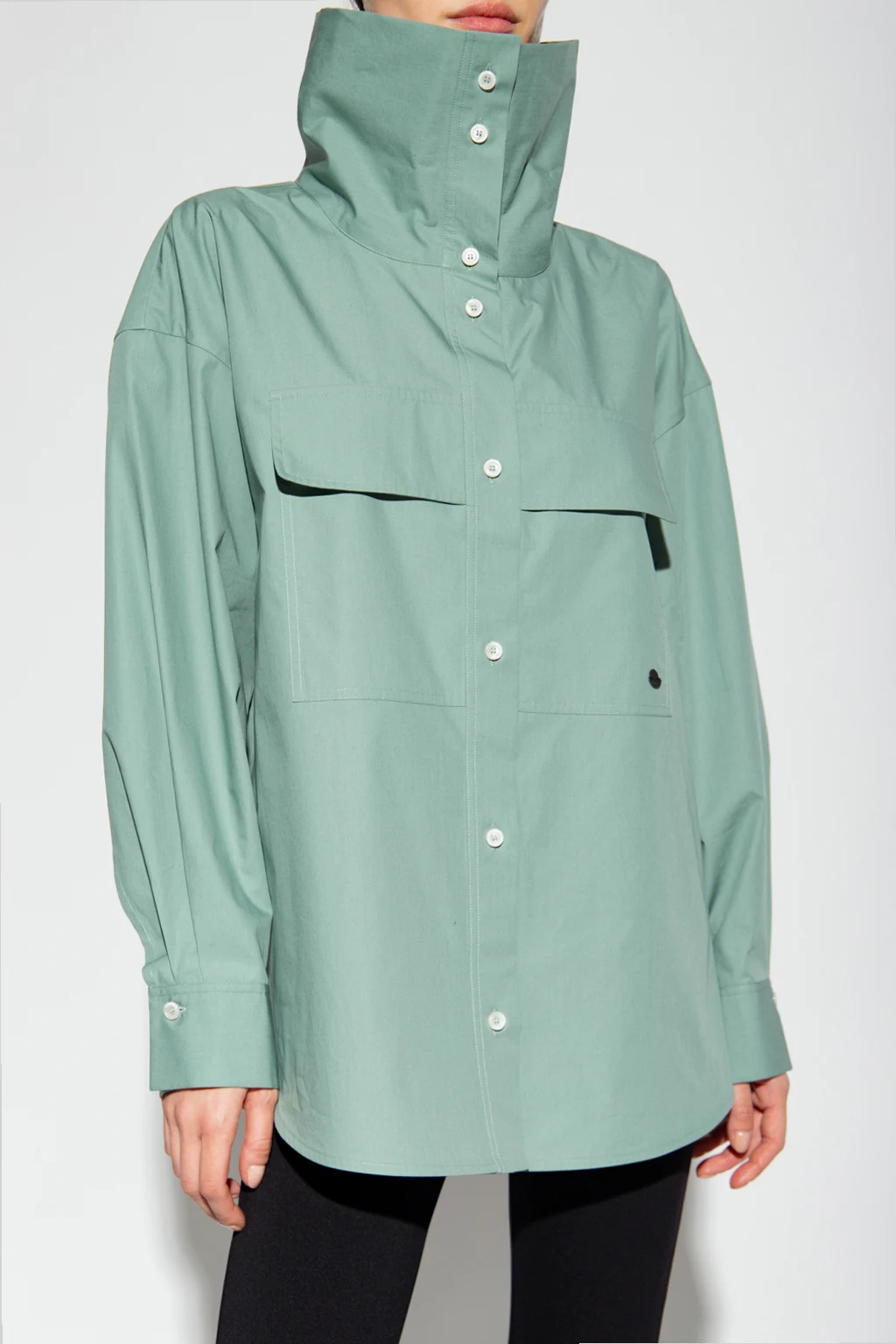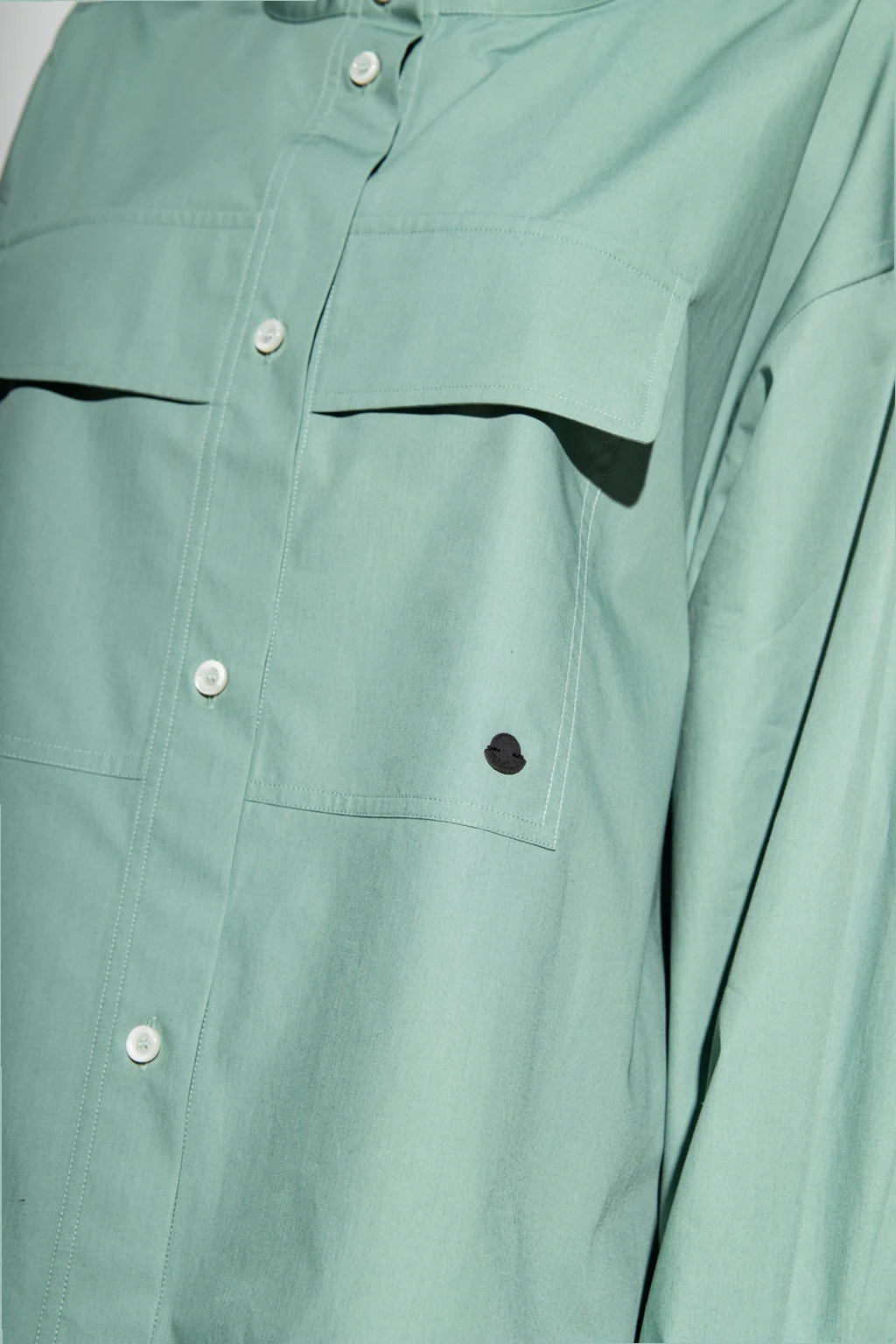 Light green shirt from Moncler Genius, the ’2 Moncler 1952’ collection. Crafted from cotton, this loose-fitting design features button fastenings, stand collar, black logo patch, two buttoned flap pockets and long sleeves with banded cuffs.