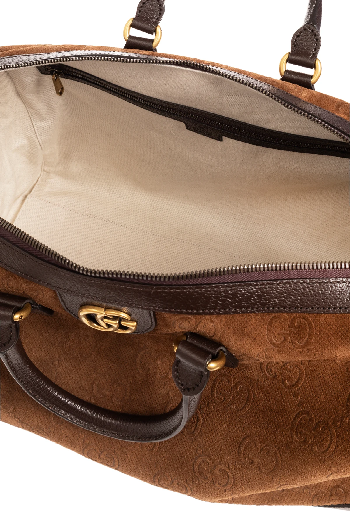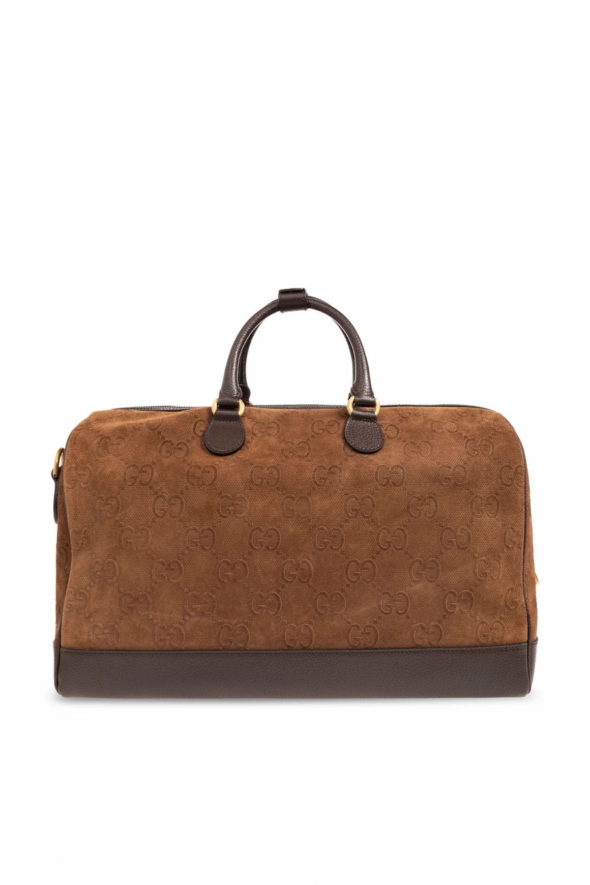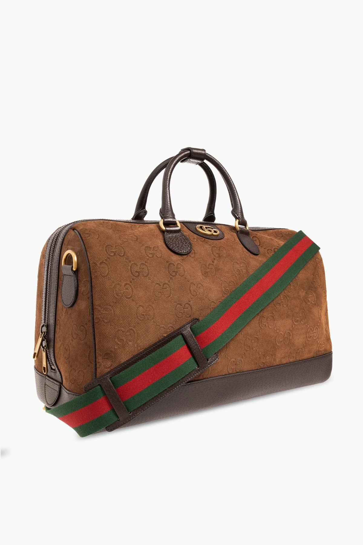 Brown duffel bag from Gucci. Made from suede and leather, this design fastens via a two-way zip and showcases an embossed monogram pattern and ‘Double G’ hardware on the front. It is complete with a detachable and adjustable shoulder strap with a green-red-green ‘Web’ motif, two half-round handles connected via a snap, gold-tone metal elements and one internal compartment with two zip pockets. Comes with two charms: an ID tag with keys and a padlock pendant.