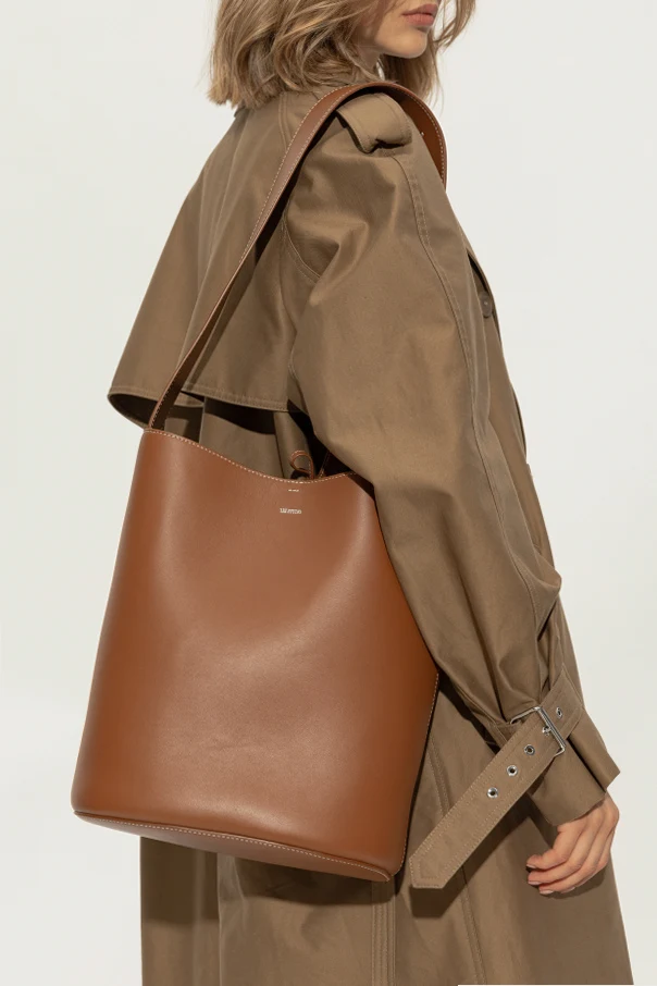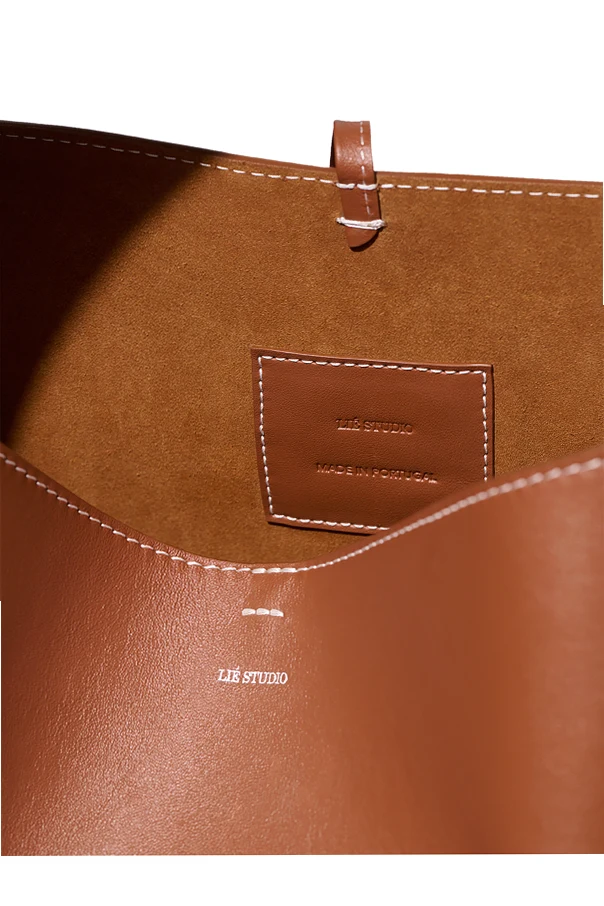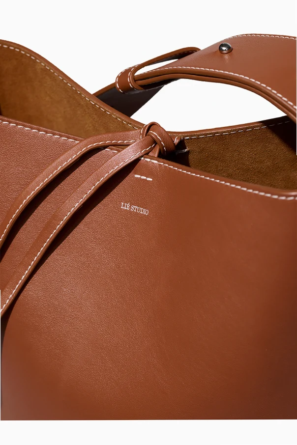 Hergestellt aus hochwertigem, glattem Leder, besticht sie durch subtile Eleganz und luxuriöses Aussehen. Die dominante braune Farbe der Tasche macht sie zu einem vielseitigen Accessoire für jedes Outfit. Auf der Vorderseite der Tasche befindet sich ein dezentes, weißes Logo des Designers "LĒ STUDIOS", das ihre Exklusivität unterstreicht.