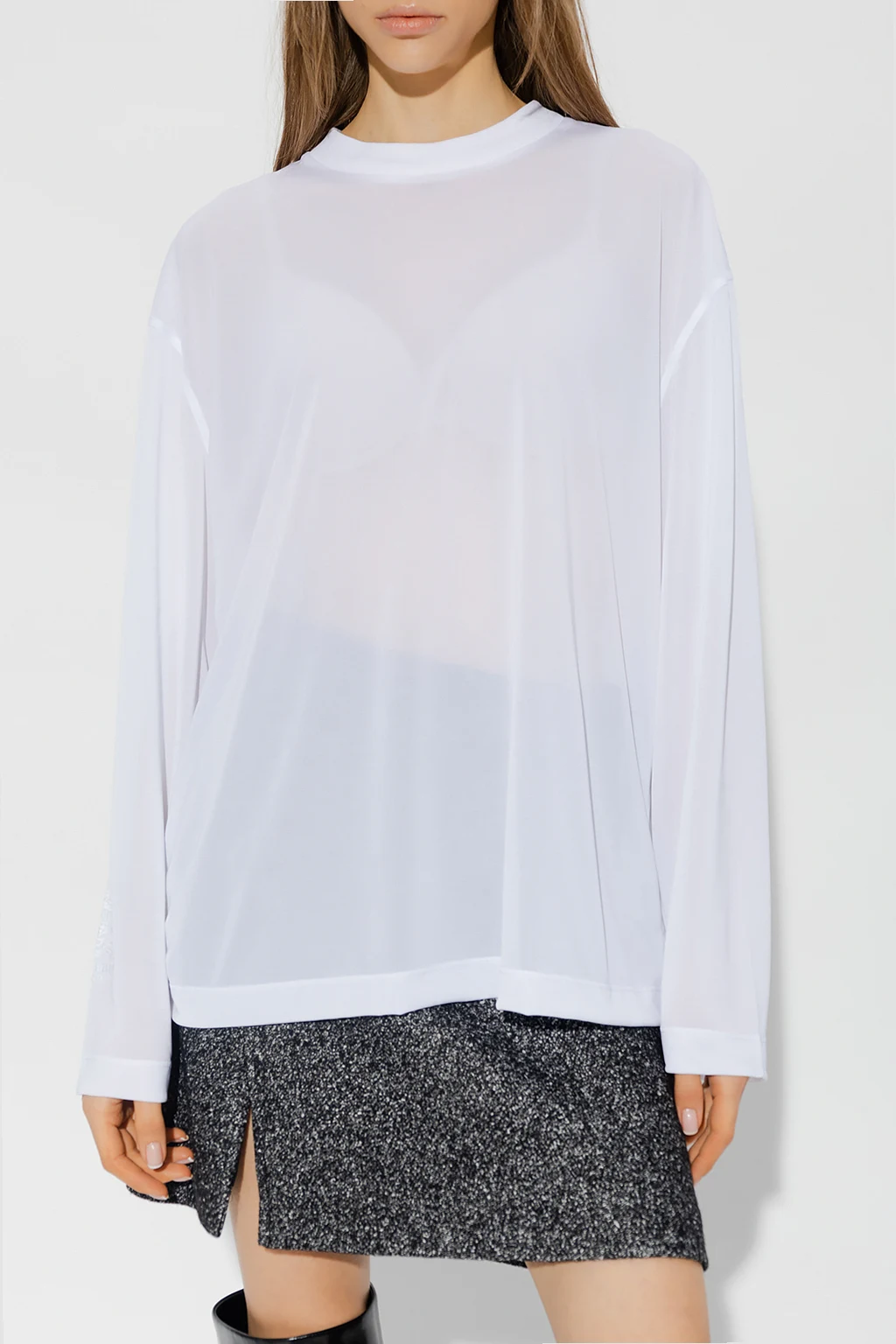 White ‘W. Spectre LS’ sheer top from Holzweiler. This loose-fitting design features a ribbed round neck and long sleeves embroidered with a logo pattern.