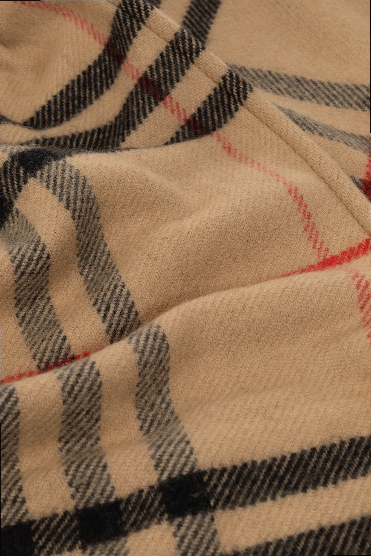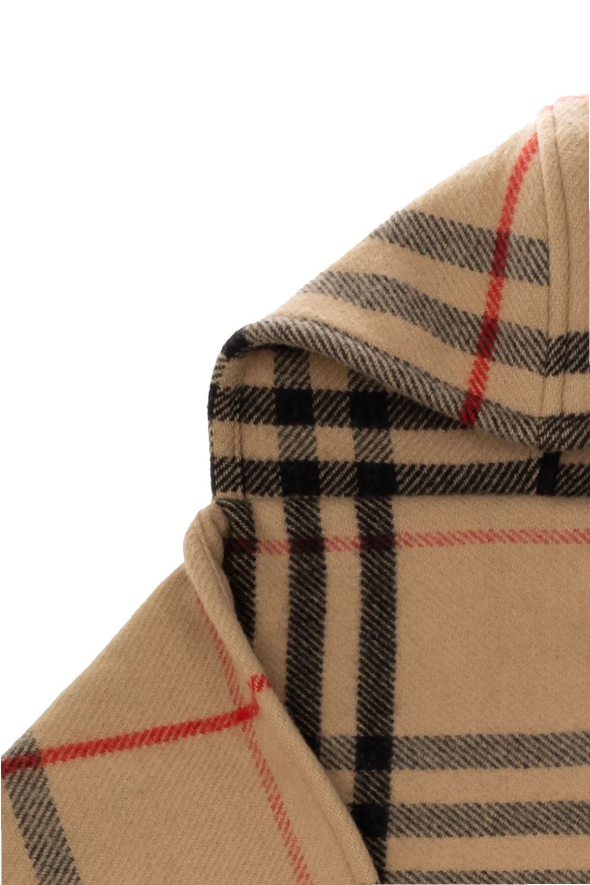 Beige hooded scarf from Burberry. Made from a wool and cashmere blend, this design features the brand’s iconic multicolored check and fringes.