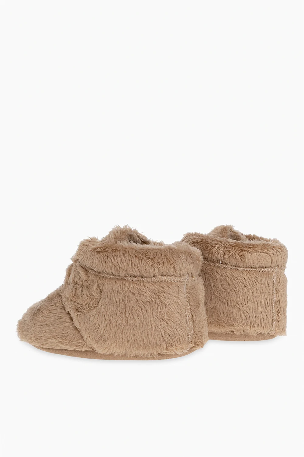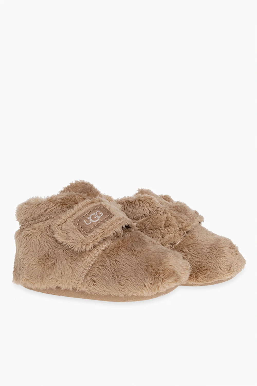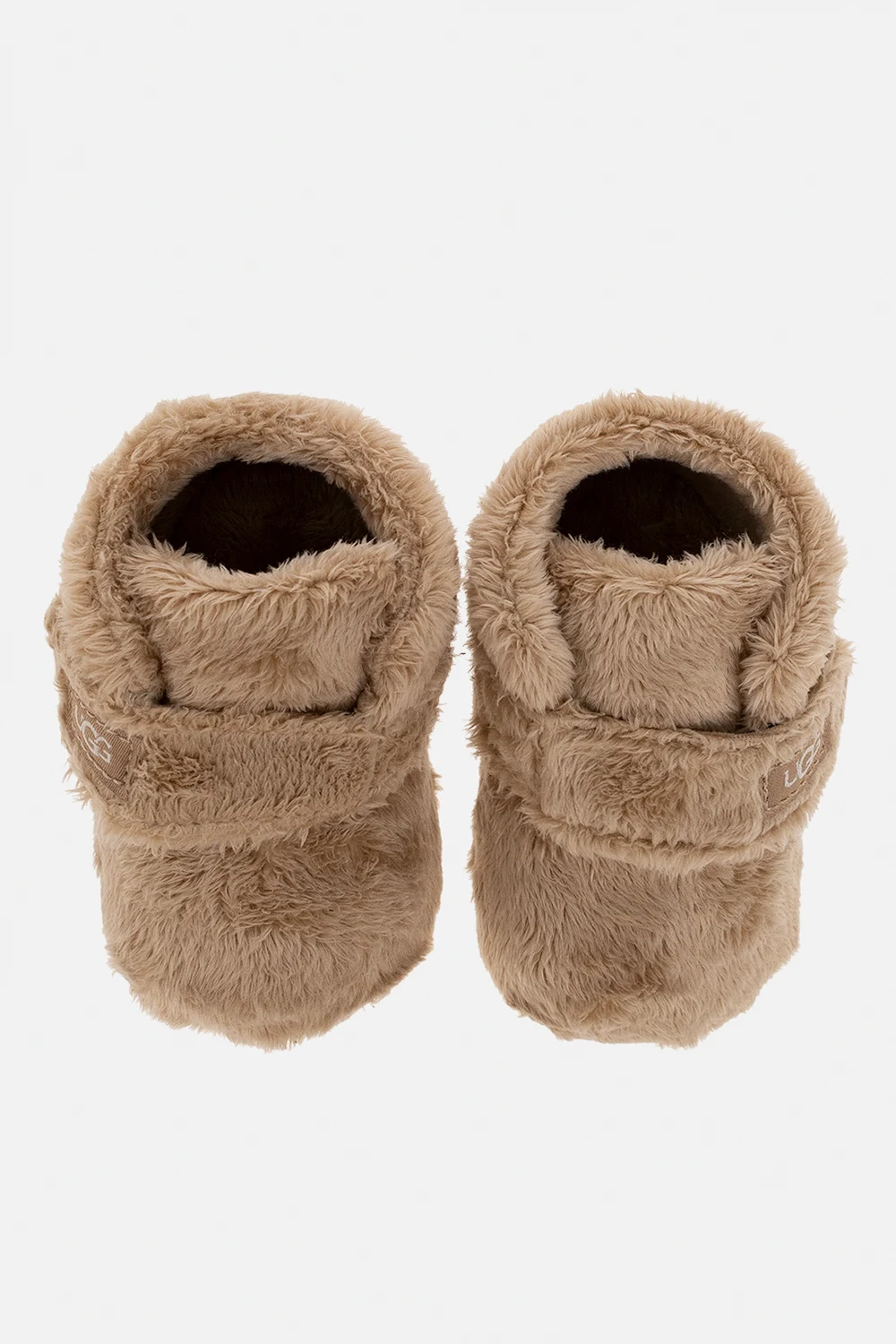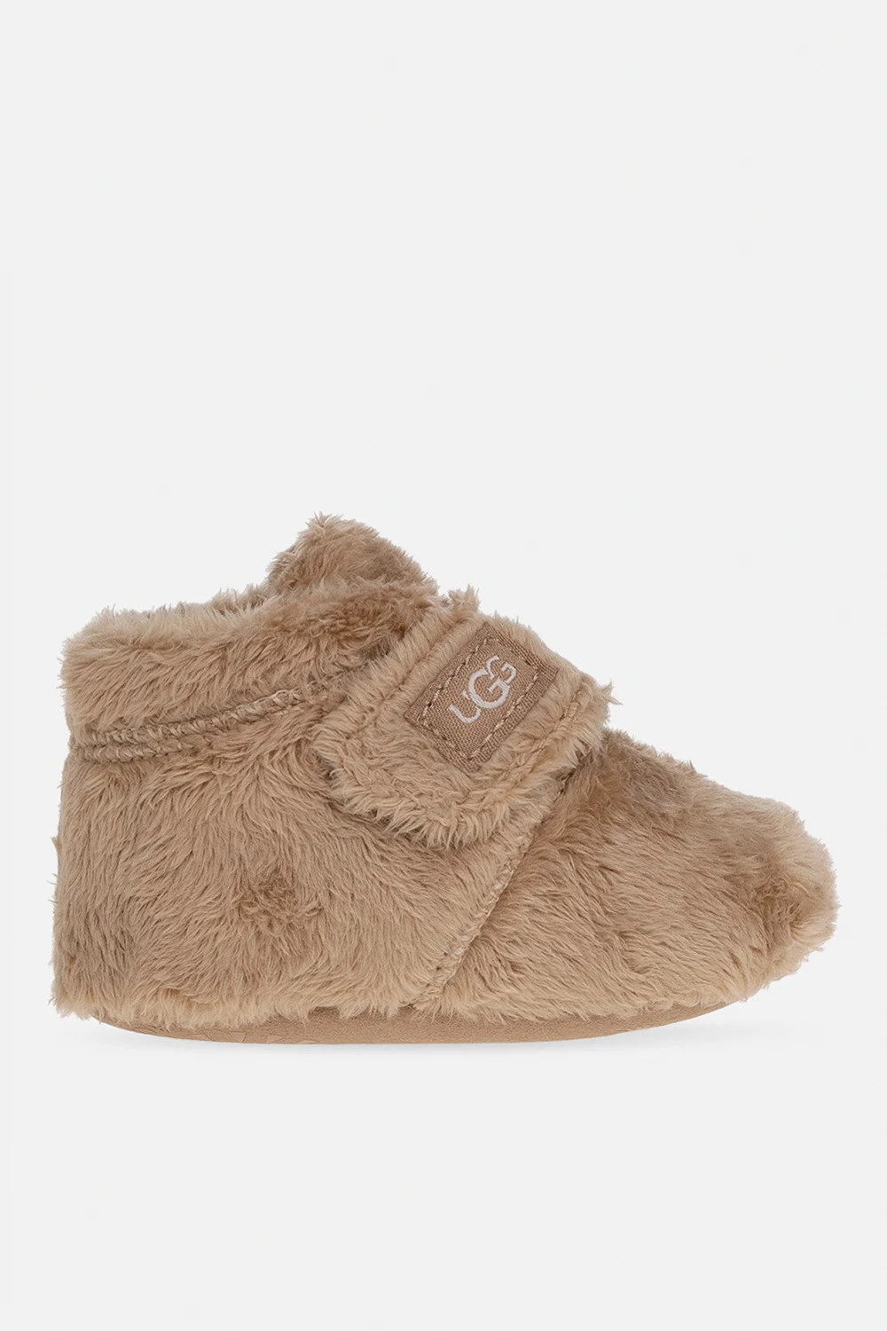 Beige shoes, beanie & mittens set from UGG Kids. Made of furry material. The shoes have a velcro closure, the beanie and mittens feature a logo patch.