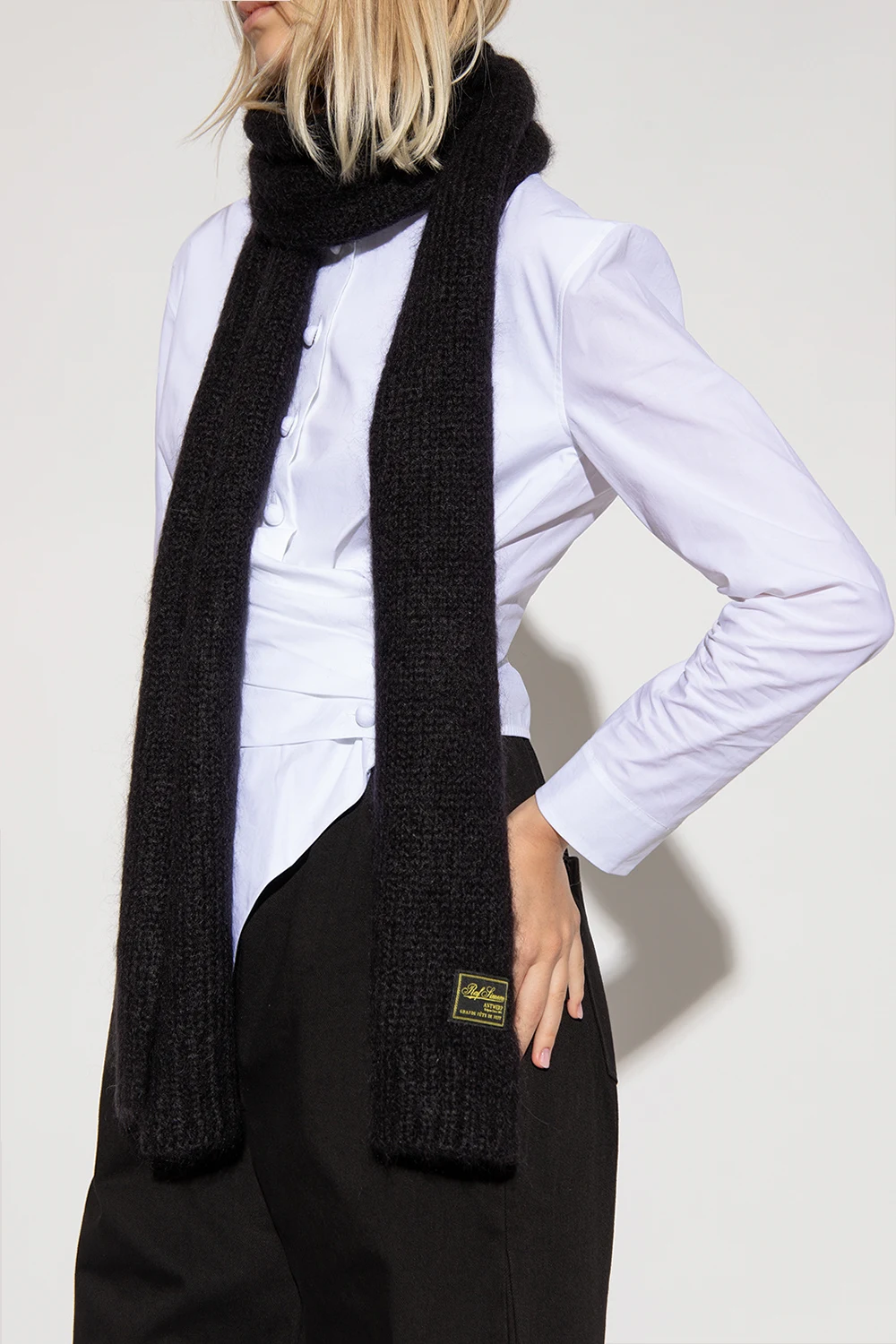 Black scarf with a logo patch from Raf Simons. Made of a mohair and wool blend.