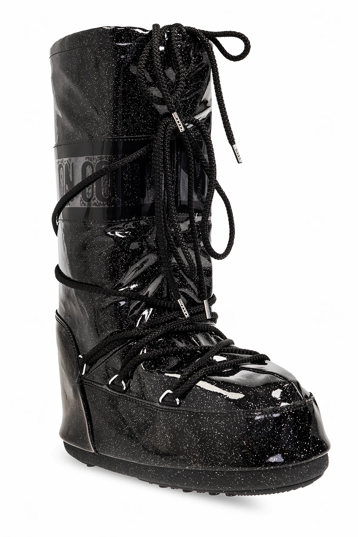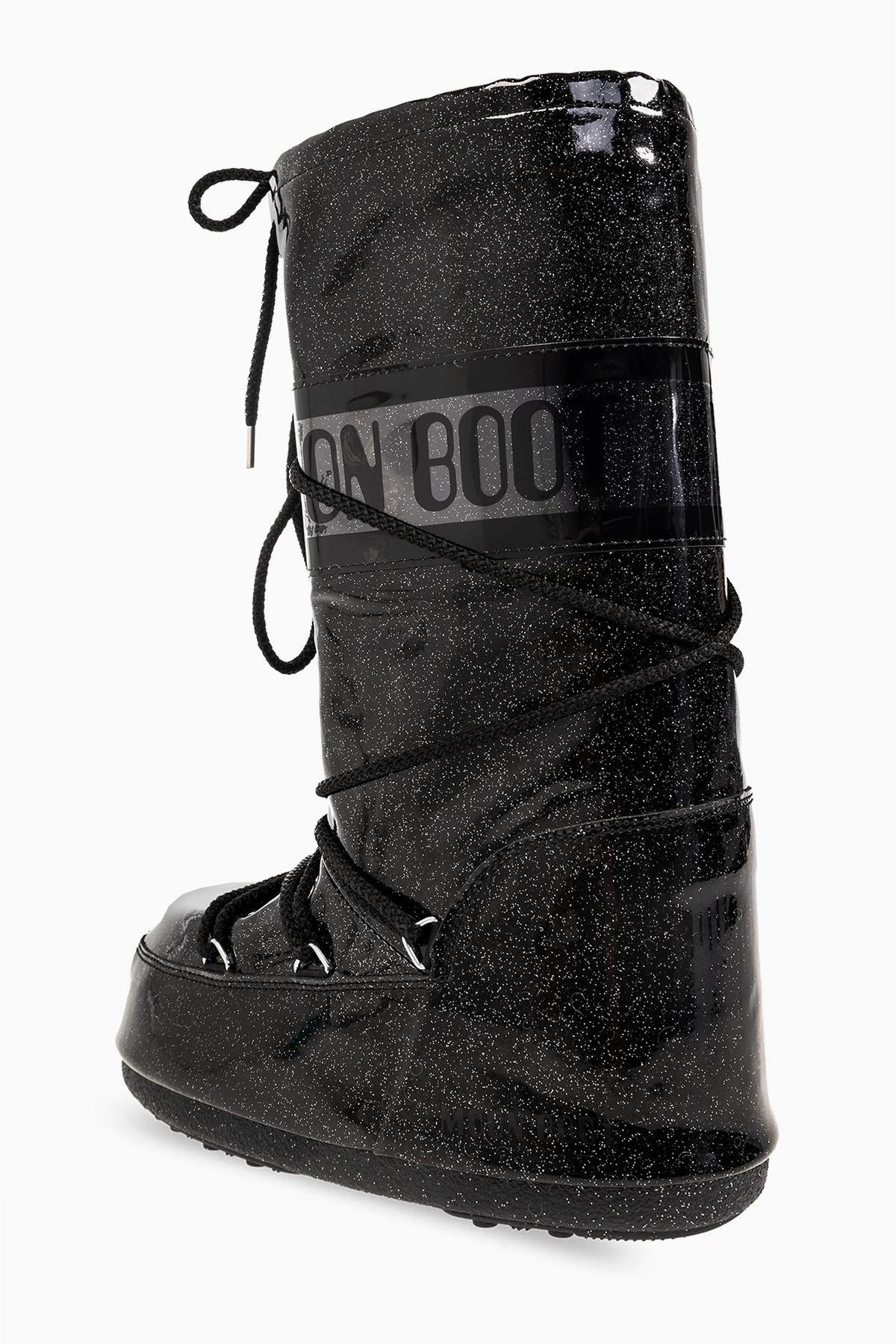 Black ‘Icon Glitter’ snow boots from Moon Boot. Spruced up with glitter, this waterproof model sits on a black tread rubber sole with suction cups to ensure superb grip on any surface and showcases the brand's logo, silver-tone metal hardware, elastic crisscross tube laces (do not use them to pull off shoes) and an elasticized hem.