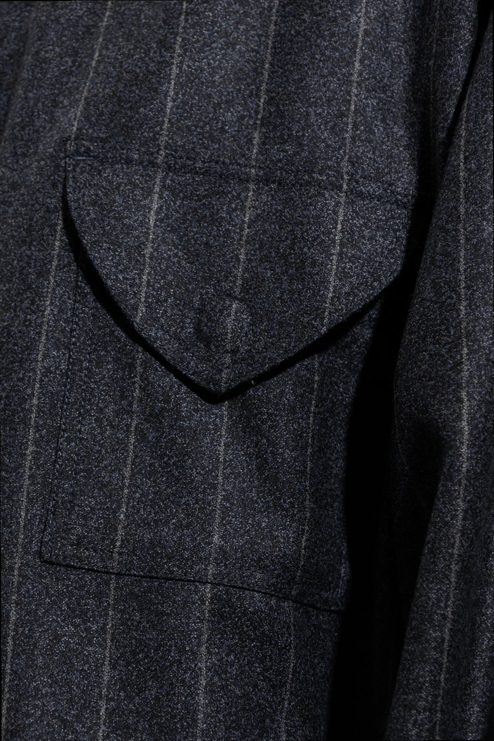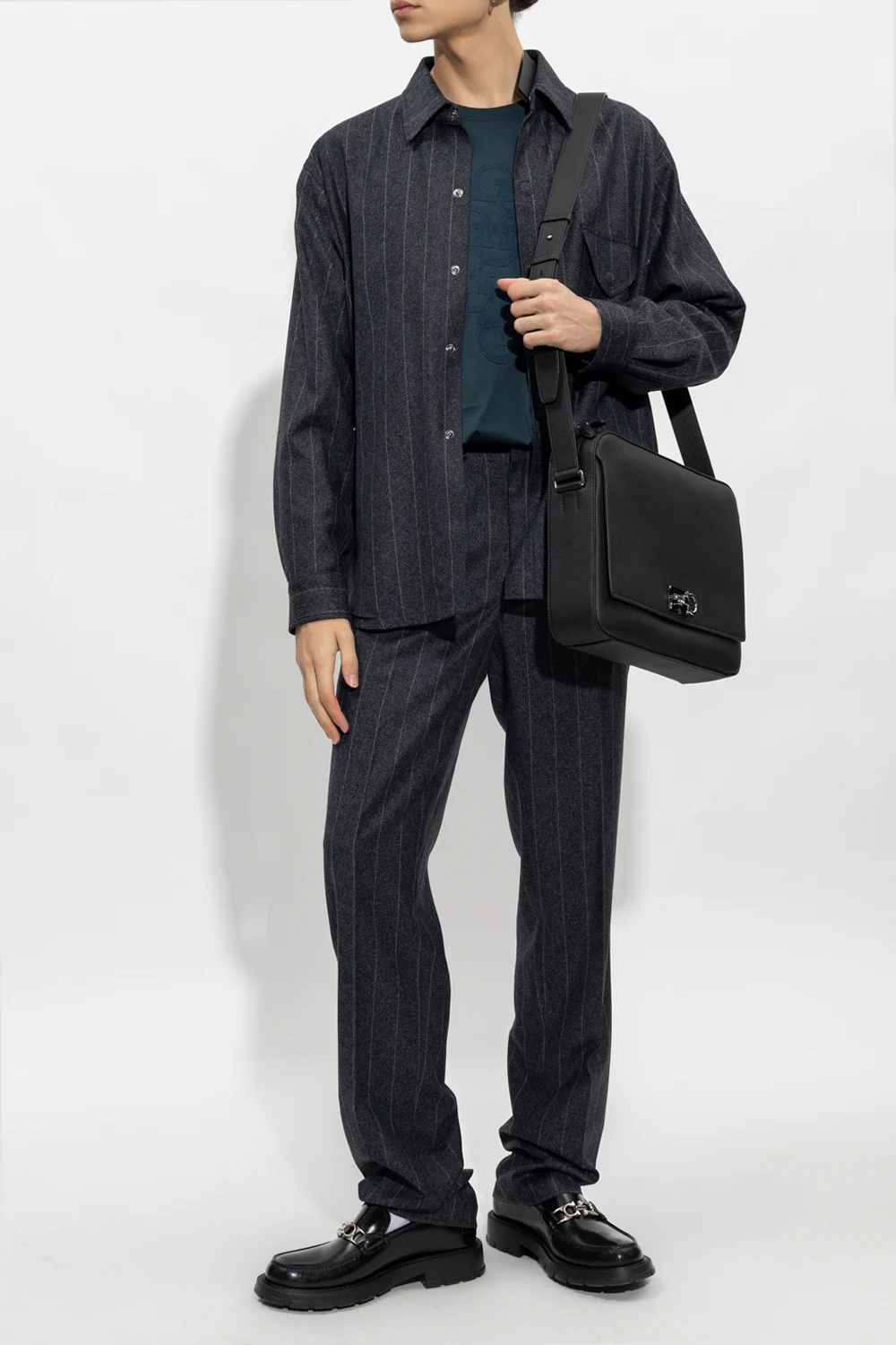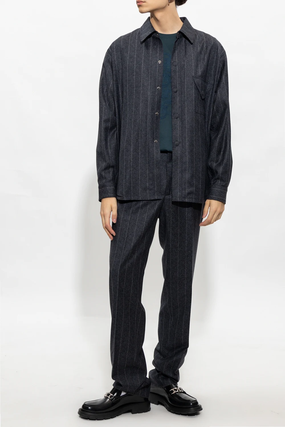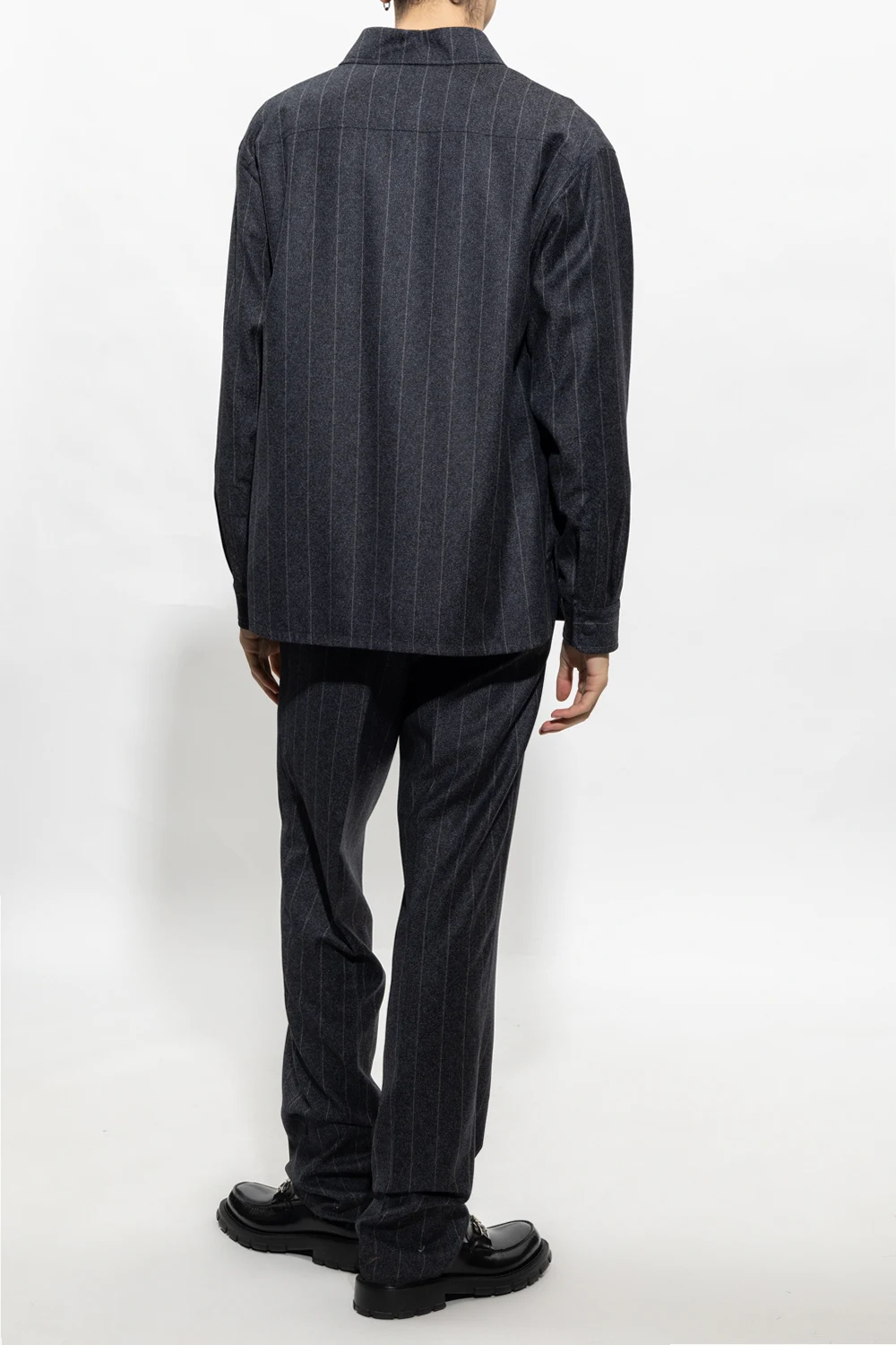 Navy set shirt and trousers set with a grey pinstripe pattern from Giorgio Armani. The shirt features snap buttons with a concealed placket, snap-fastened flap pocket, side vents and long sleeves with snap-fastened cuffs. The trousers feature a zip, hook and button, two slip pockets, one buttoned flap pocket, slightly tapered legs with pleats and two buttoned back pockets.