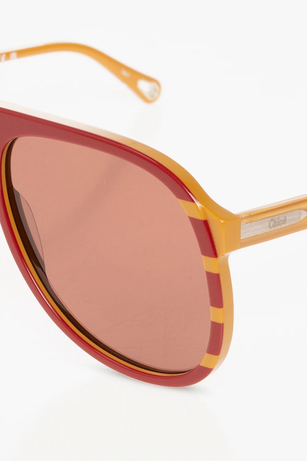 Red and yellow sunglasses from Chloé. This pair has aviator sunglasses features a decorative eyelet and brown lenses with 100% UV protection. Comes with a case.