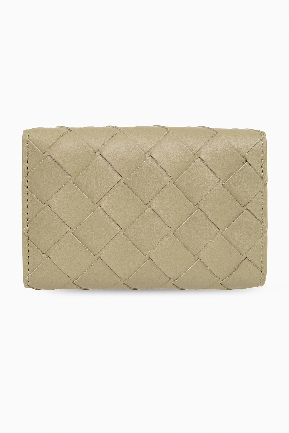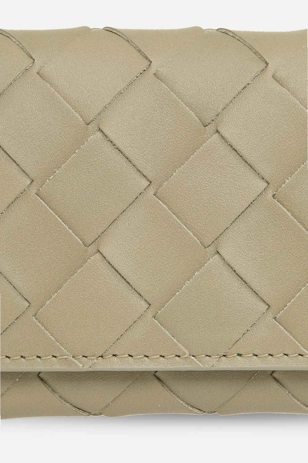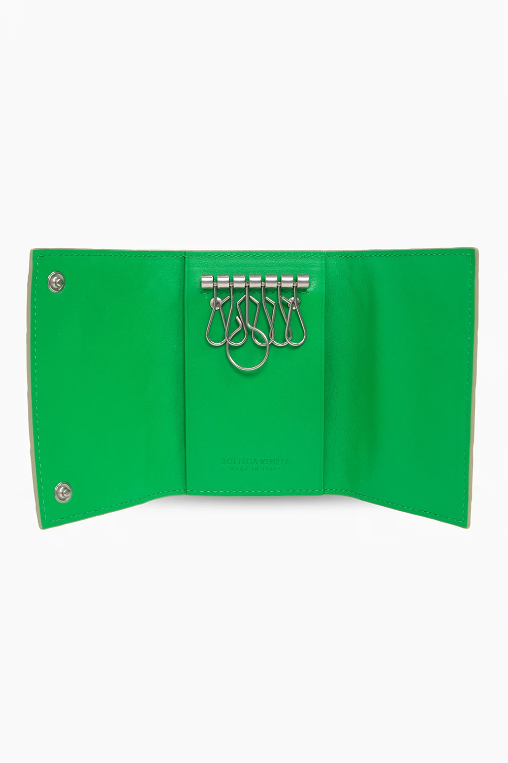 Greenish grey key holder from Bottega Veneta. Crafted from calf leather with the brand's iconic Intrecciato weave, this design secures with snaps and features one slip pocket and six key hooks inside.
