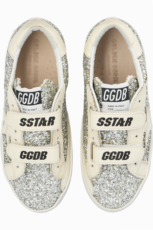 Cream ‘Old School’ sneakers from Golden Goose Kids. Made of leather and spruced up with silver-tone glitter, this model sits on a black and cream rubber sole and showcases a printed logo, a logo patch, a signature star patch, distressed details and velcro closures.