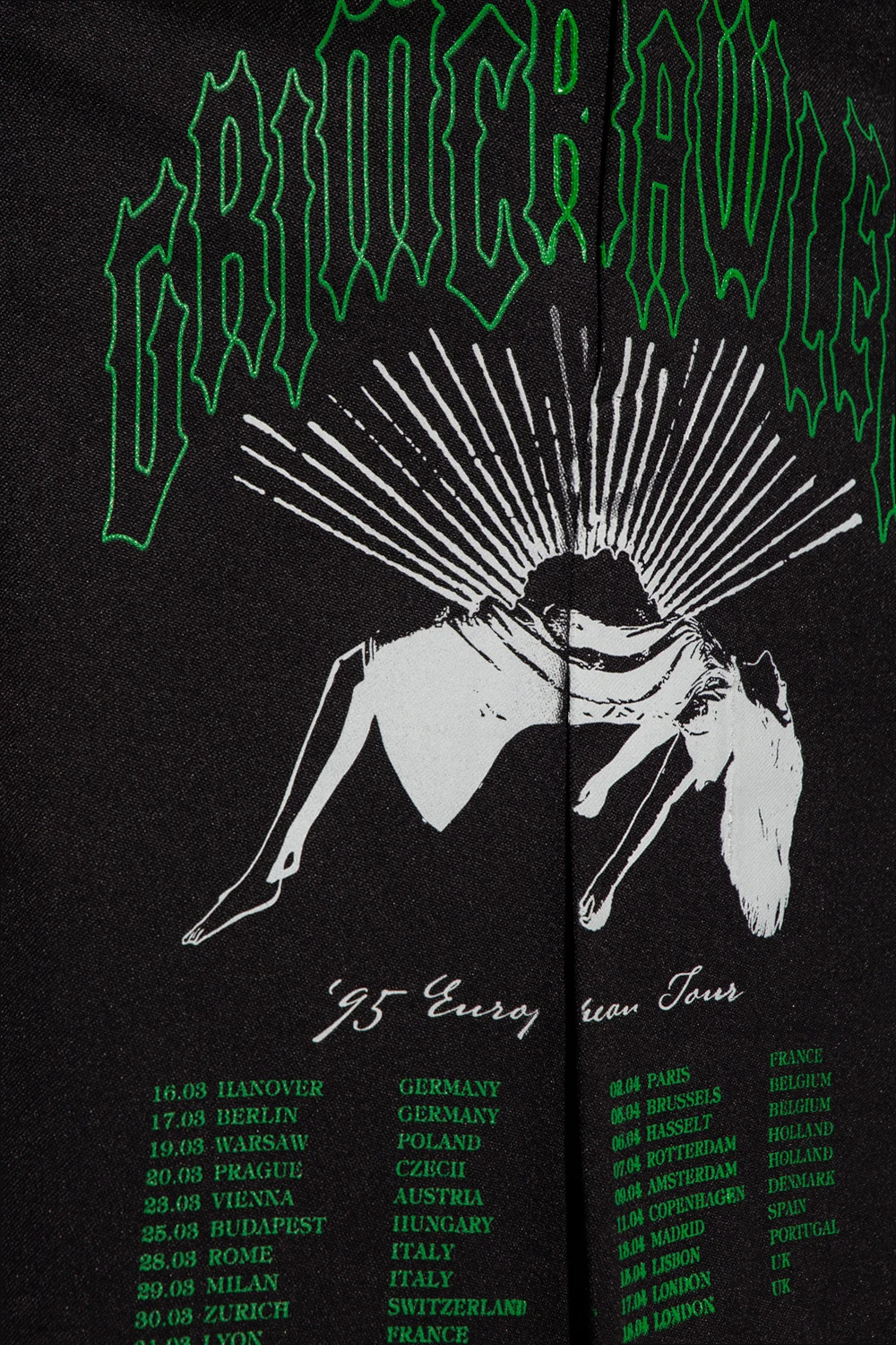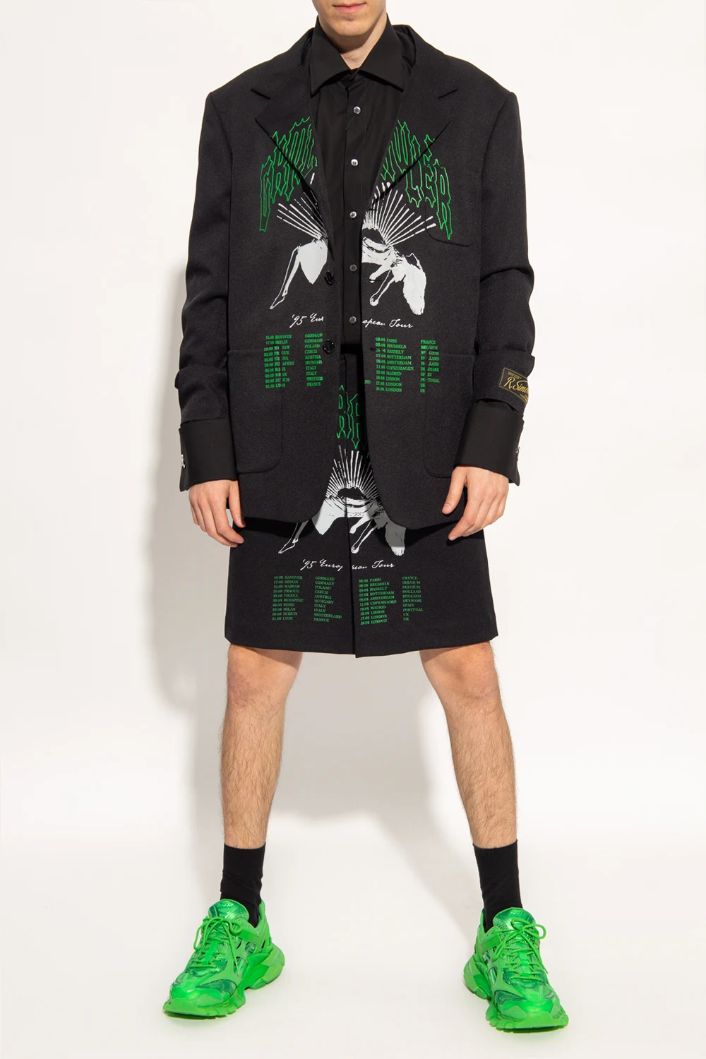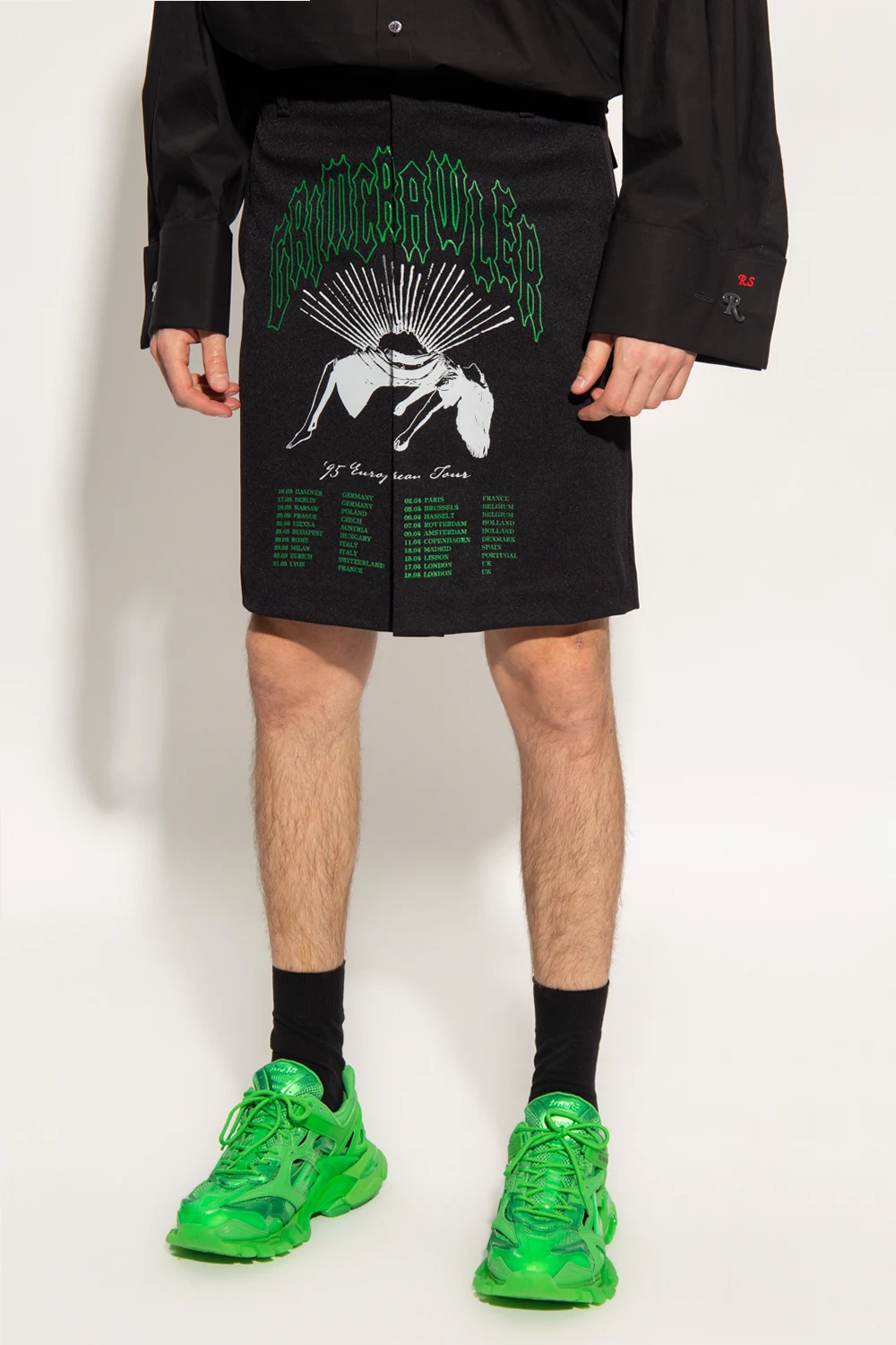 Short, black skirt from Raf Simons. Fastened with a zip and button, this design features a green and light grey print, single pleat on the front and back, two front pockets and two buttoned back pockets.