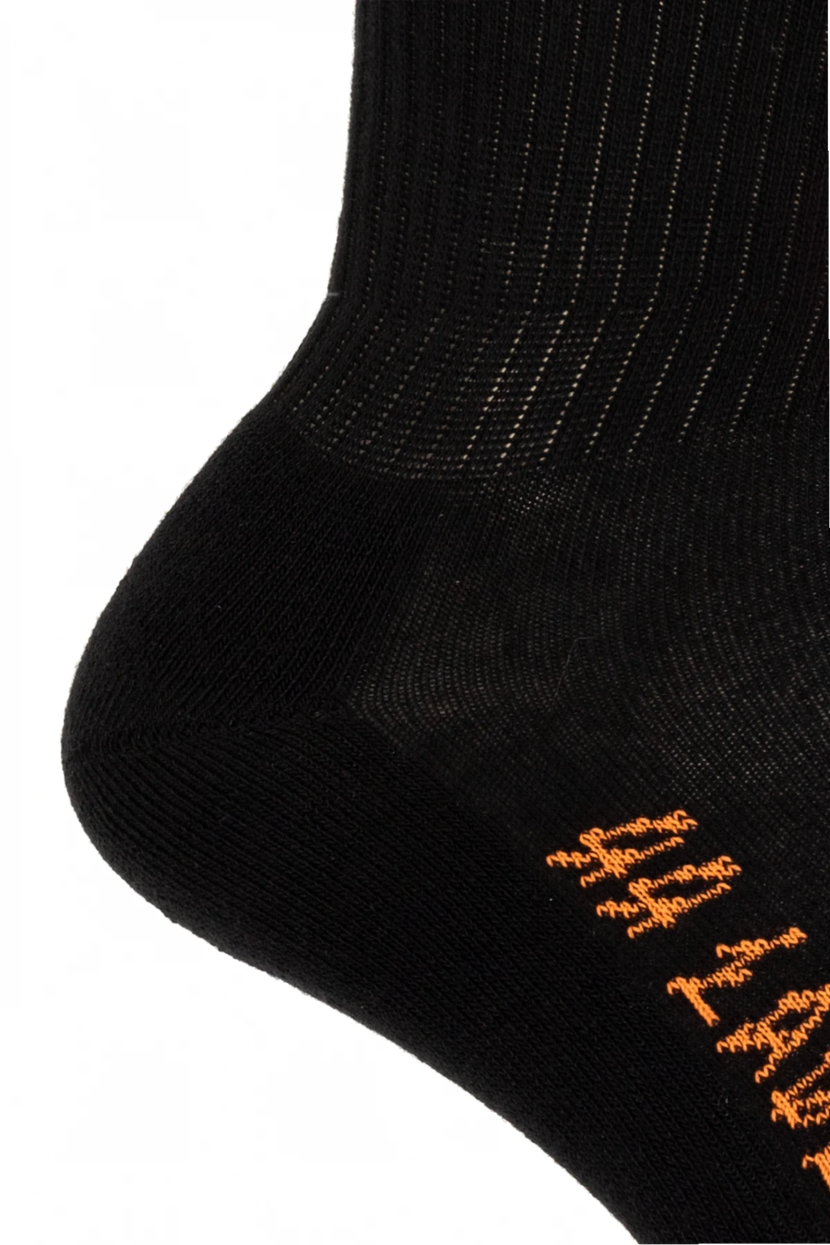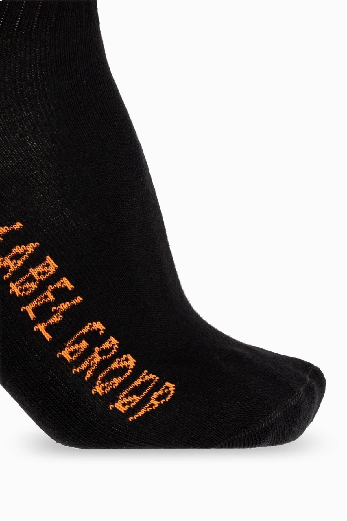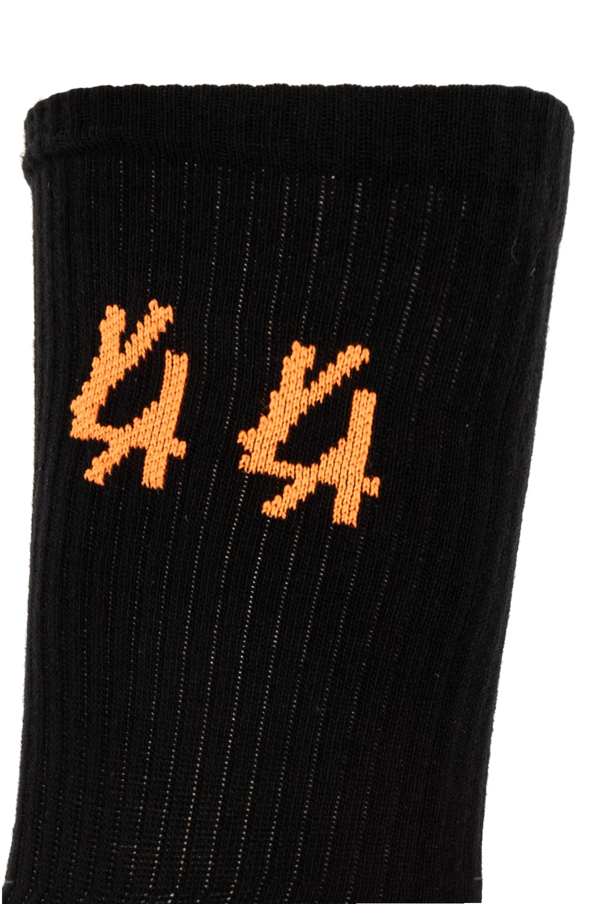 Black socks from 44 Label Group. Crafted from a cotton blend, this pair features orange graphic embroidery with the brand's logo and ribbed cuffs.