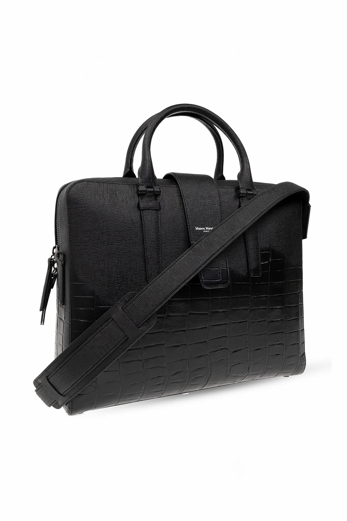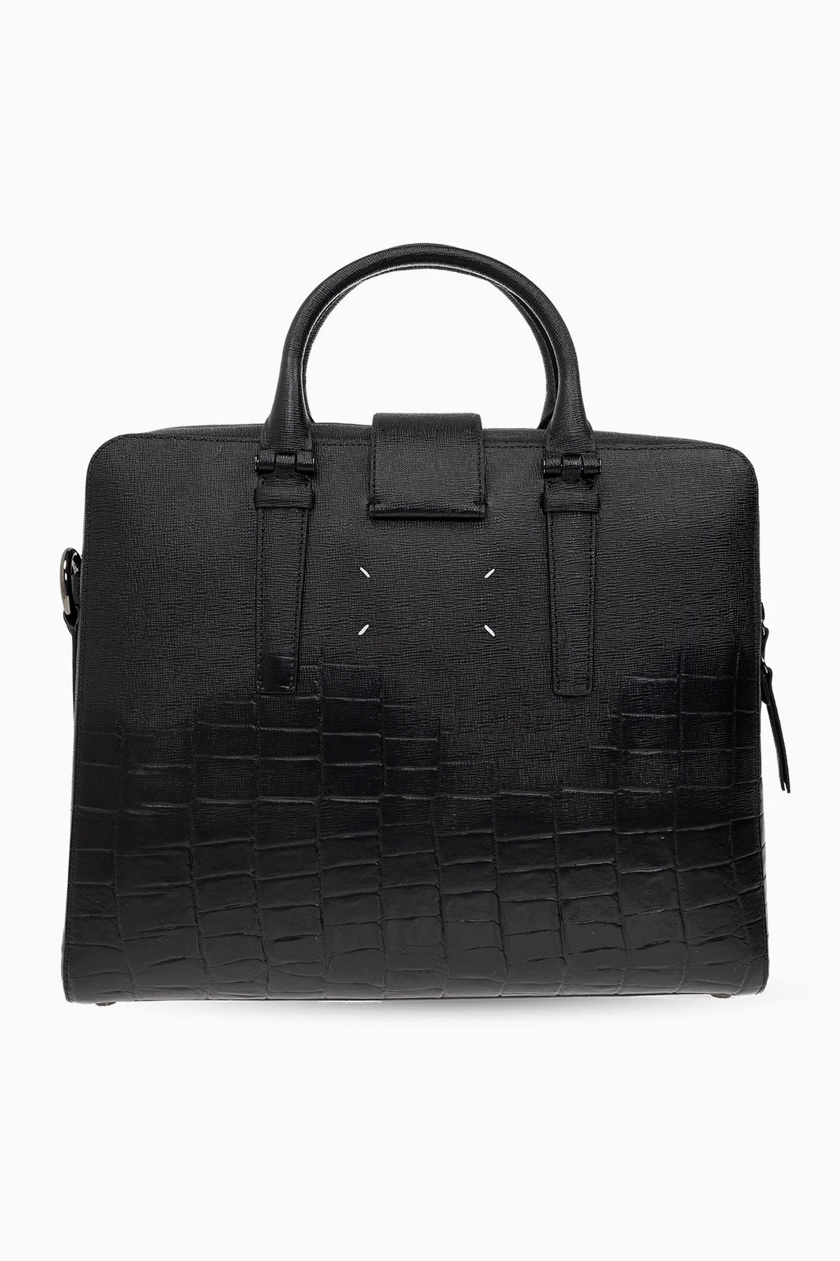 Black briefcase from Maison Margiela. Made of leather, this item features a zip and snap fastenings, an embossed logo, the brand’s signature stitches, two half-round handles, black metal hardware and one internal compartment with eight slip pockets and one zip pocket.