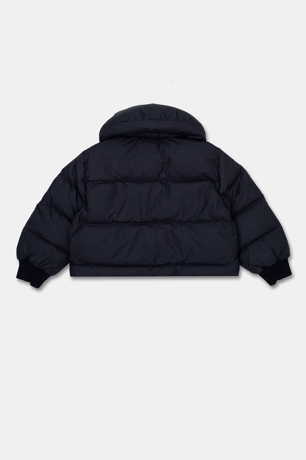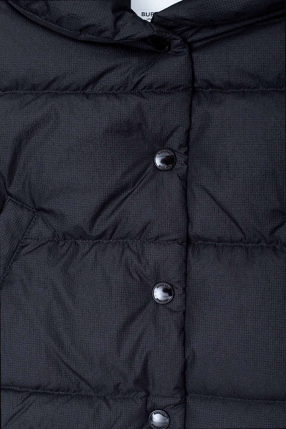 Black ‘Kacy’ quilted jacket from Burberry Kids. Fastened with snaps, this design features a patch with the brand’s signature teddy bear motif in white and red, logo detail, collar, two snap-fastened pockets, drawstring hood and long sleeves with ribbed cuffs.