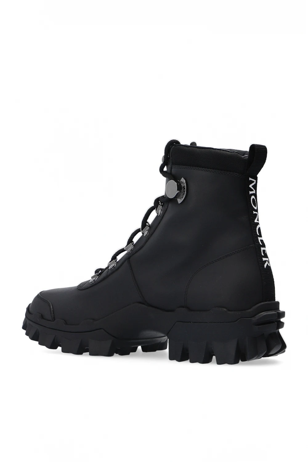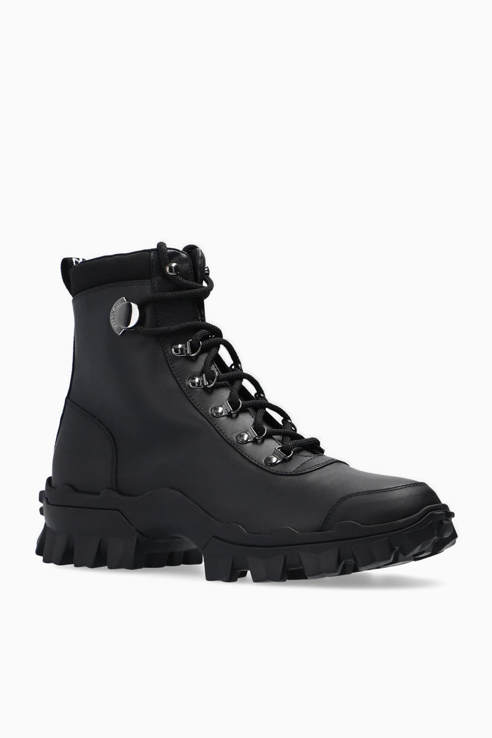 Black ‘Helis’ ankle boots from Moncler. Crafted from leather, this lace-up design features a grosgrain pull tab with a logo print and a black rubber sole.