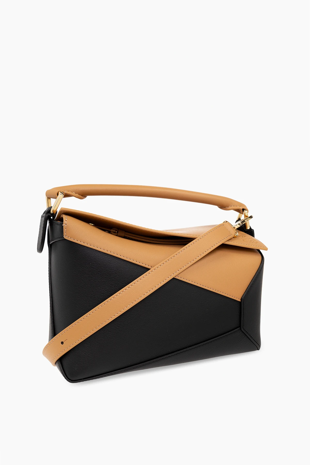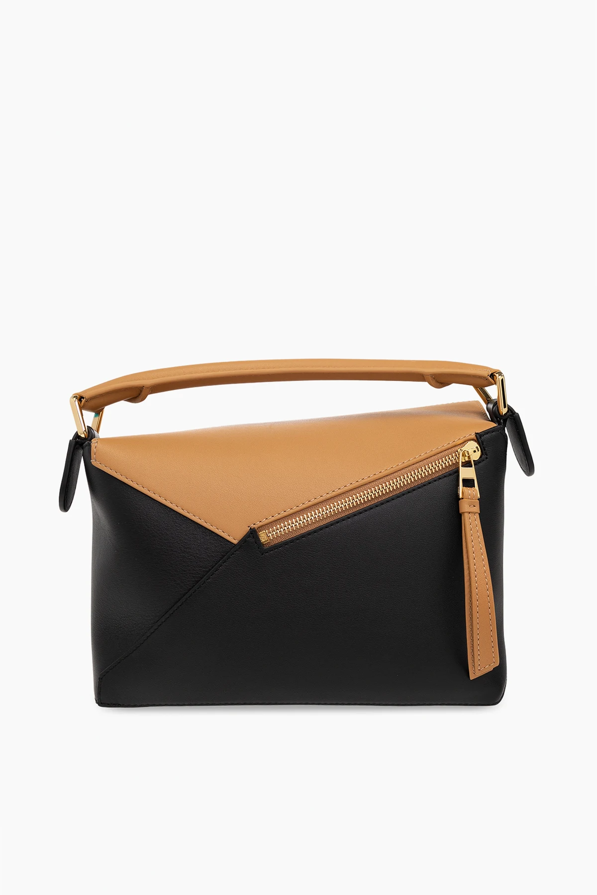 Black and brown 'Puzzle Small' shoulder bag from Loewe. Made from calf leather, this design fastens with a zip and showcases an embossed monogram pattern on the flap. It is complete with a detachable and adjustable strap, one half-round handle, gold-tone metal hardware and one internal compartment with a slip pocket.