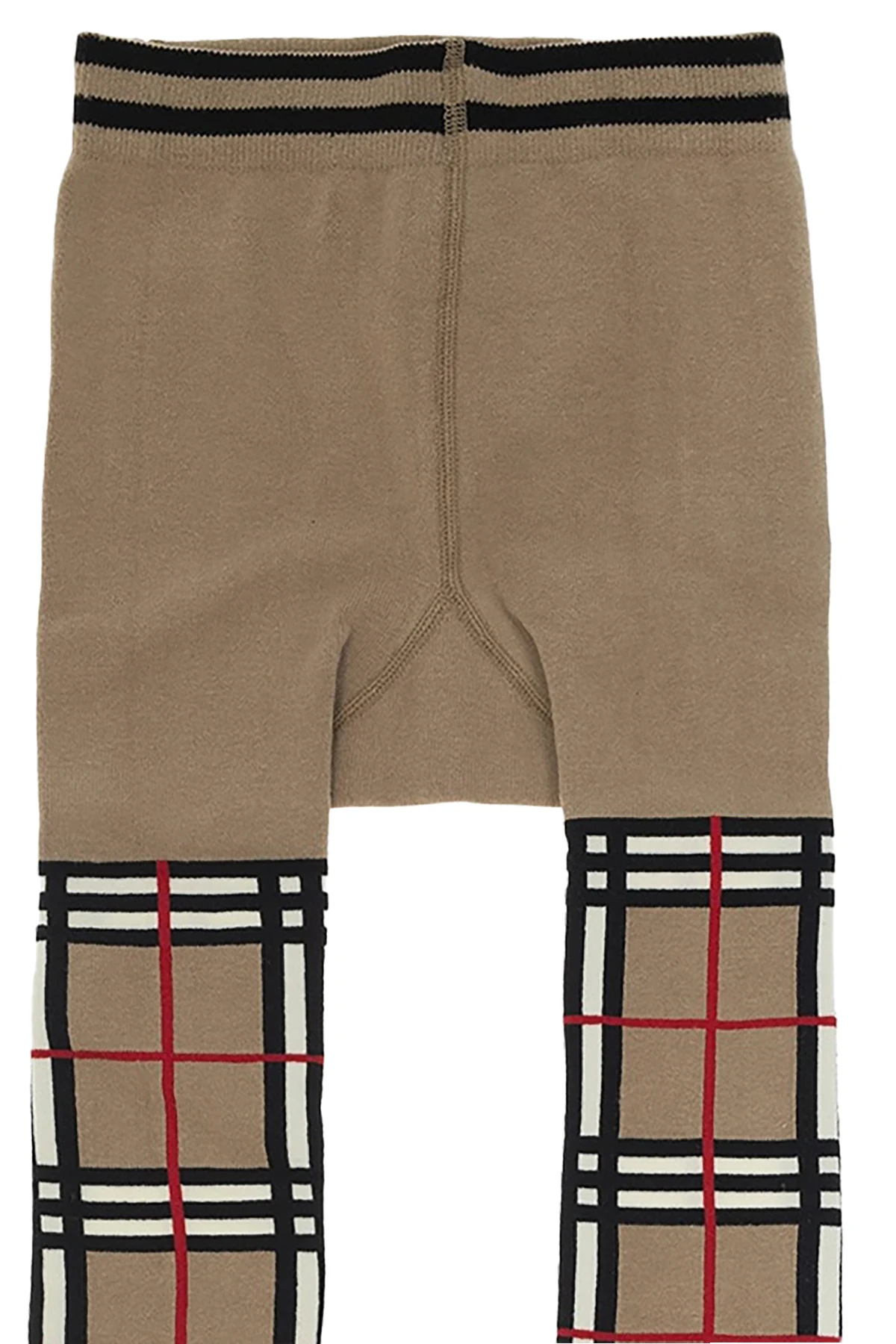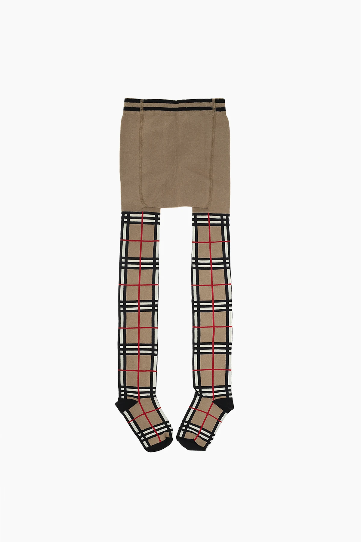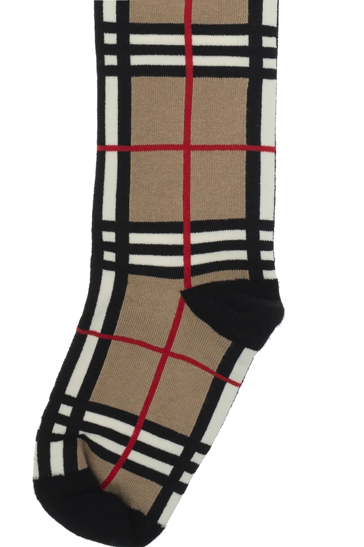Beige tights from Burberry Kids. Made of a stretch cotton blend, they feature the brand's signature check motif in beige, black and red,
