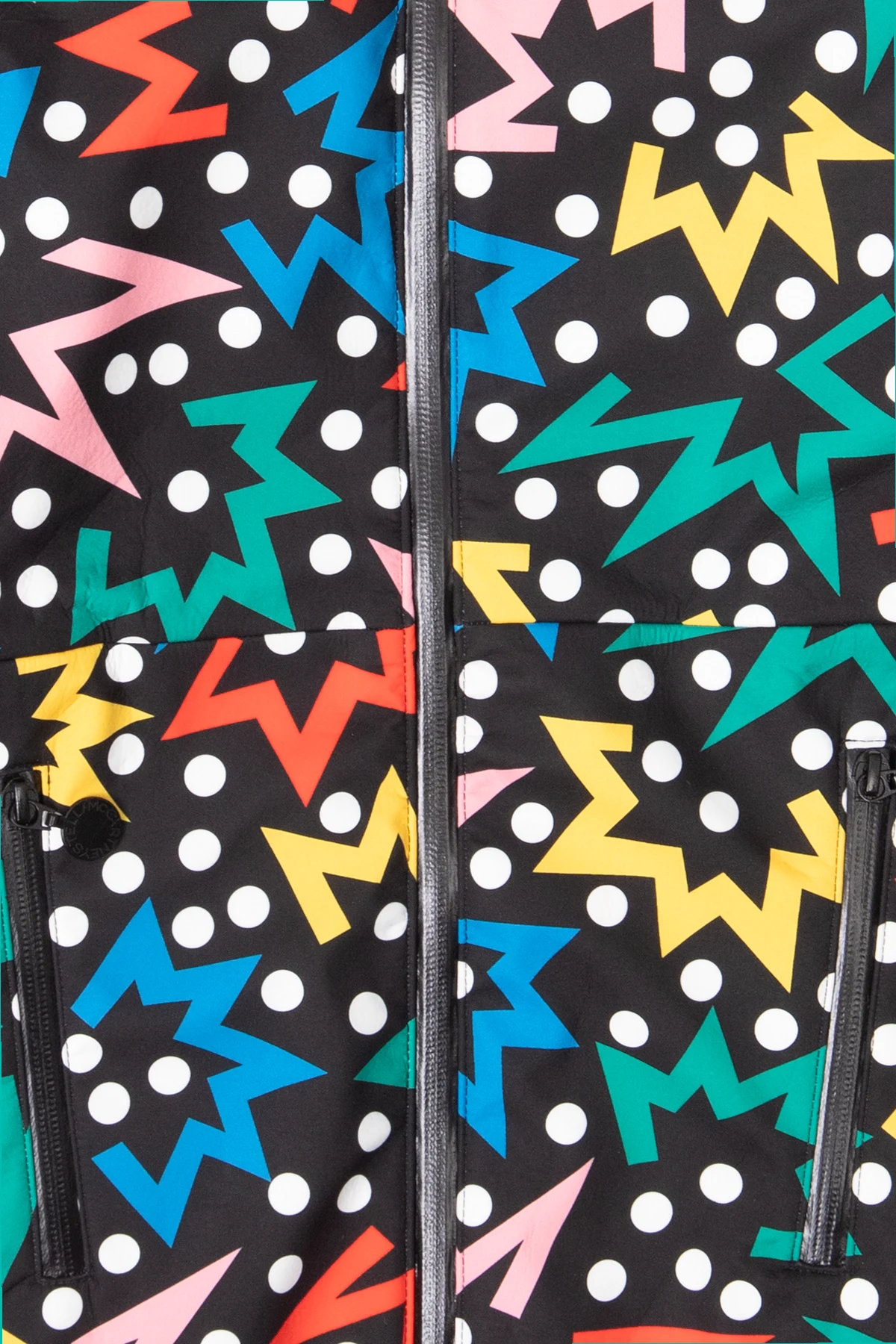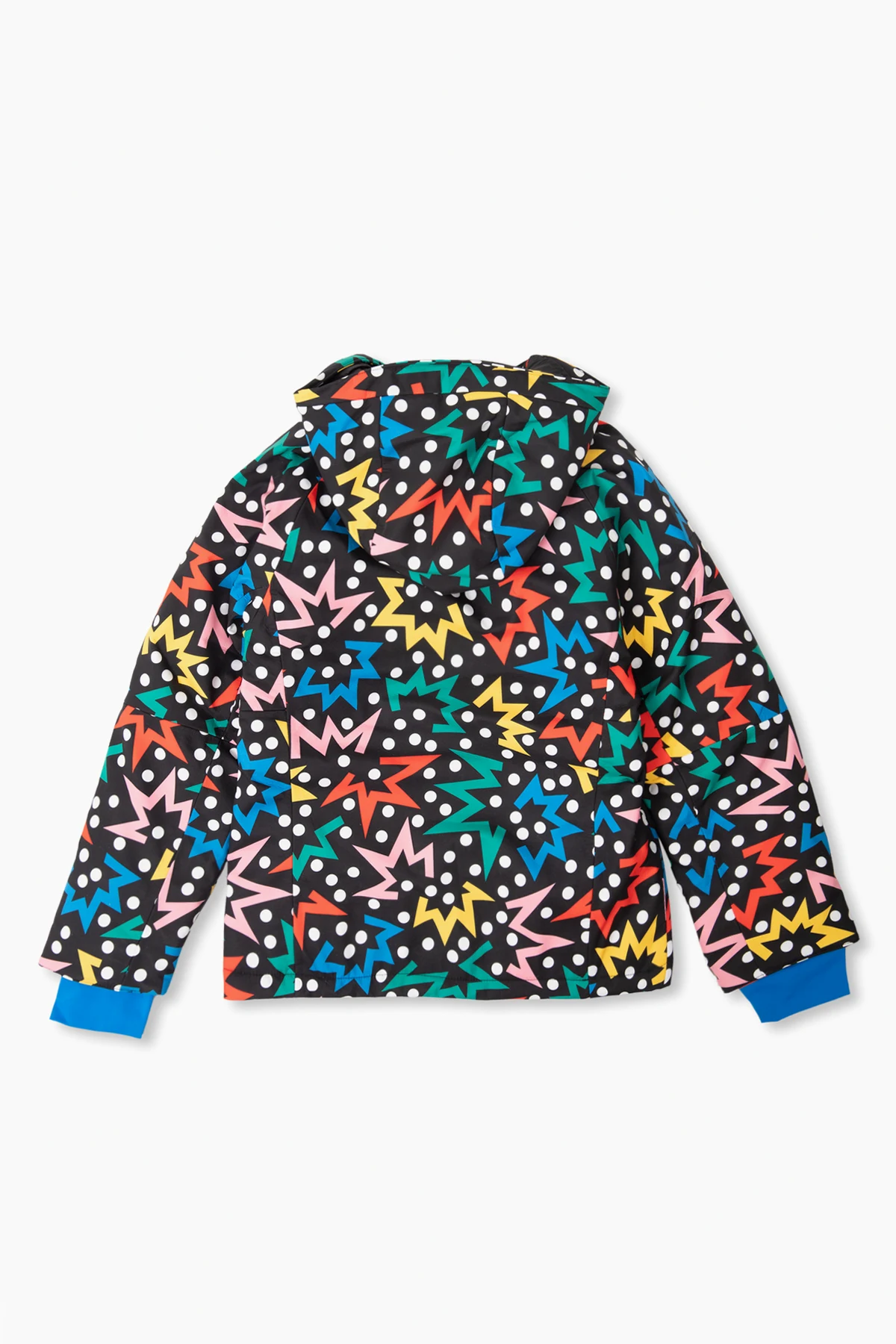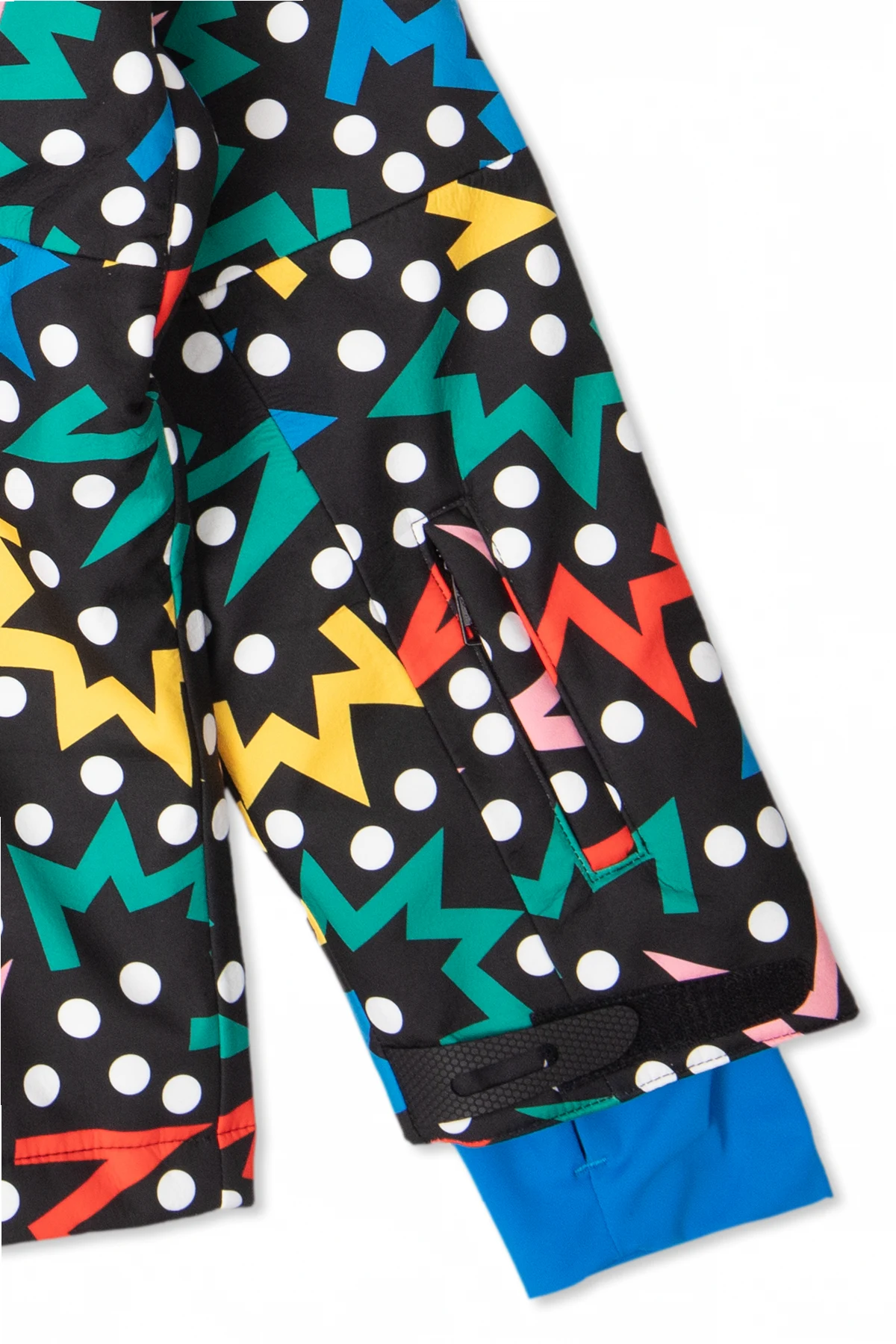 Black ski jacket from Stella McCartney Kids. Embellished with a colourful pattern with dots and stars, this style fastens with a zip and features a detachable hood, two zip pockets, mesh vents on the sides, long sleeves with a zip pocket, velcro cuffs and elastic finger guards as well as an interior snow belt with an elastic trim and snaps.