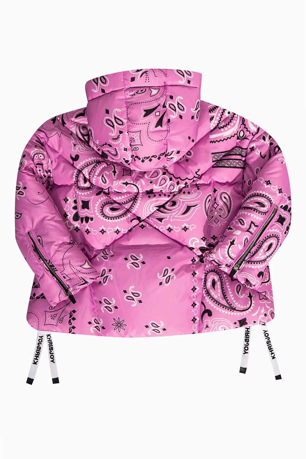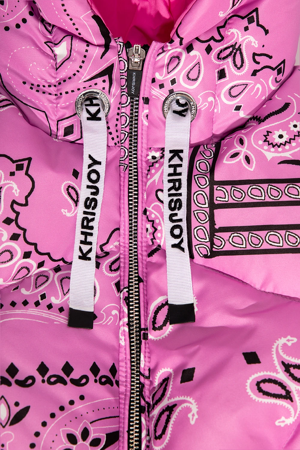 Light purple hooded quilted down jacket from Khrisjoy Kids. Fastened with a zip, this garment is complete with a white and black pattern, two slip pockets, zipped cuffs, silver-tone metal hardware as well as white drawstrings with logo details at the hood and hem.
